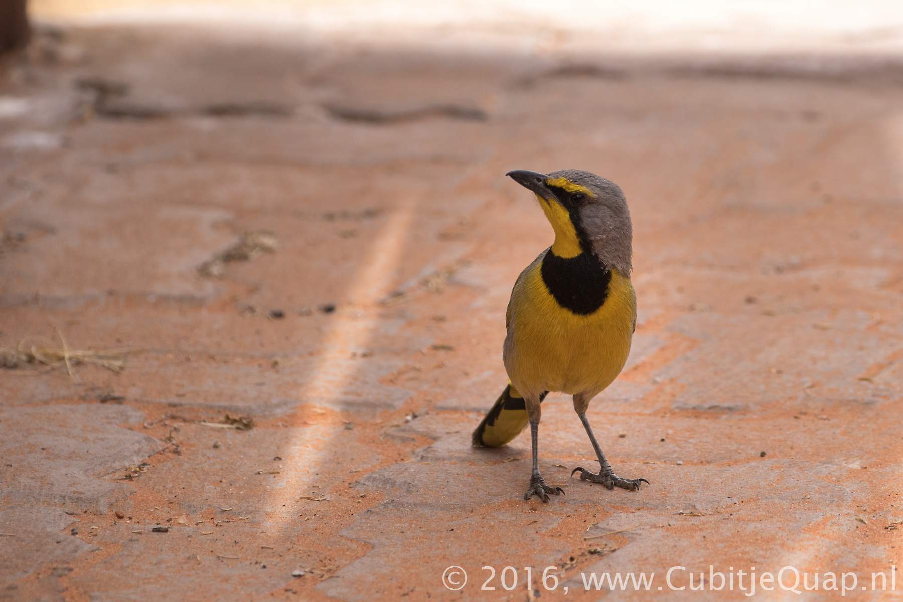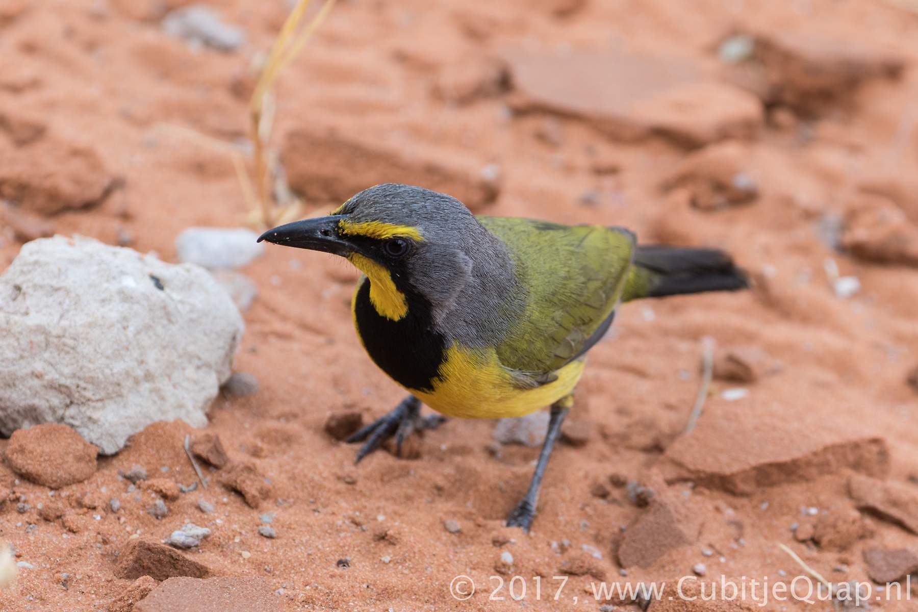 The bright lemon-yellow underparts and broad, black breast band are diagnostic. The vivid yellow tip to the dark green tail is conspicuous in flight.