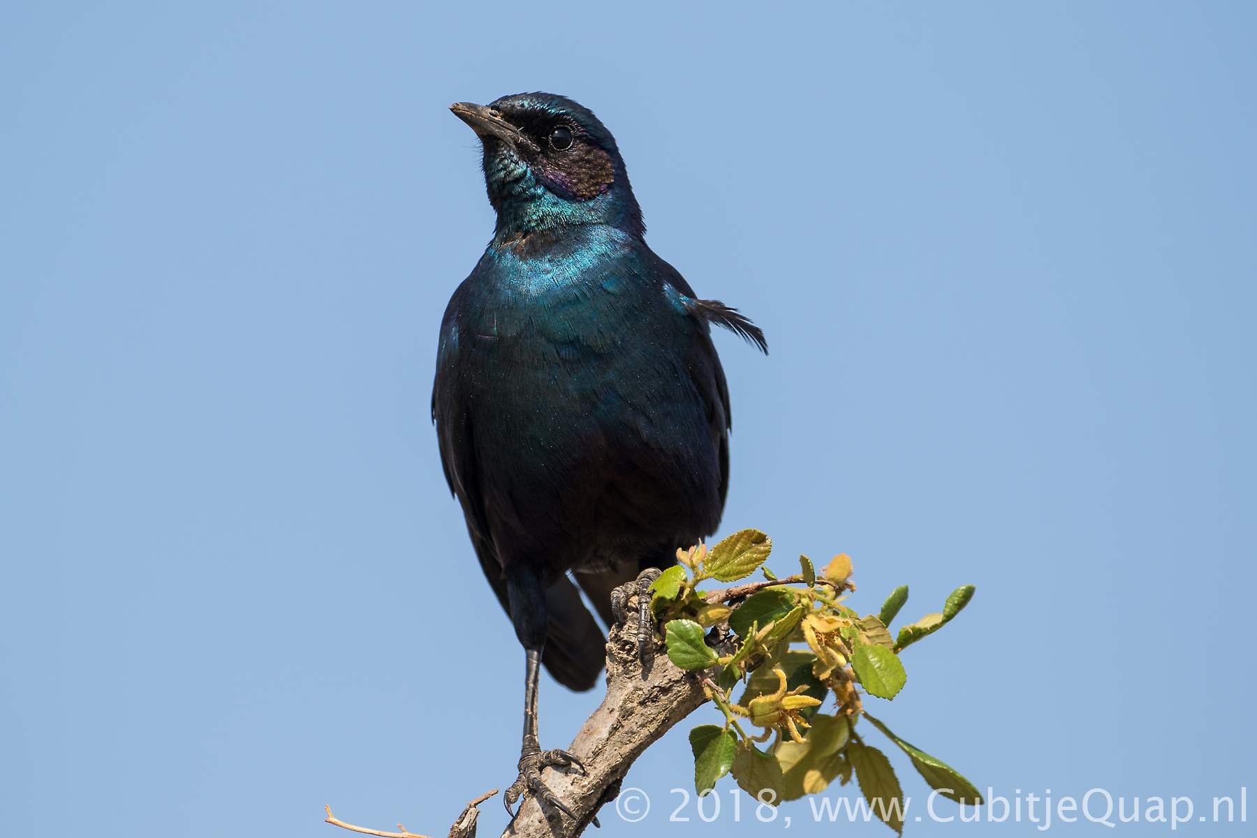 Larger and more heavily built than Meves's starling. This species has broader, more rounded wings and a shorter, broader tail, although the tail is proportionally longer than that of other, smaller, glossy starlings.