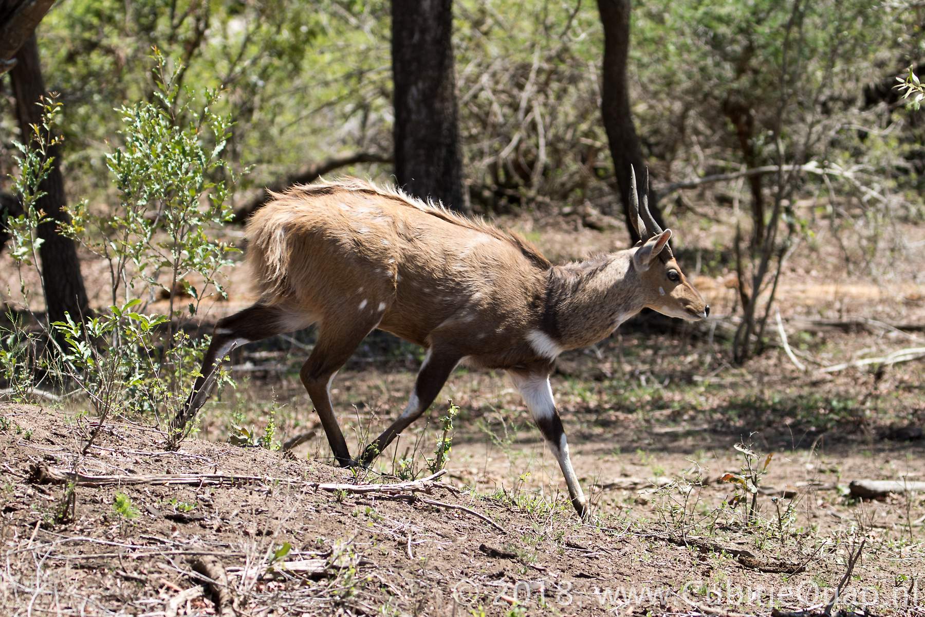 Small bright-chestnut to dark-brown antilope; those in the north of the subregion more brightly coloured and clearly marked than those from south. Nevertheless, considerable variation in colour and markings even within one population. Patterns of white lines and spots are present on the flanks to a greater or lesser extent, more so in the north. No white band or chevron between the legs as in sitatunga, nyala and kudu, but there are two white patches on throat. Crest of longish hair down back of ram but only raised when it displays or threatens. Bushy tail white below and dark brown above. Only ram has horns; they project backwards with a single spiral and have a prominent ridge along edge. Can be extremely sharp poited in young rams.