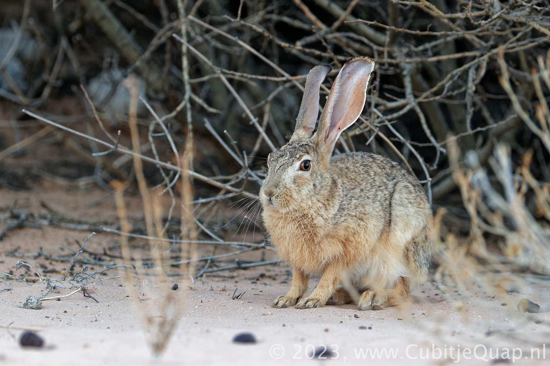 Considerable variety in size from area to area, generally smaller than scrub hare. Long ears, hindlegs are much longer than forelegs. Tail short and fluffy.