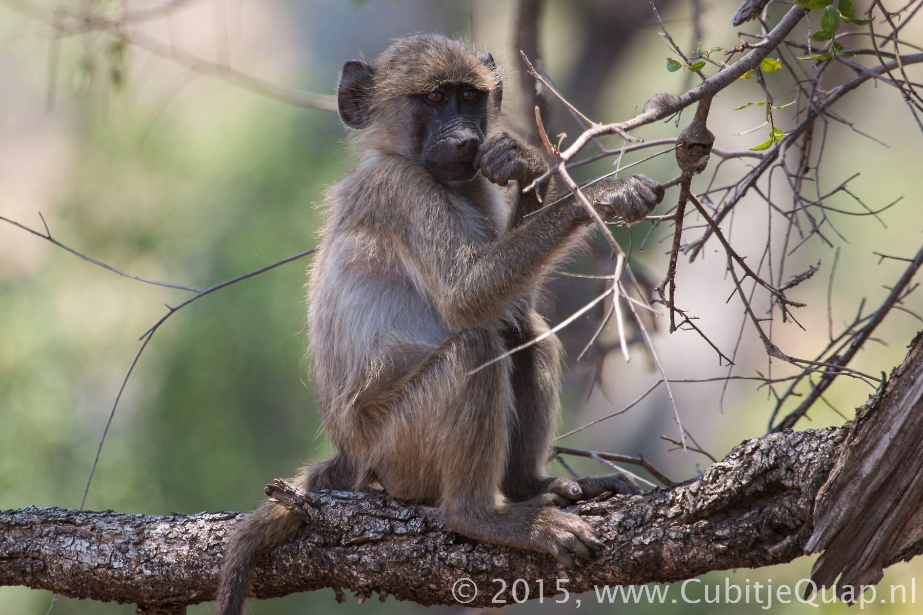 A highly gregarious and social species that lives in troops of 15 to sometimes 100 or more. Within a baboon troop all adult males are dominant over all females. The adult males have a strict rank order and only the dominant males mate with the oestrous or receptive females, although subordinate males do mate with young females and those that are not in oestrous. It is only in their fifth year that the males become dominant over the females. The dominant male determines when the troop will move. The females and infants remain closest to this male, with the non-breeding females staying close to the subordinate males. The youngsters and subadults move around the edges of the troop. Water sources are visited each day. Very vocal and the bark or 'bogom' of the adult male is a common day-time sound of the hills and savanna of southern Africa.