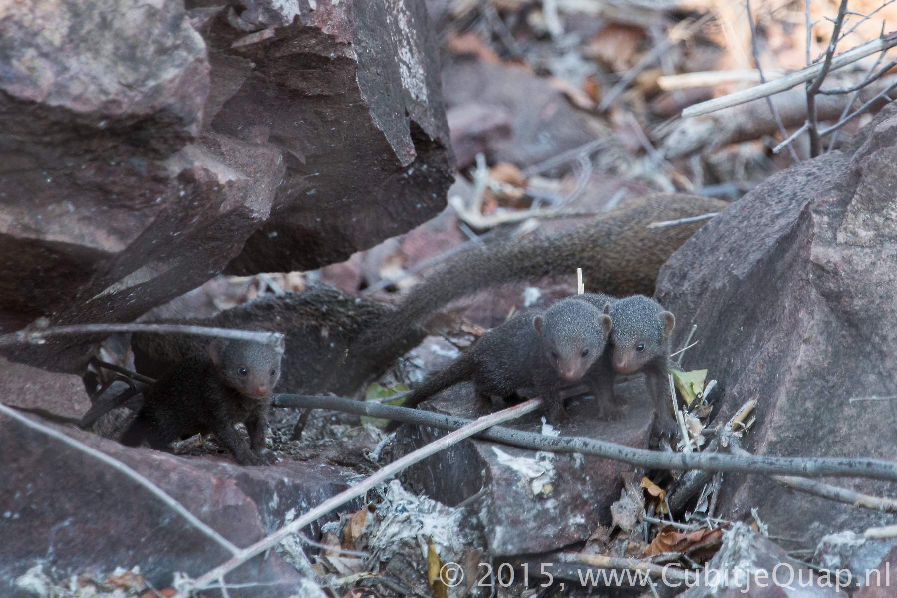 The dwarf mongoose is the smallest carnivore occuring in southern Africa. Its body is a uniform dark brown and from a distance it appears to be almost black. The fur is glossy and has a slightly grizzled appearance at close quarters.