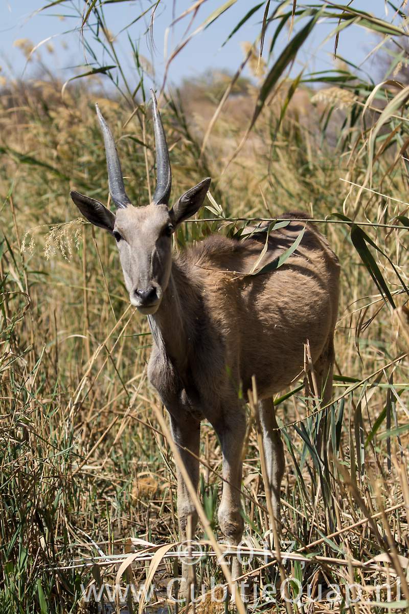 The largest living antilope, the eland has a cow-like appearance. Its general colour is usually fawn or tawny, turning blue-grey with age, particularly on the neck and shoulders. Adult bulls develop a patch of fairly long, dark, course hair on the forehead. A short dark mane runs down the back of the neck. The tail is fairly long with a tuft of black hair at the tip. Older bulls typically develop a large dewlap on the throat. Both sexes have horns, but those of the bull are thicker and the shallow spiral is marked by a prominent ridge.
