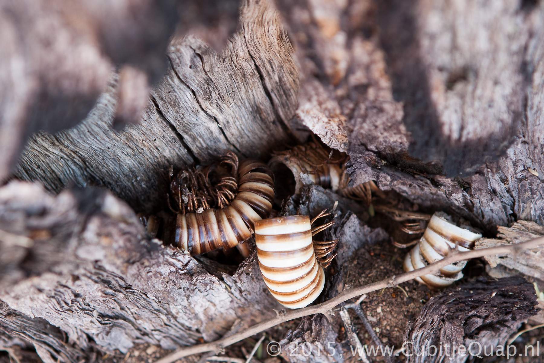 Antennae short. head tucked in, pointing downwards. 40 - 60 segments. Glossy black or with alternating yellow and black bands. Up to 120 pairs of legs. female lays several hundred pinhead-sized eggs. Young hatch with three pairs of legs, aquiring more at each moult.