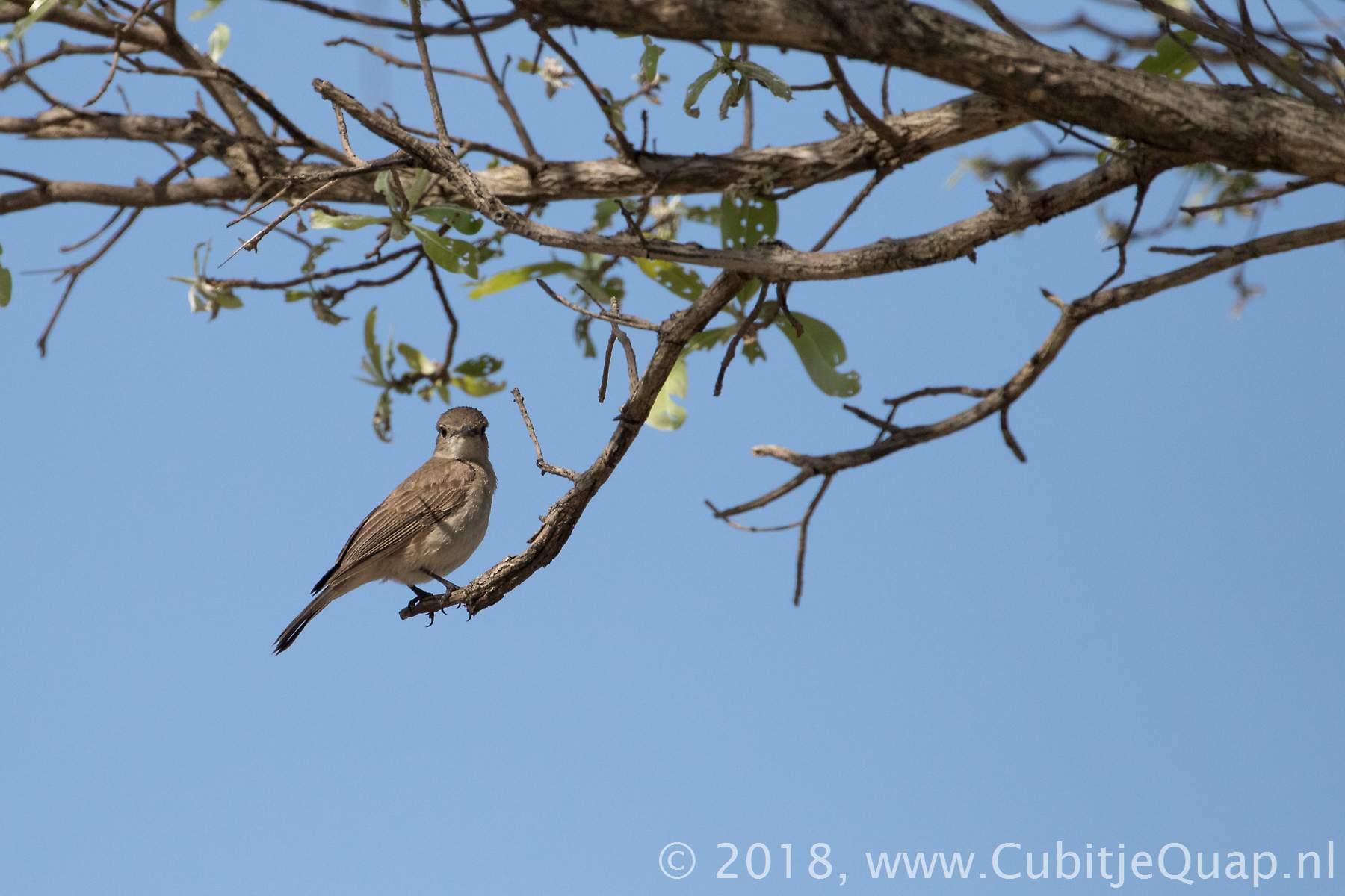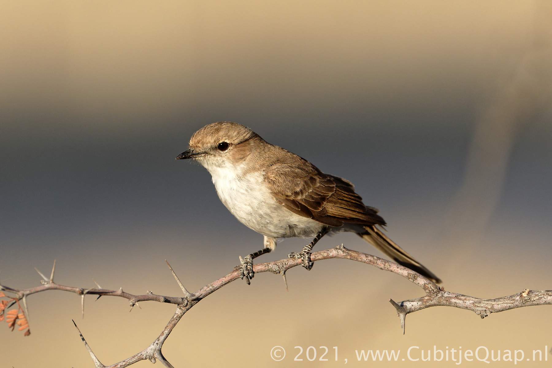 The contrasting pure white underparts and brown upperparts differentiate this species from Pale Flycatcher. it is conspicuous, often perching on fences and phone lines along roadsides.