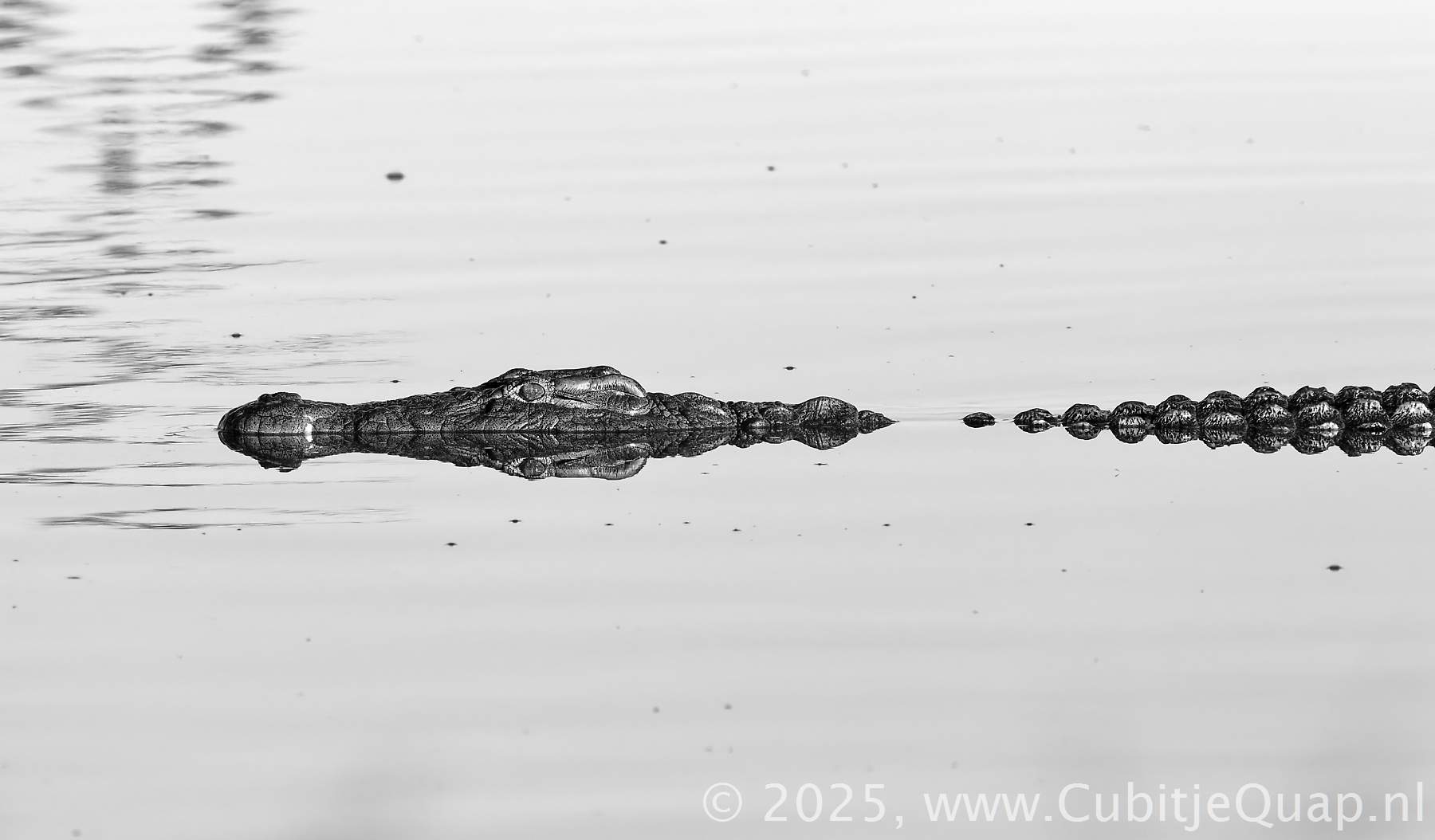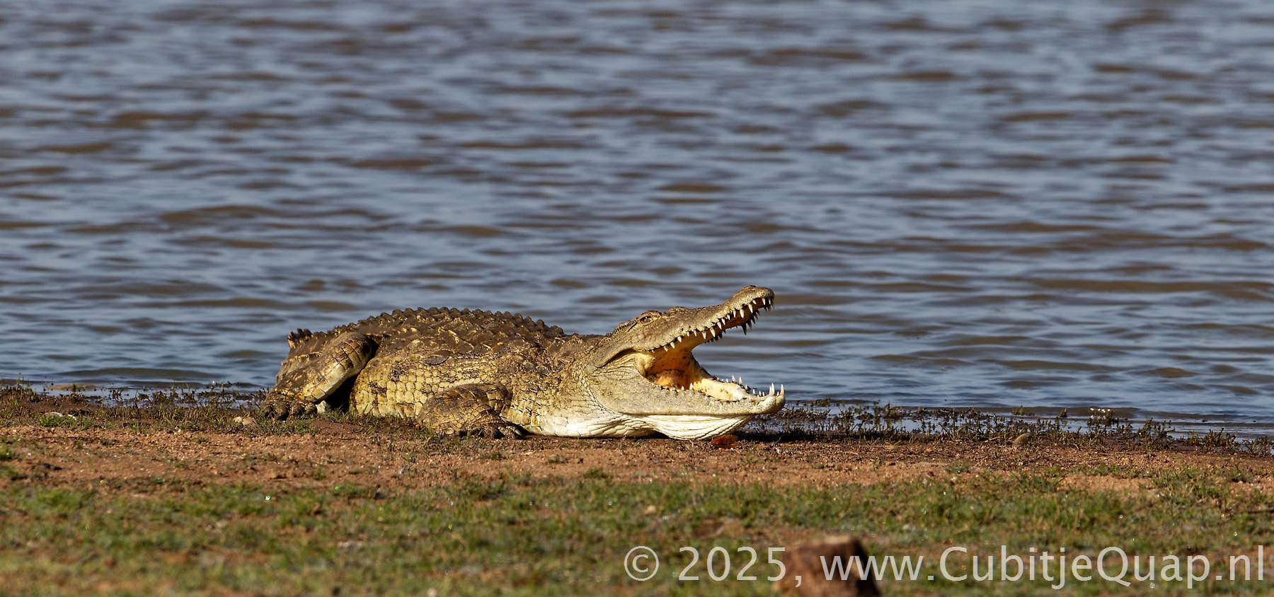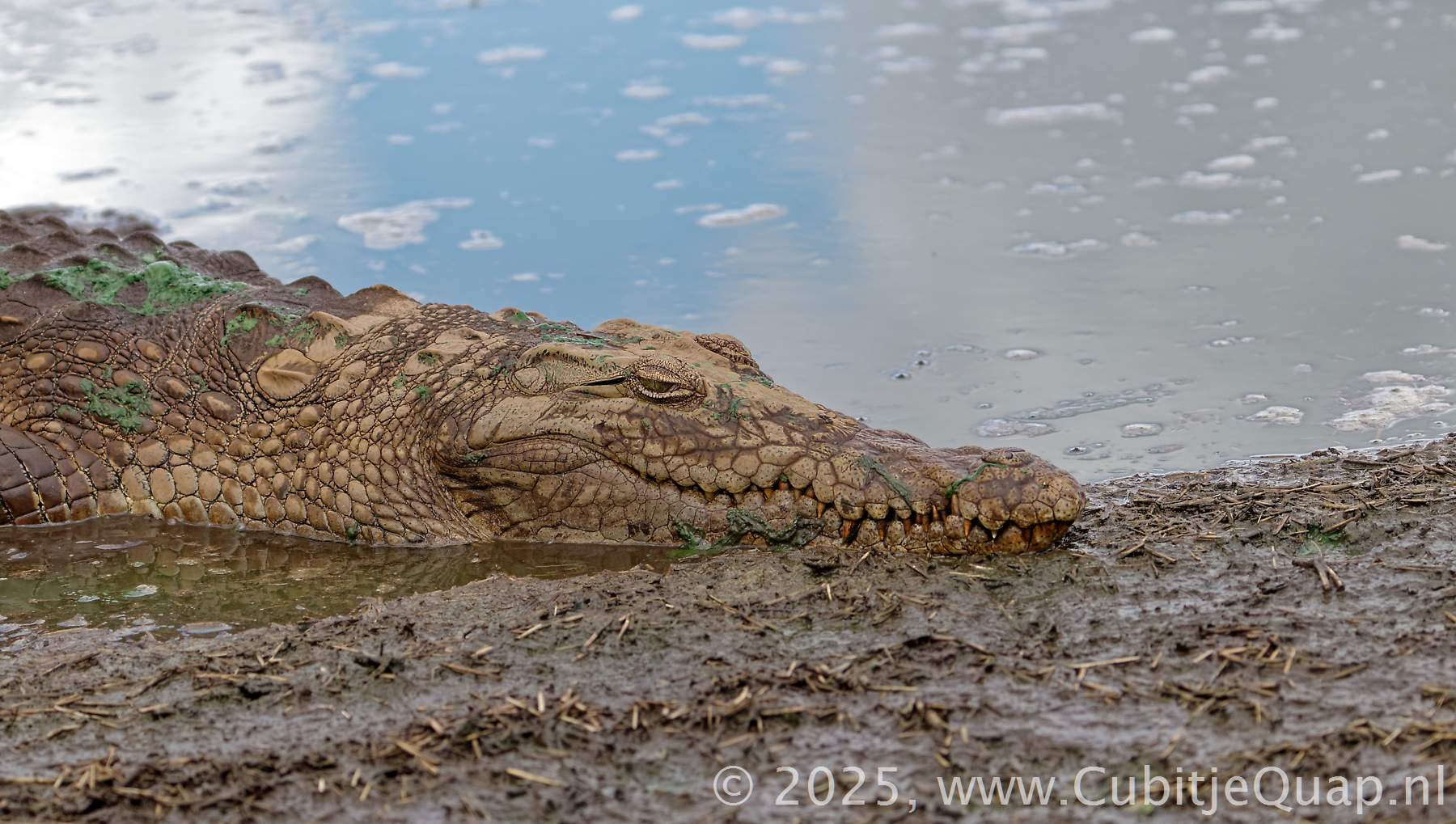 Large. Long tail has two raised keels. Hindfeet webbed. Eyes and valved nostrils on top of head. Adult dull olive with cream belly. Hatchling has black markings and straw-yellow belly. 20 - 80 eggs laid in hole in sandbank. Parent protects nest, hatchlings. Young eat insects, frogs. Adult ambushes mammals, birds, fish.