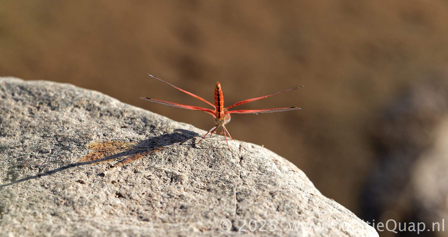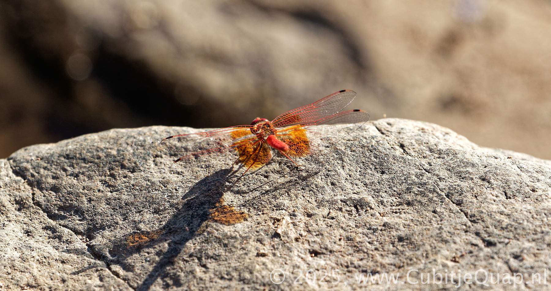 Small to medium sized, bright orange red dragonfly, with diagnostic large orange splashes on all wings.