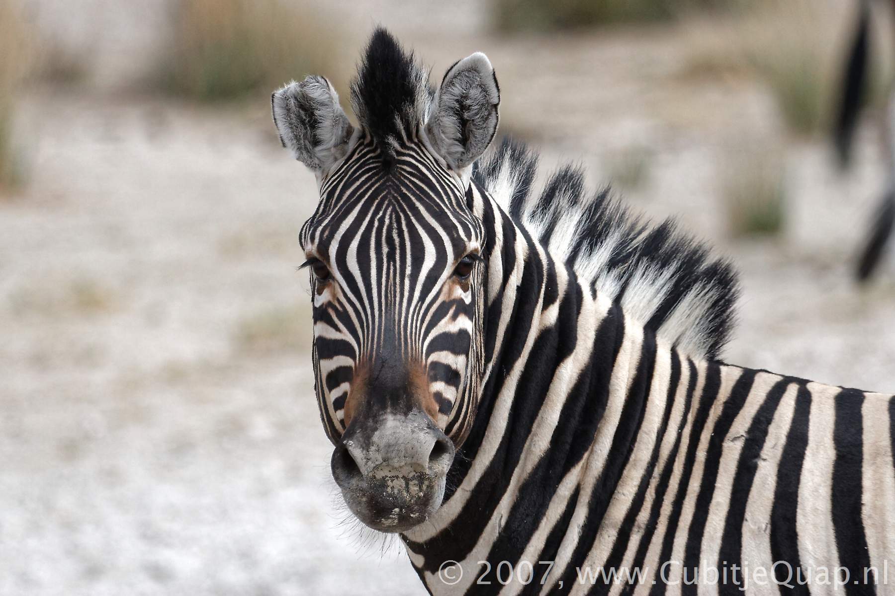 Plains zebra shows considerable variation in colouration and patterning but is usually striped in black and white with a fainter 'shadow' stripe superimposed on the white stripe, particularly on the hindquarters. No grid-iron pattern on rump and striping extends onto underparts. Long, erect mane extends from top of head to shoulders. Striping may or may not extend to the hoofs.