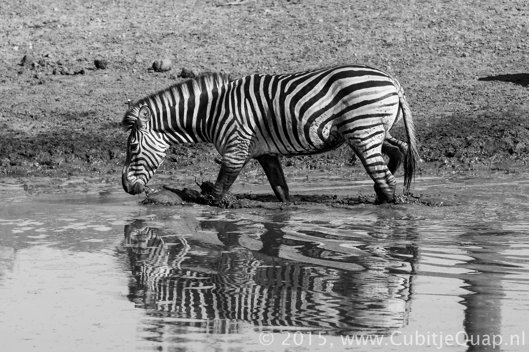 The zebra is stocky and horse-like with black and white stripes. Shadow stripes are superimposed on the white stripes and the stripes extend onto the underparts.