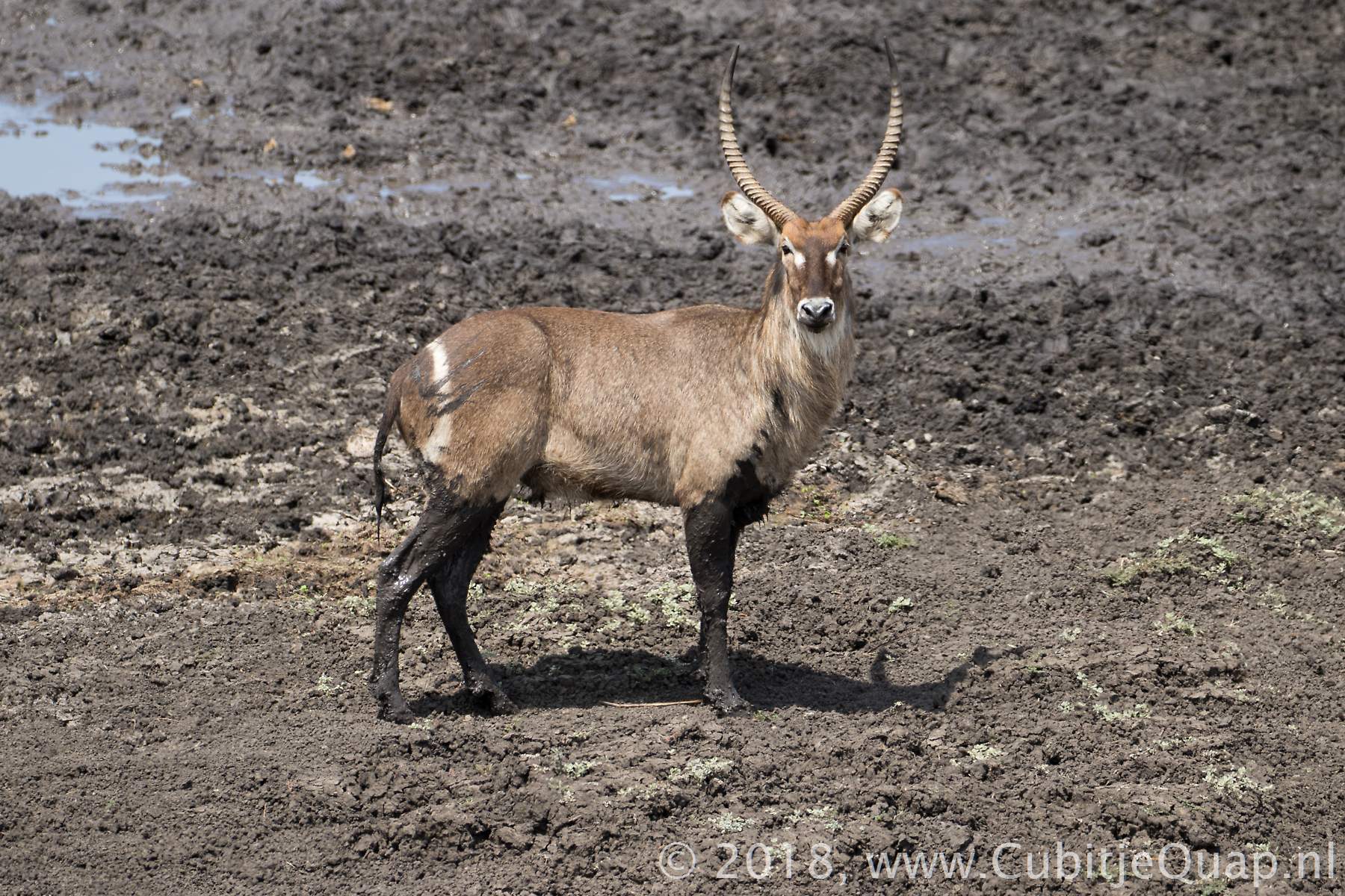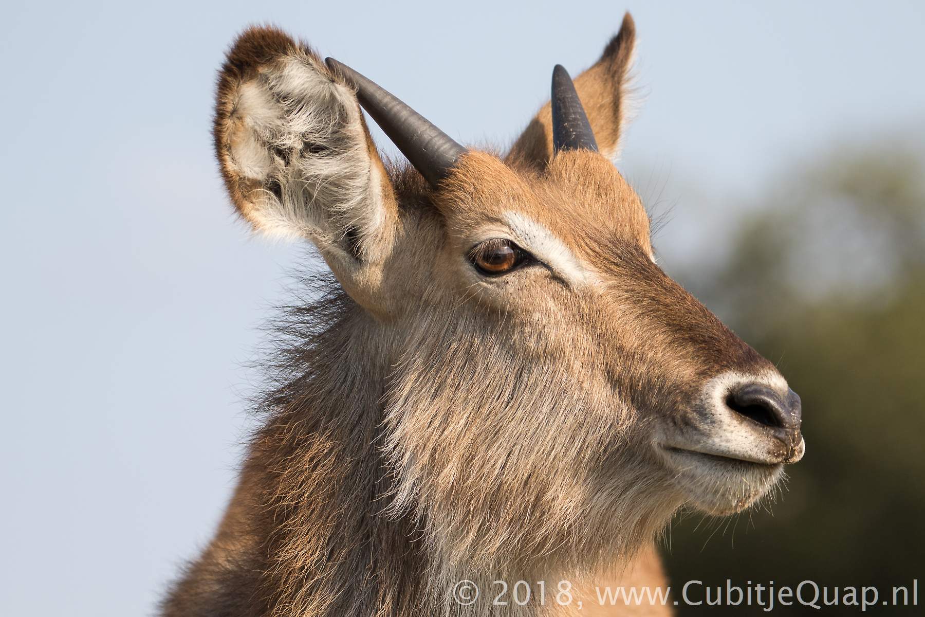 Waterbuck are large, robust antilopes with coarse and long coats. The body colour is grey-brown with either grey or brown being dominant, scattered through with grey or white hairs. A broad white ring encircles the rump and a white band is present from throat to the base of the ears. The flanks are lighter in colour than the back and the hair around the mouth, nose and above the eyes is white. The ears are short, rounded, white on the inside with a black tip. The tail is quite long with a black tuft of hair at the tip. Only the bull has the long, heavily ringed horns that curve backwards and then forwards towards the tips.