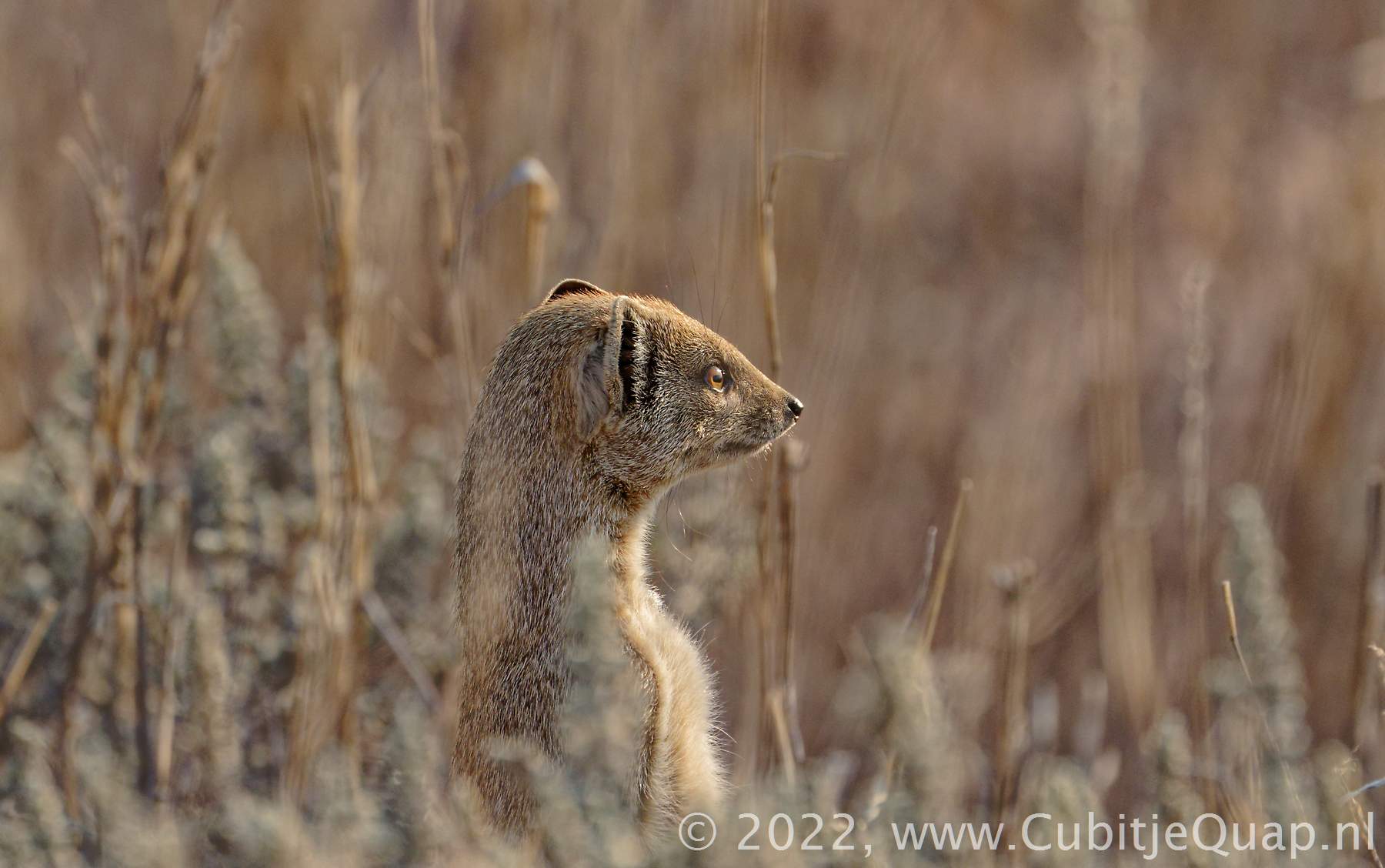 This is a mongoose of open habitats, short grassland, and semi-desert scrub, but it also occurs in the more open areas along the coast. It is absent from forest, dense vegetation and the coastal Namib Desert.