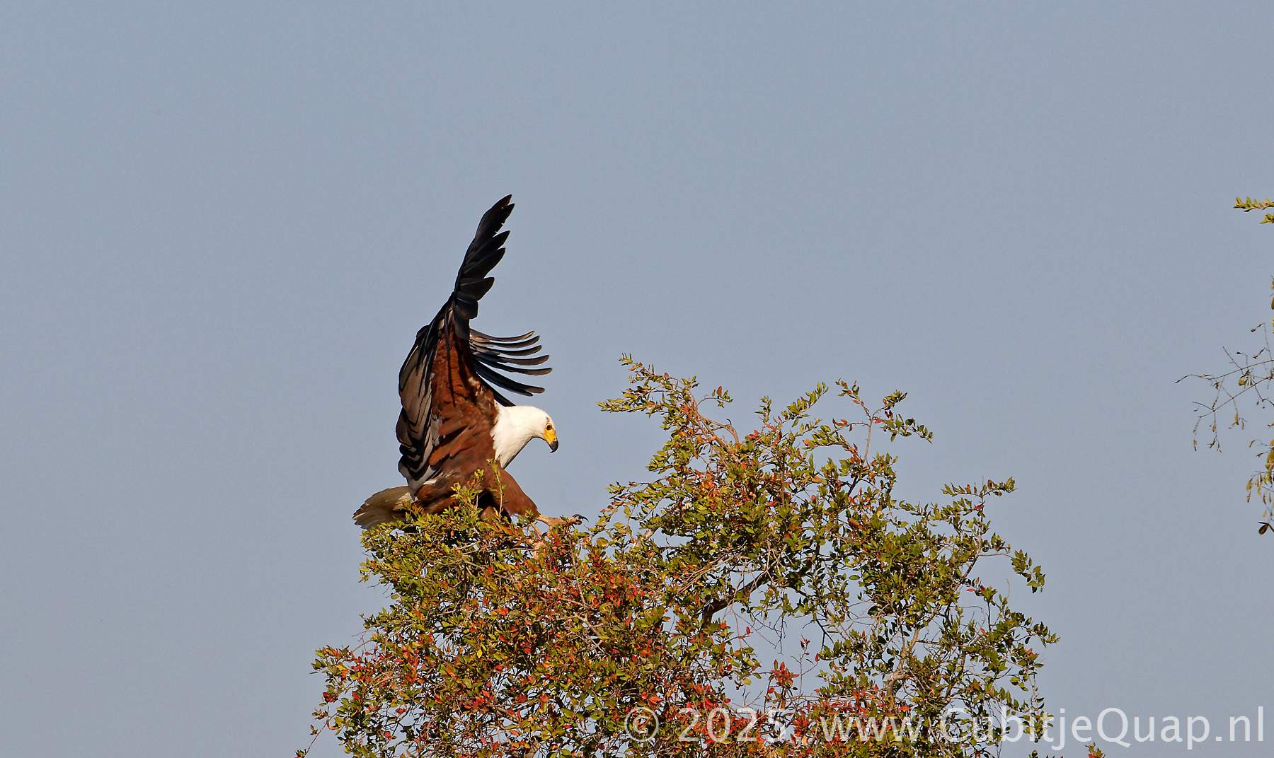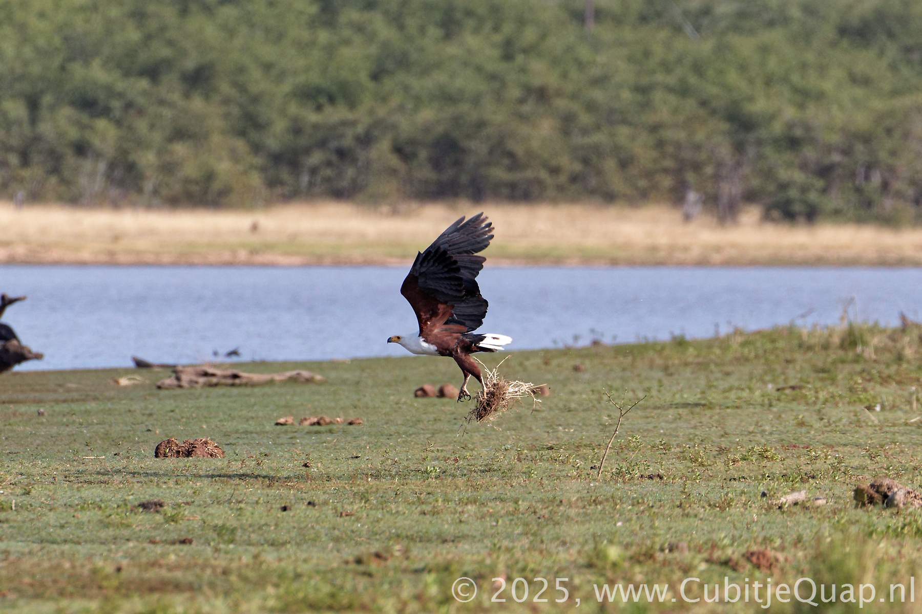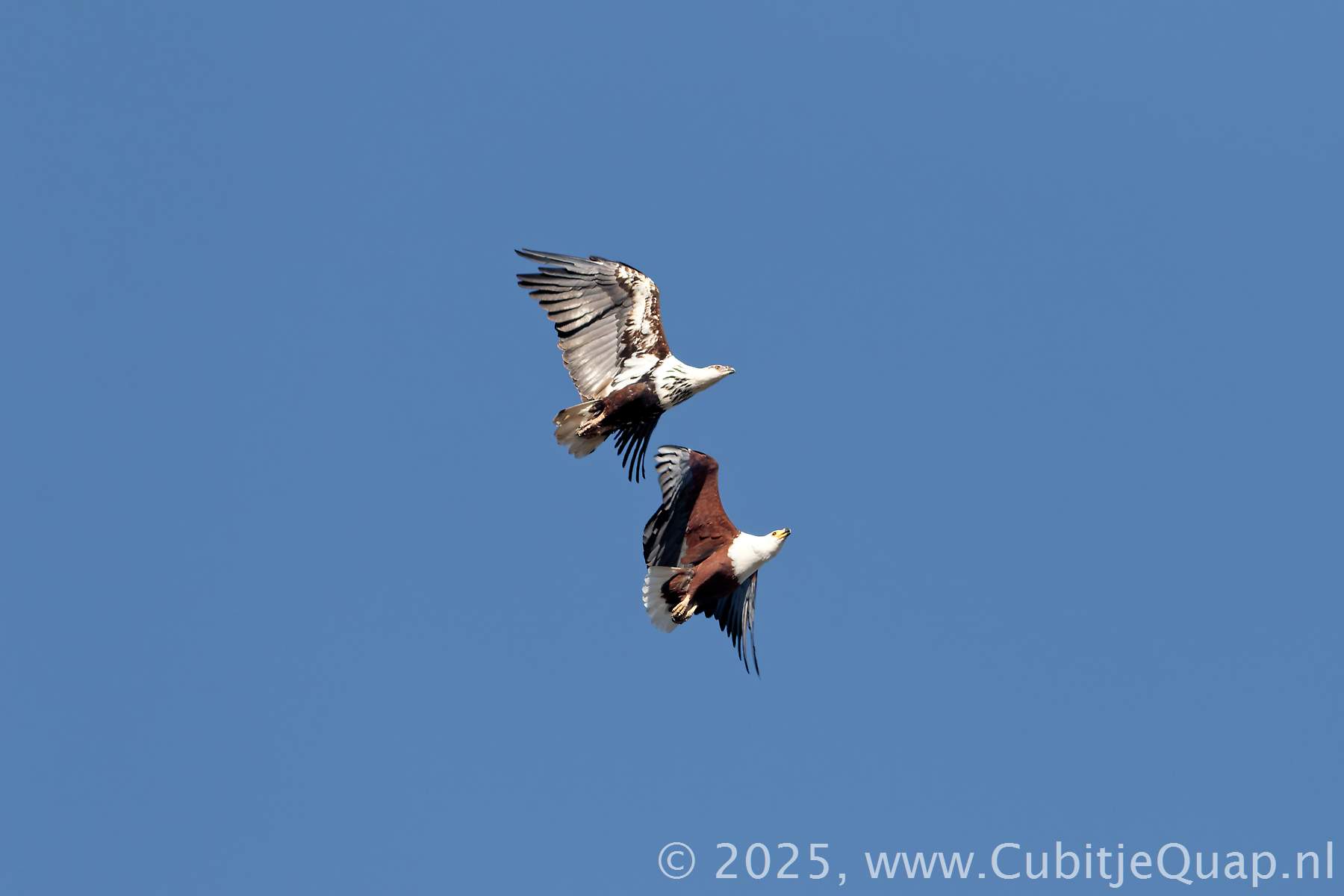 In addition to having a diagnostic call, adult African Fish Eagle is unmistakable with its white head and breast, chestnut belly and forewings, black and chestnut underwings and white tail. Overall impression in flight is of a large, broad-winged eagle with a short tail.