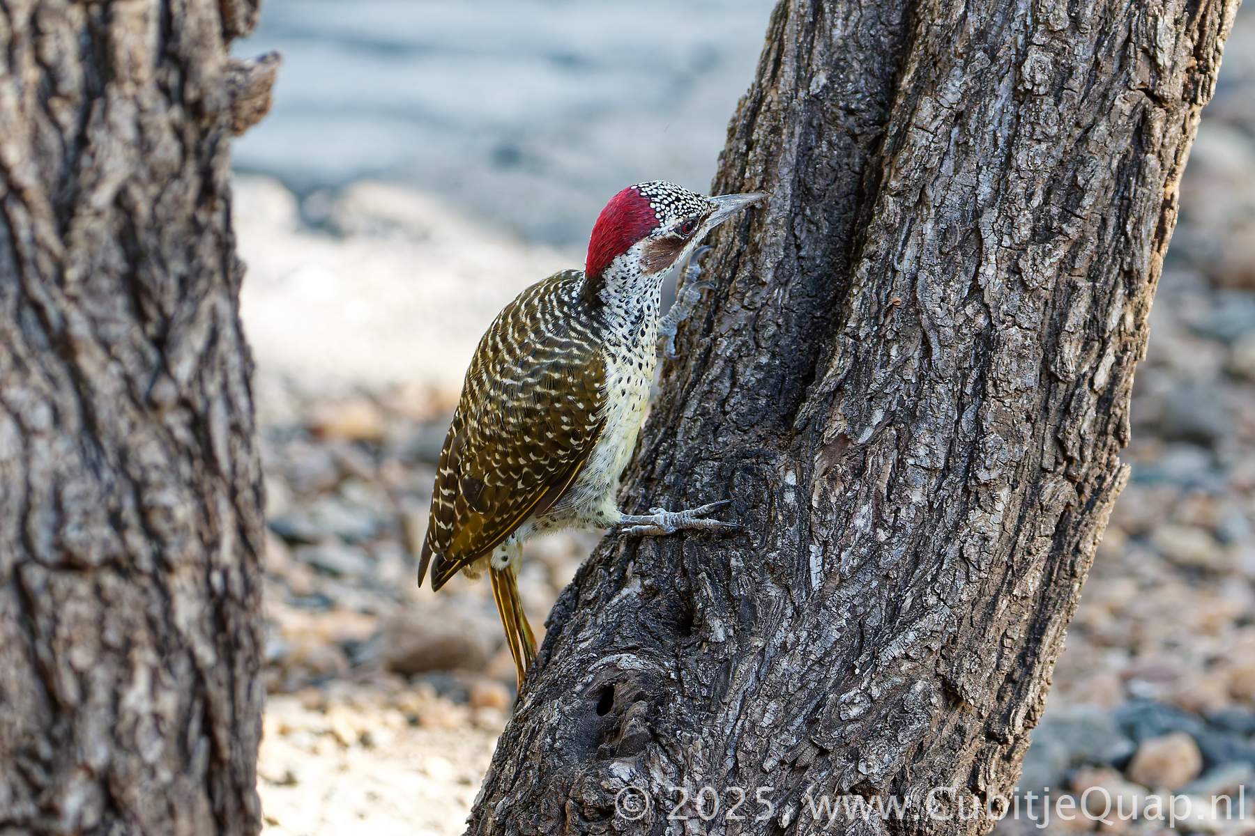 Male differs from all other woodpeckers in the region by having an all-red forehead, crown and moustacial stripes. Male of north-western race (buysi) has mostly unmarked, pale peach-coloured underparts.