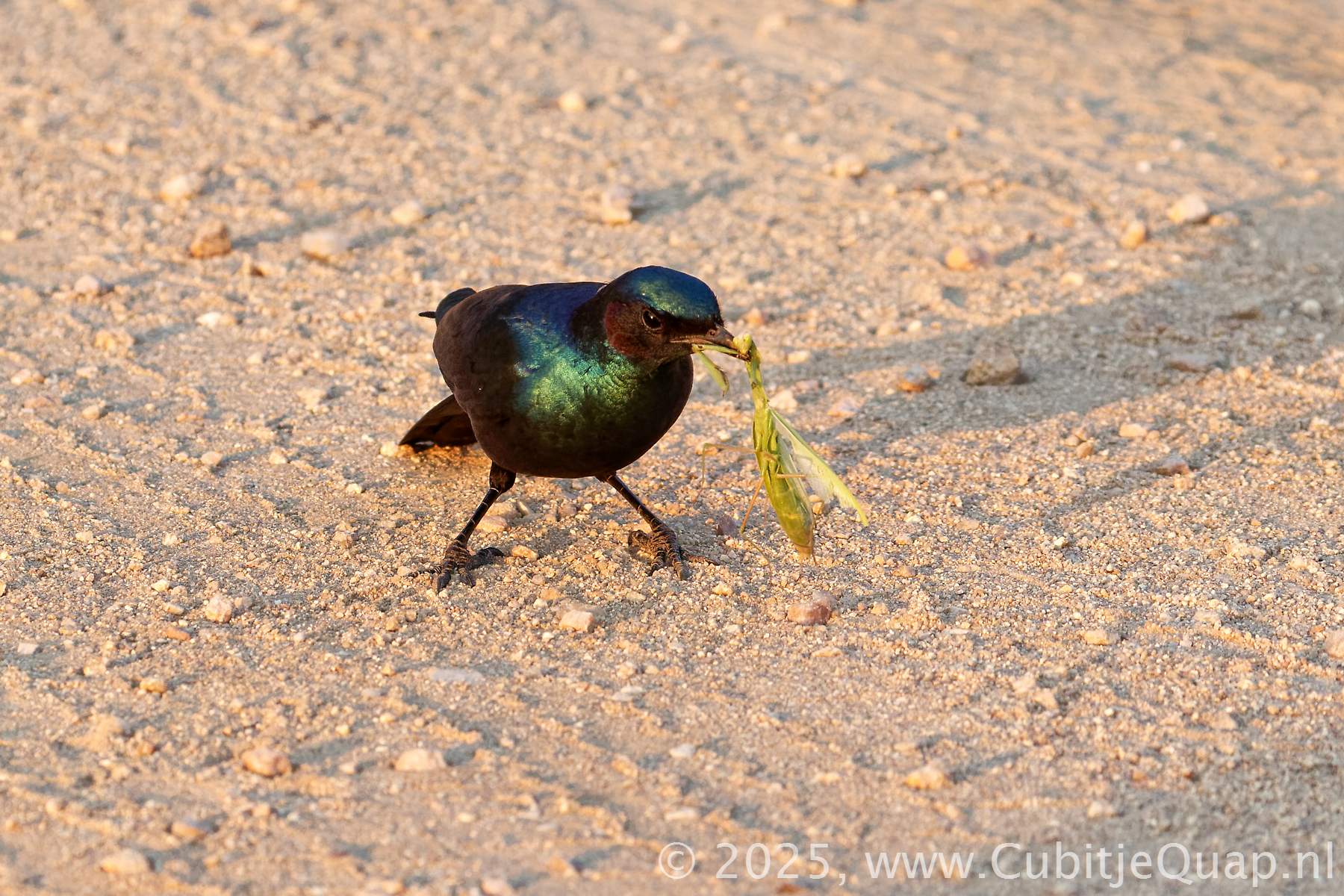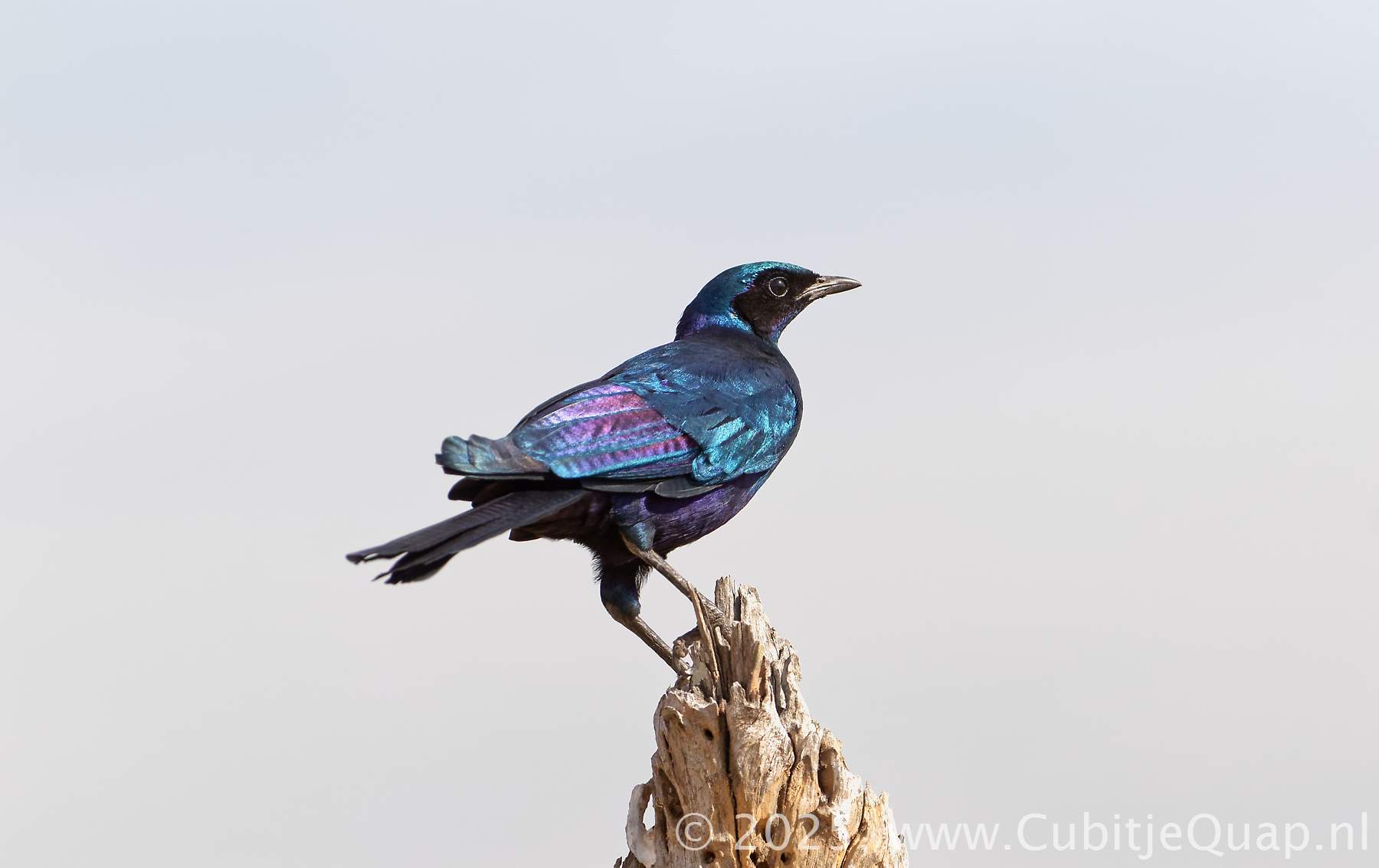 Larger and more heavily built than Meves's starling. This species has broader, more rounded wings and a shorter, broader tail, although the tail is proportionally longer than that of other, smaller, glossy starlings.
