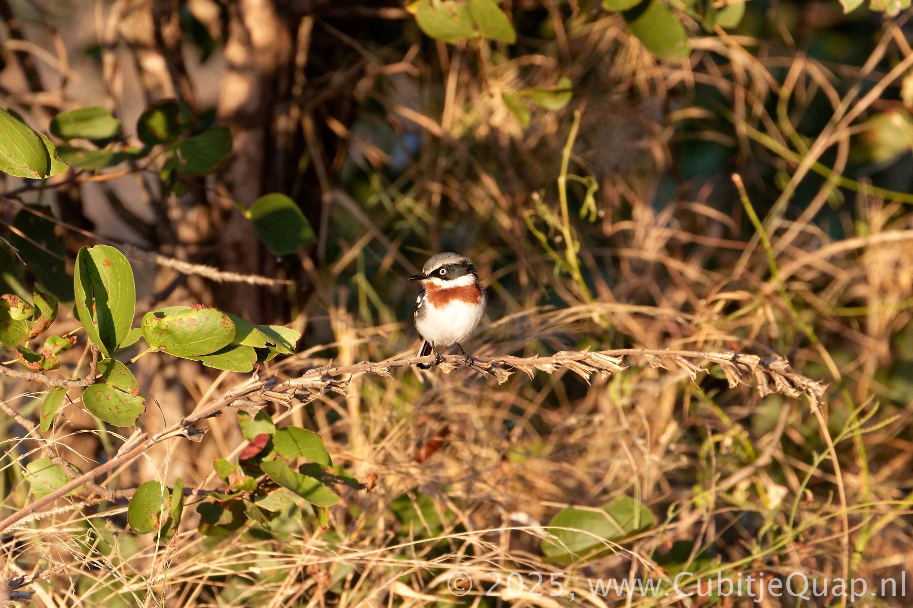 Female has a distinctive, clearly defined, rufous spot on the chin, unlike the diffuse chestnut on other female batises' throats. Juvenile resembles female but has a mottled head and breast.