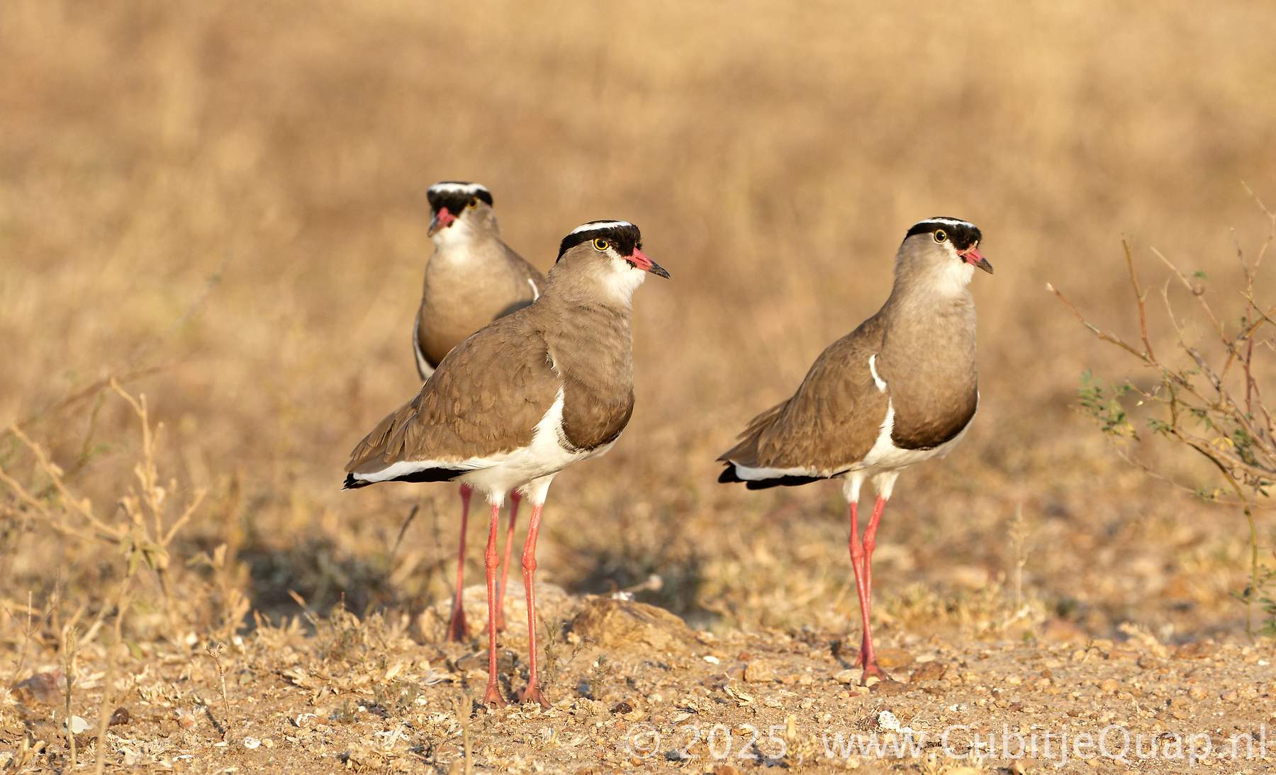 A large unmistakable plover, with its black cap surrounded by a white 'halo'. The legs and basal part of the bill are red. The sandy brown breast is separated from the white belly by a black band.