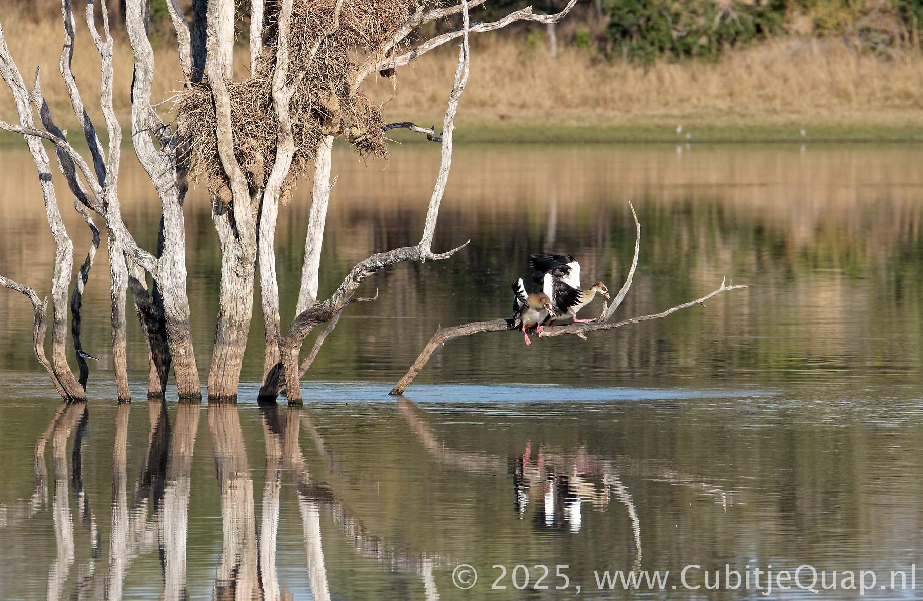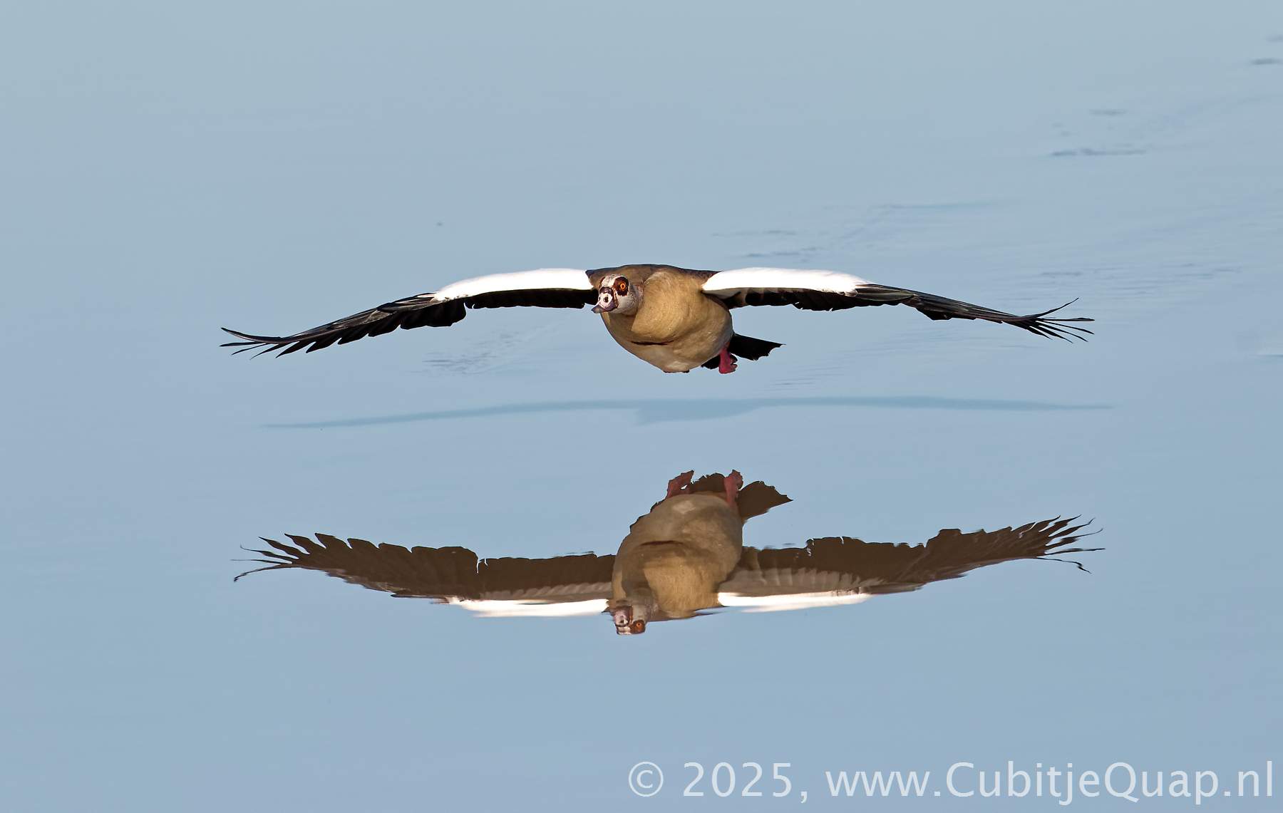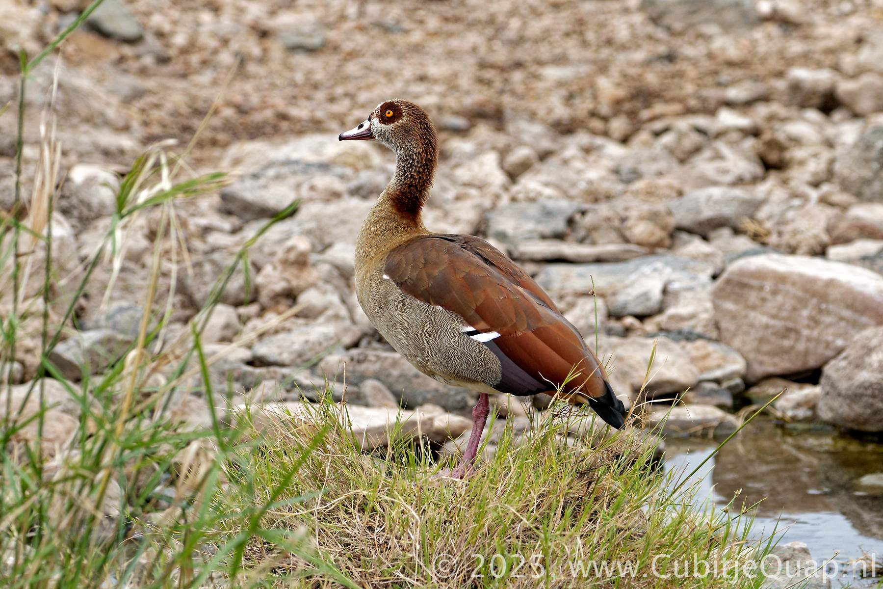 This large brown bird has a dark brown mask around the eye, and a brown patch on the breast that is distinctive in flight. Compared with South African Shelduck it has a longer neck and legs, and a thin, dark line running through the white forewing is visible in flight.