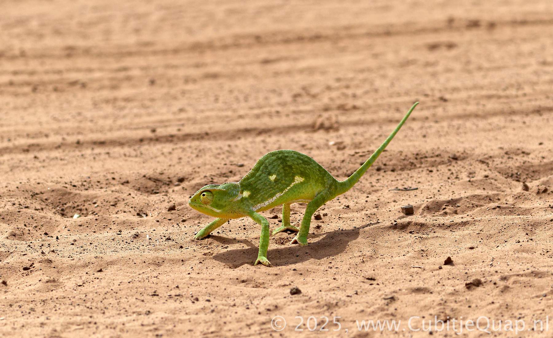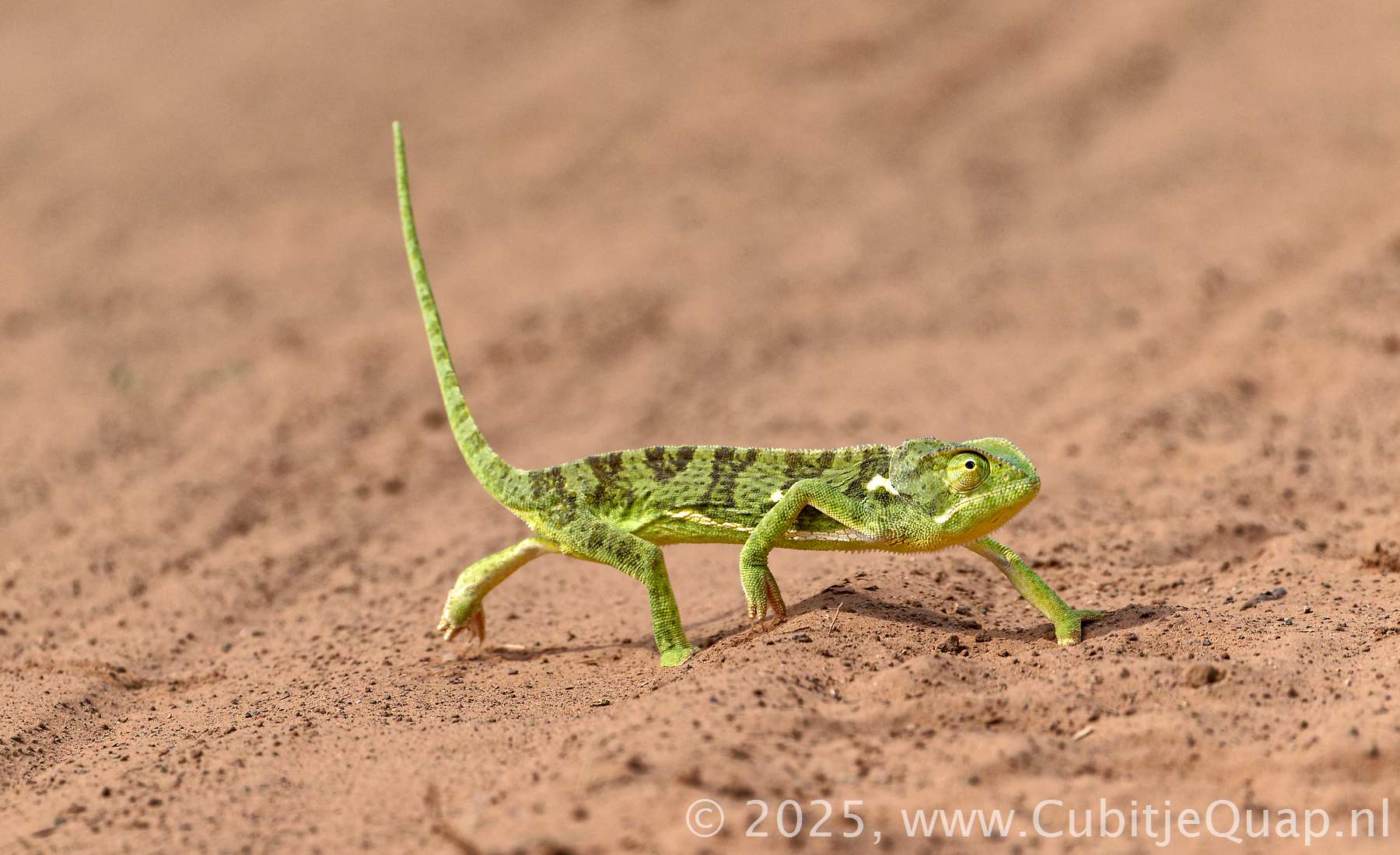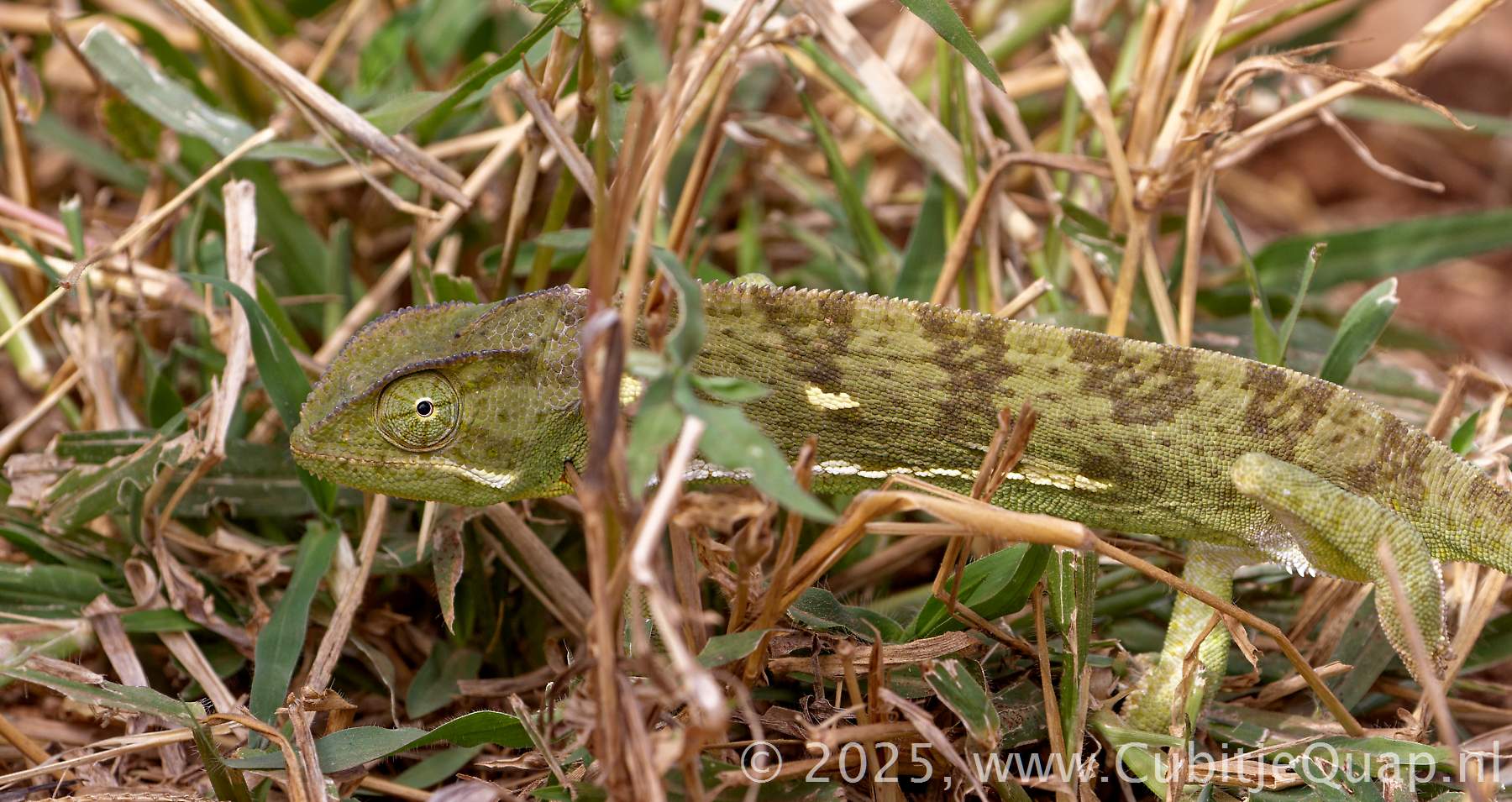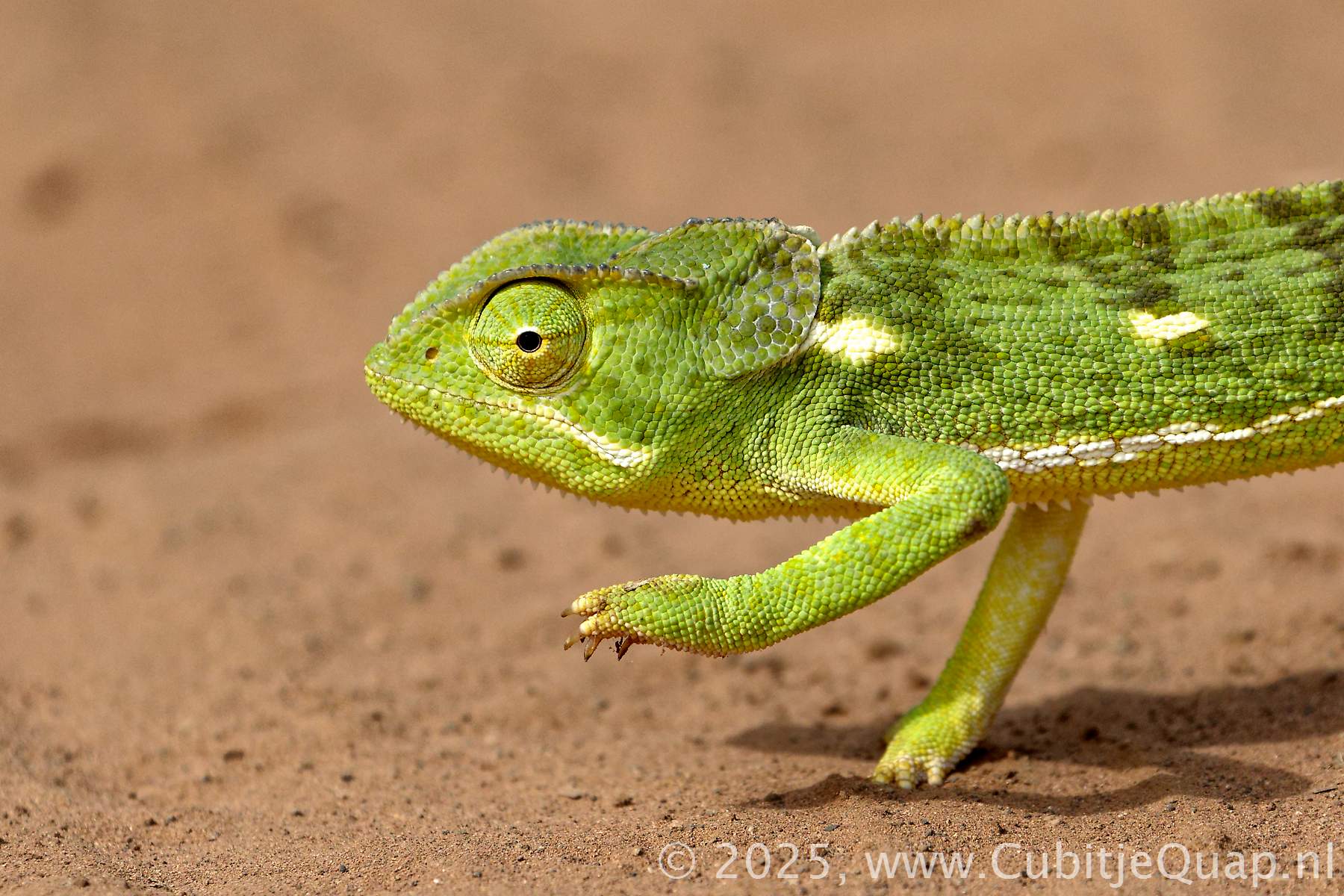 Large chameleon with large skinflaps behind the head. A crest of small white scales on the throat and stripes of small white scales on the belly. body varies from green to pale yellow or brown, sometimes speckeled.