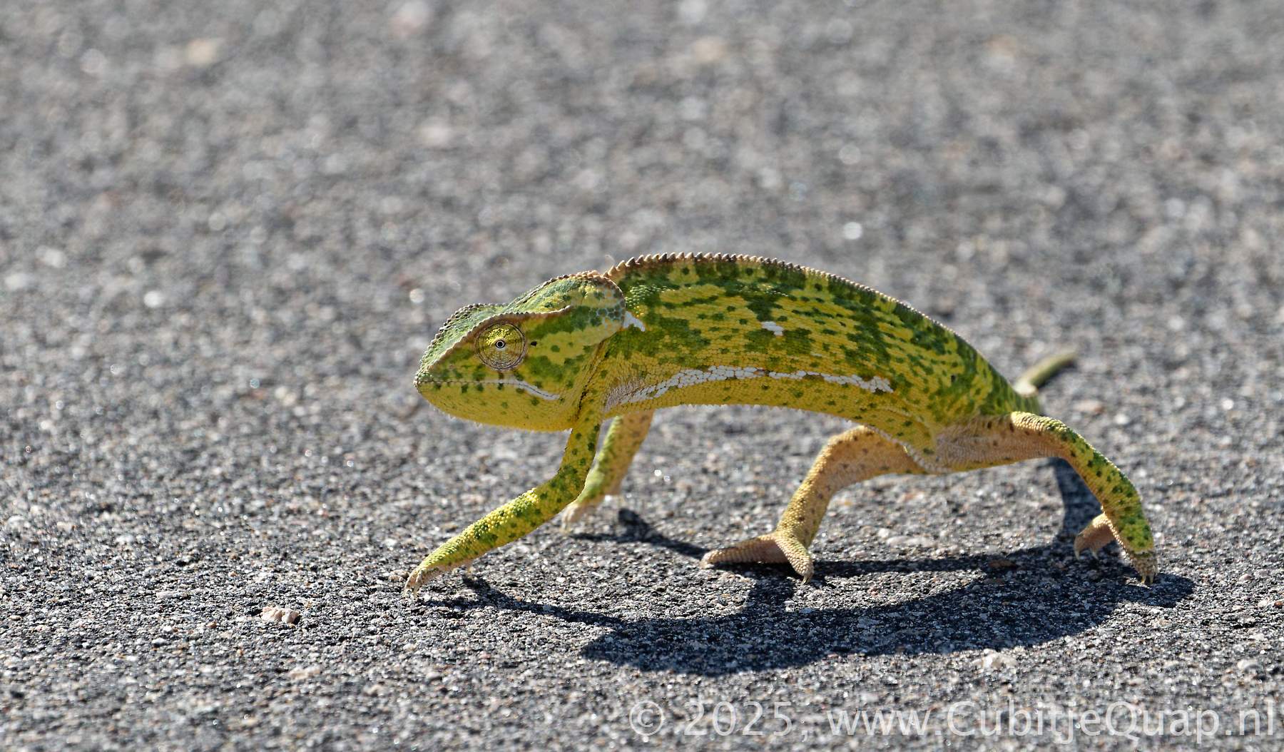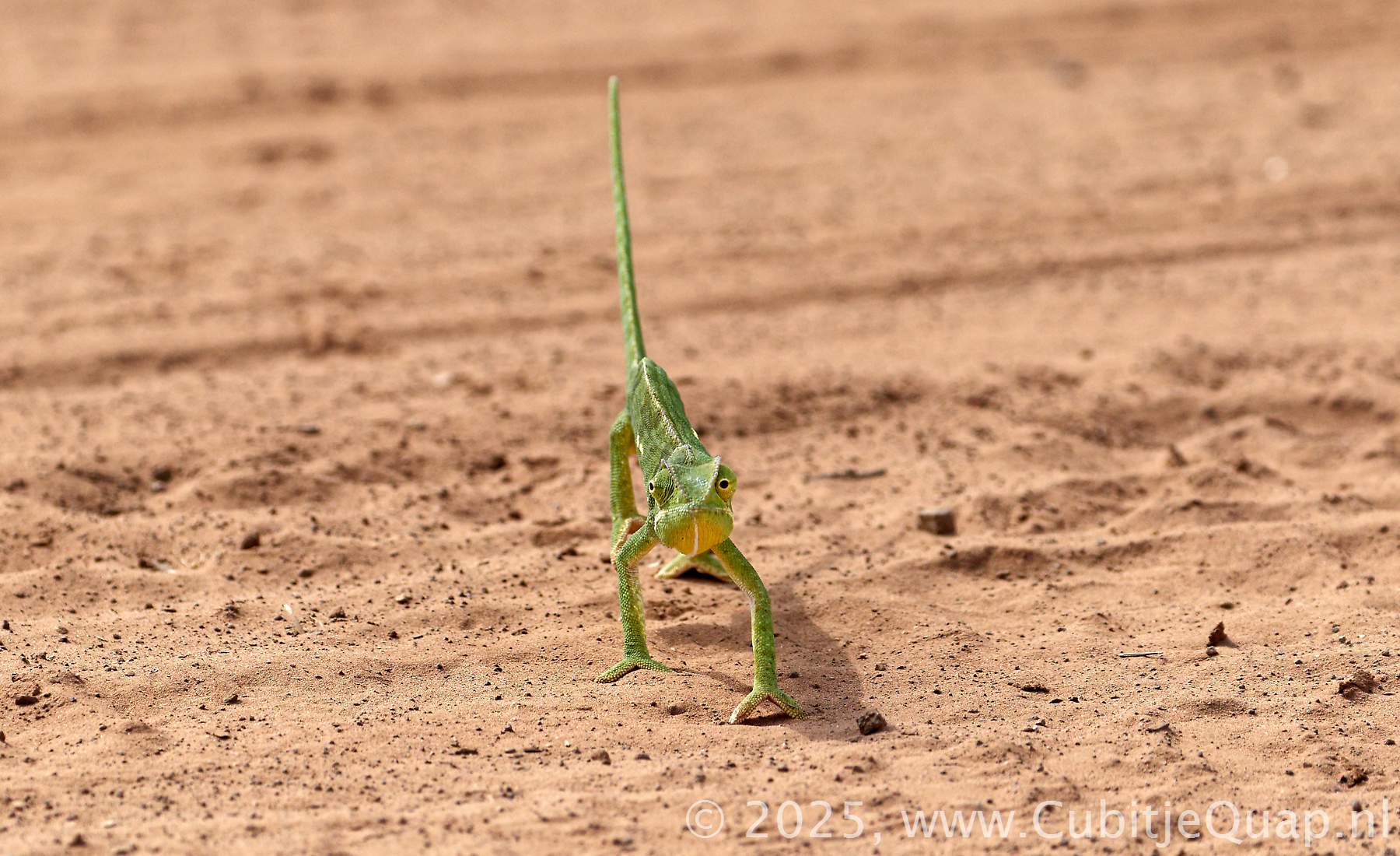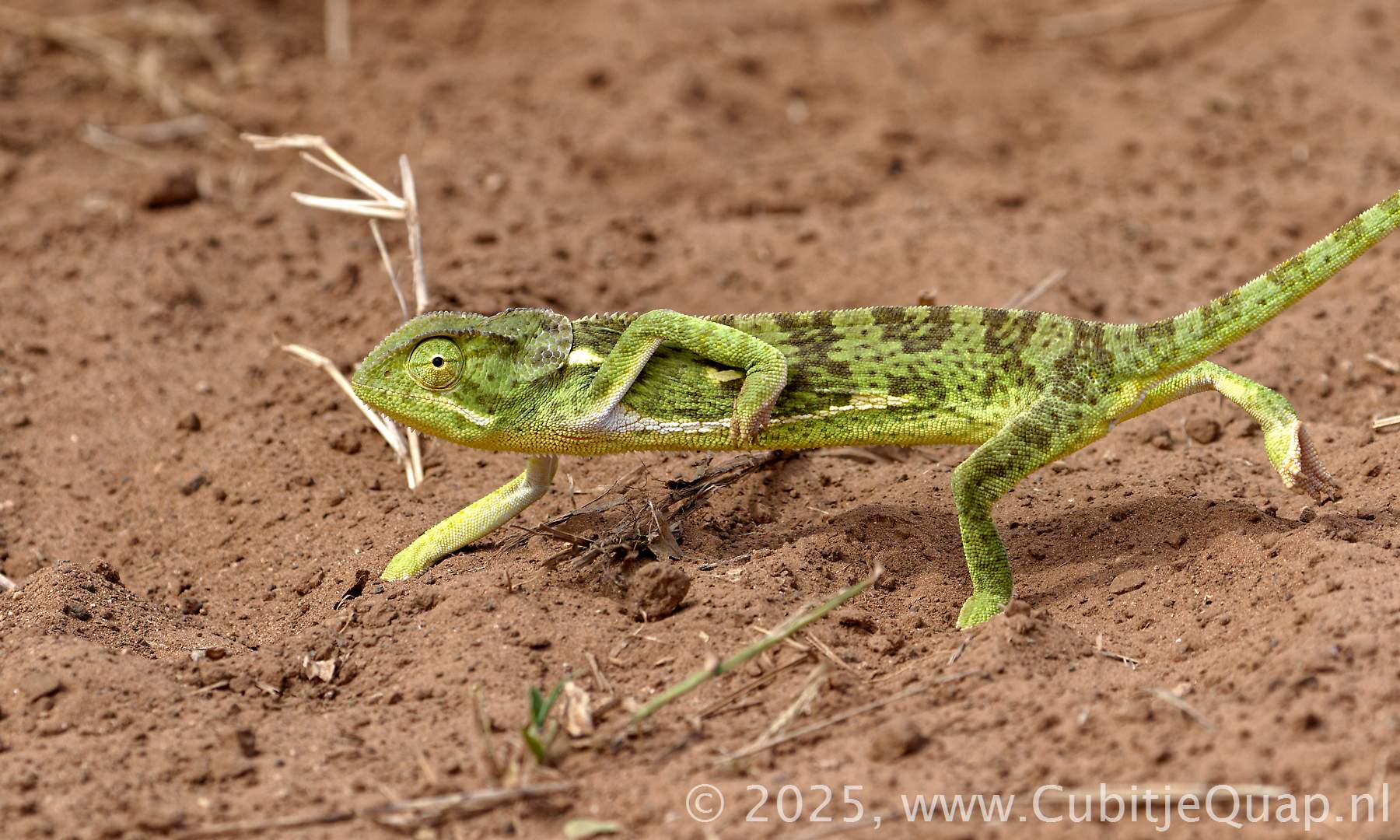 Large chameleon with large skinflaps behind the head. A crest of small white scales on the throat and stripes of small white scales on the belly. body varies from green to pale yellow or brown, sometimes speckeled.