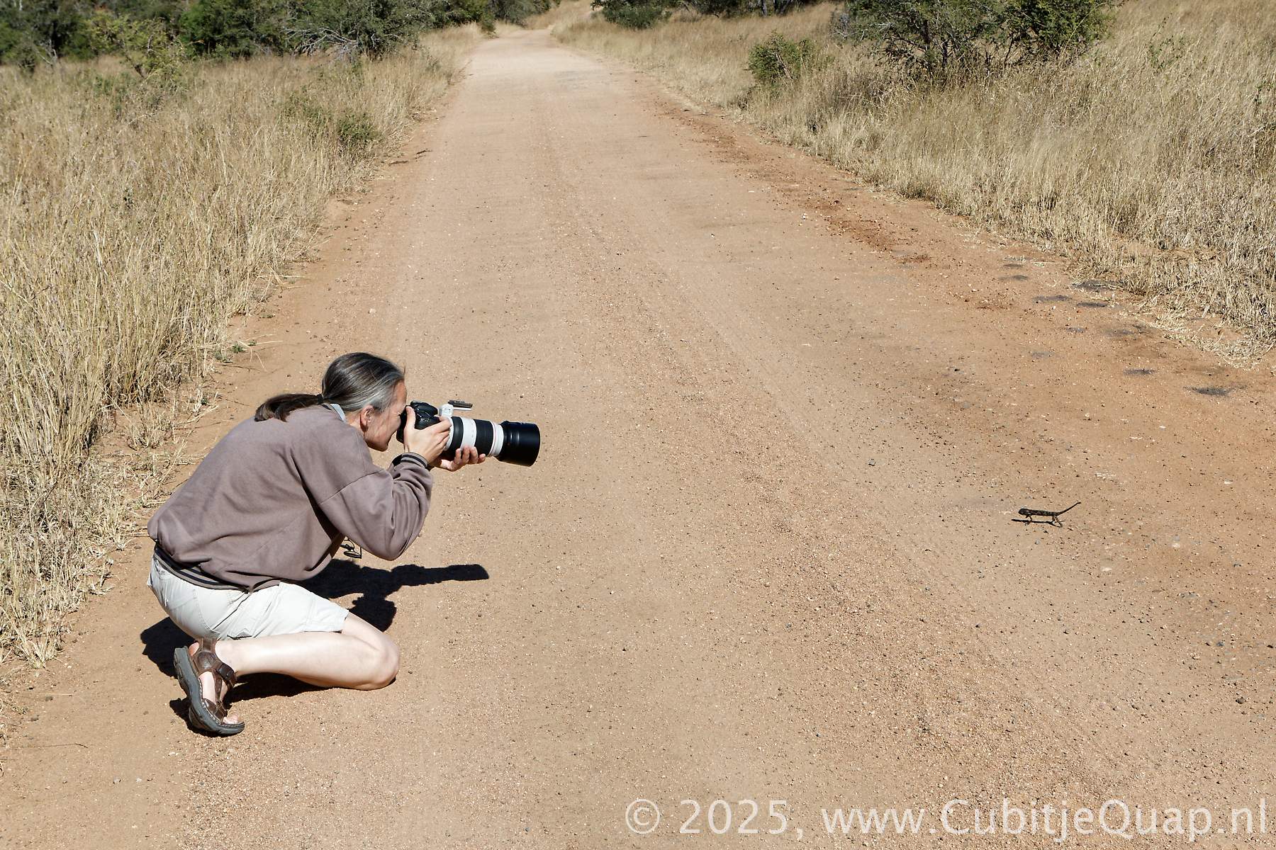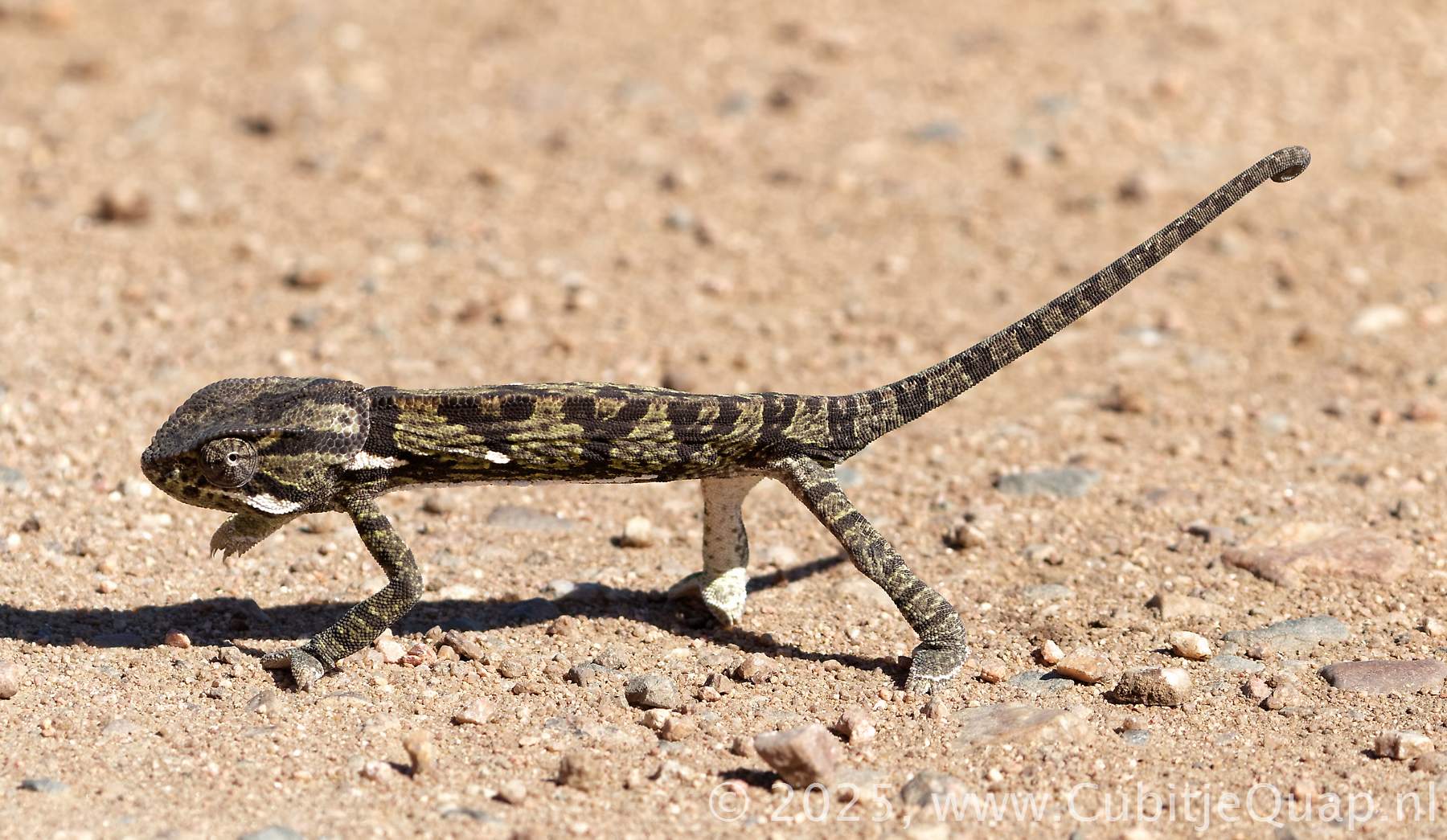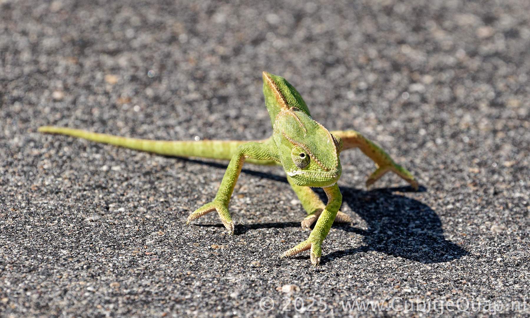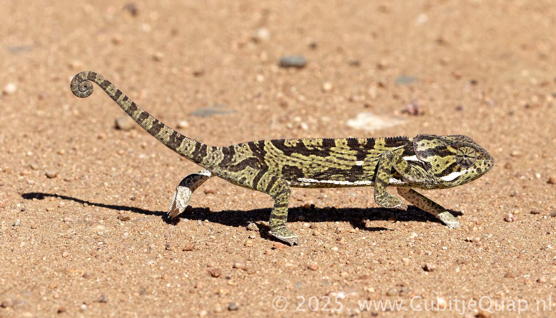 Large chameleon with large skinflaps behind the head. A crest of small white scales on the throat and stripes of small white scales on the belly. body varies from green to pale yellow or brown, sometimes speckeled.