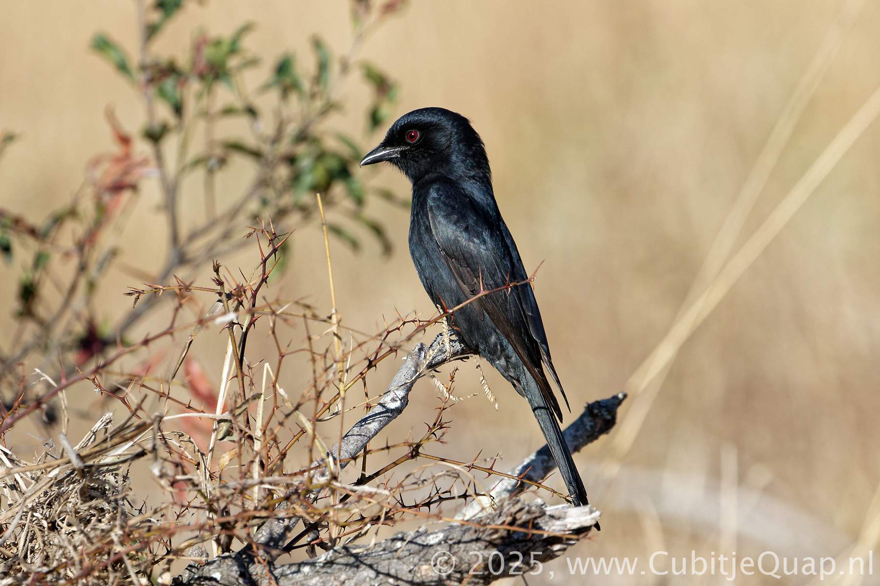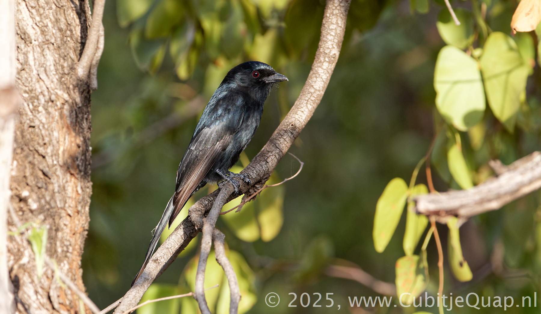 The only all-black perching bird in the region to have a deeply forked tail. Square-tailed drongo and southern flycatcher are similar, but are smaller and have only a slight fork in the tail.