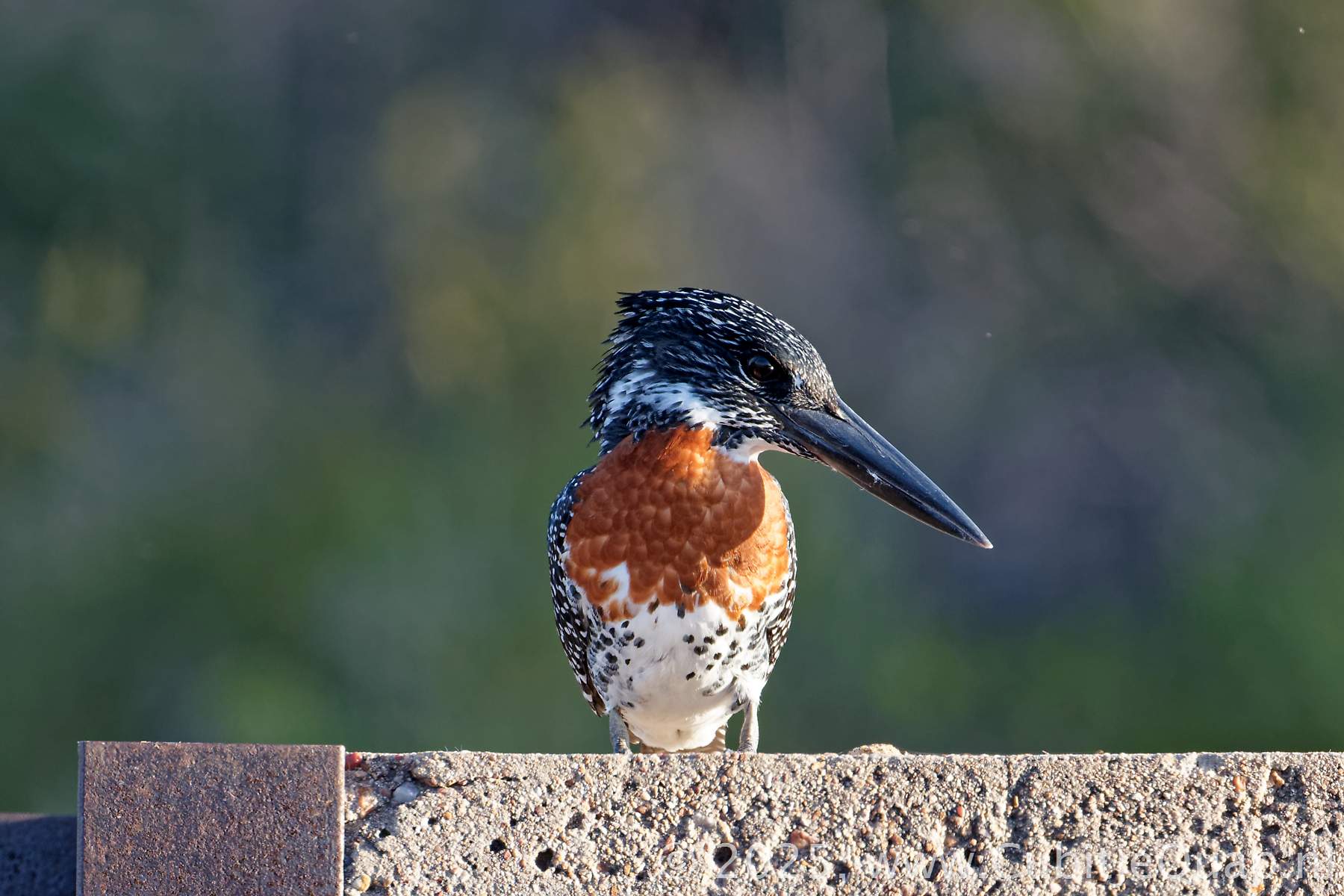 The largest kingfisher in the region. It is unmistakable, with its long, heavy bill, dark, white-spotted back and rufous chest (male) or belly (female). It rarely hovers.