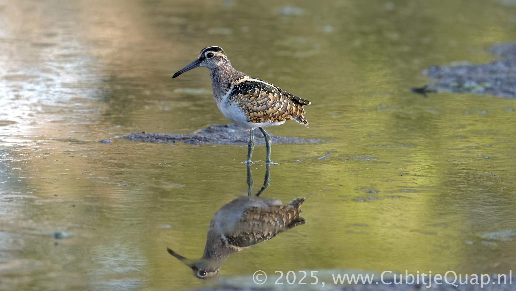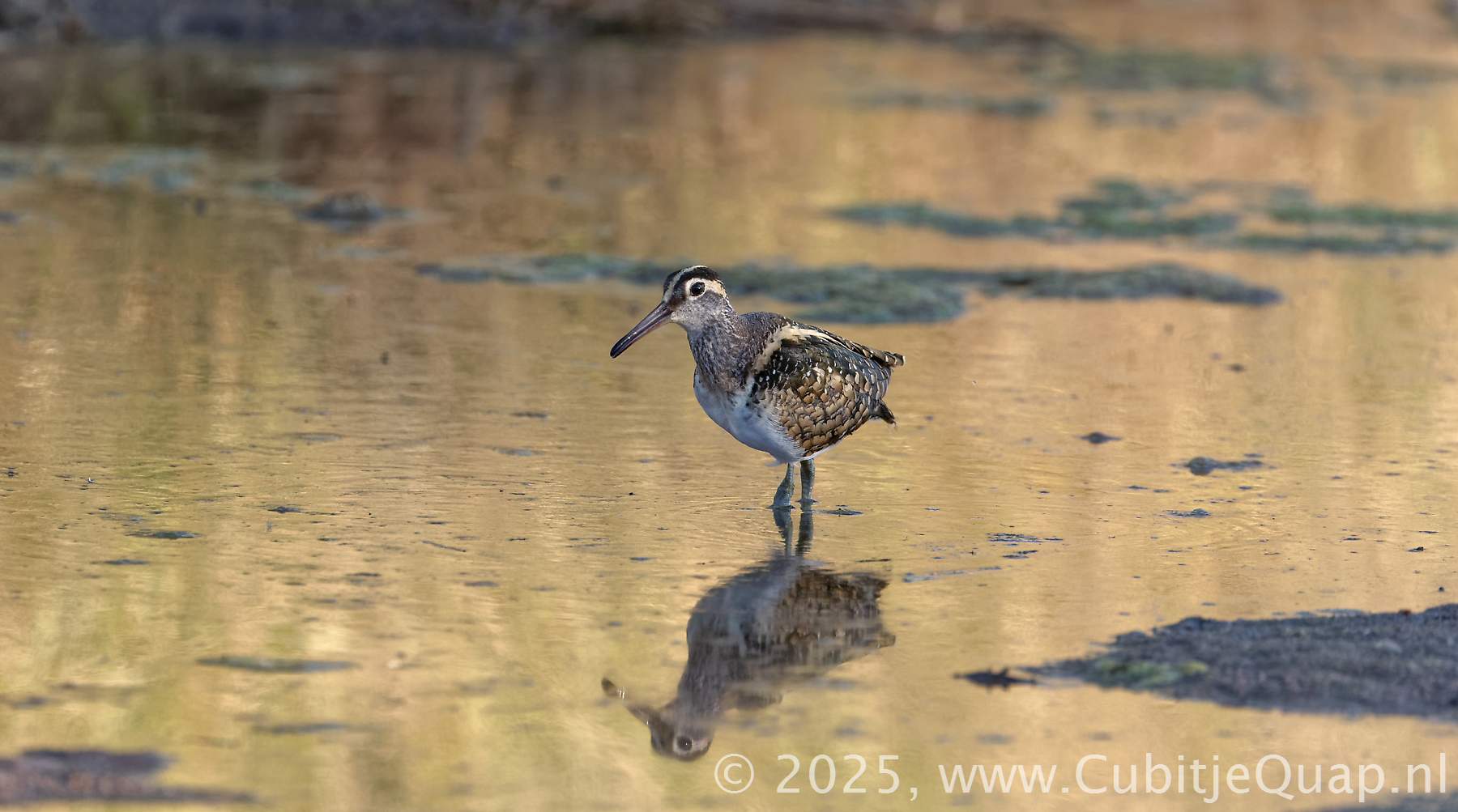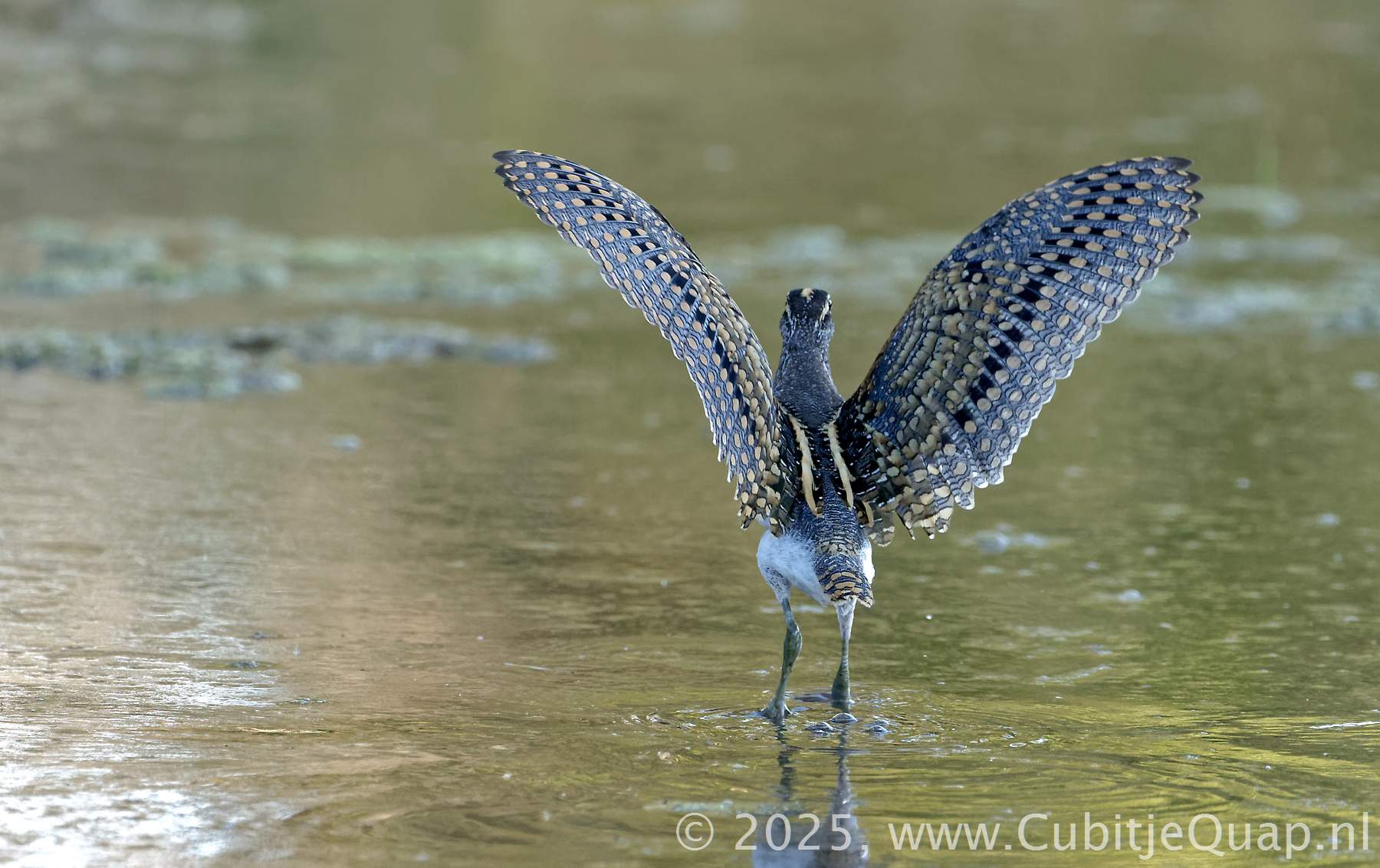 Male distinguished from the African and great snipes by its breast pattern, longer legs, and shorter, slightly decurved pale bill. It has a laboured flight action on broad wings.