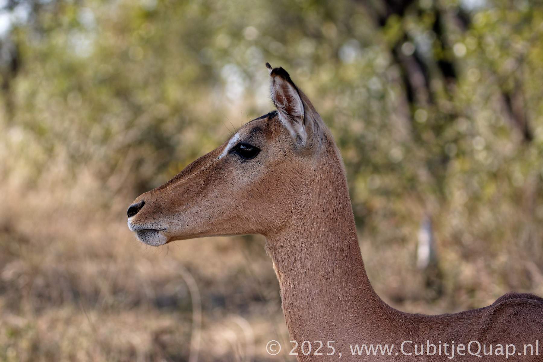 Medium sized, lightly built antilope. Upper parts reddish-fawn becoming paler on sides; chest, belly, throat and chin are white. Tail is white with central black line on upper surface, and each buttock has vertical black blaze. Tuft of black hair on lower rear edge of hindleg is characteristic unique to the impala. Ears are black tipped. Only rams carry the long graceful lyrate horns. The black blaze down the front ot the face is distinctive for the black-faced impala.