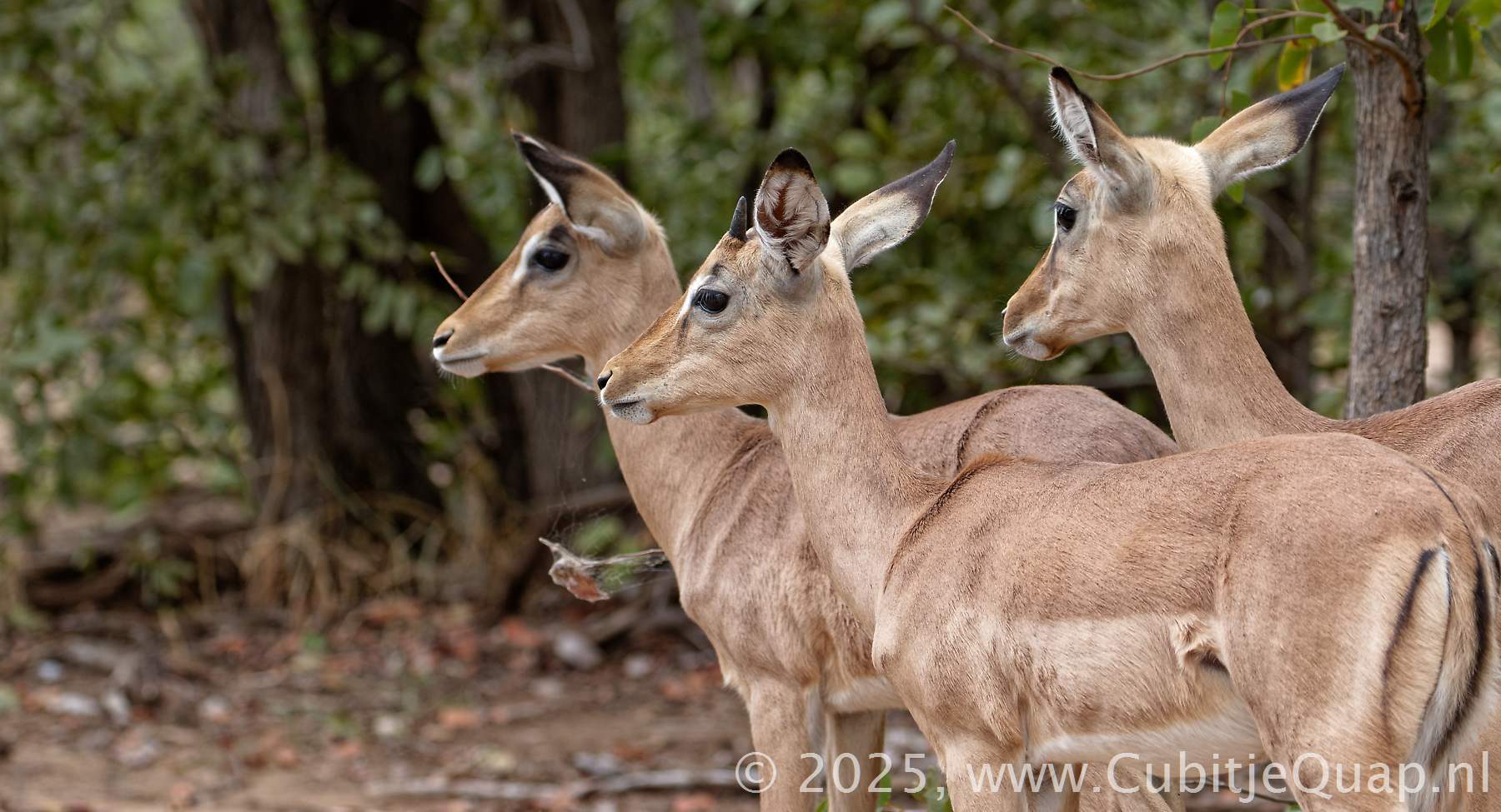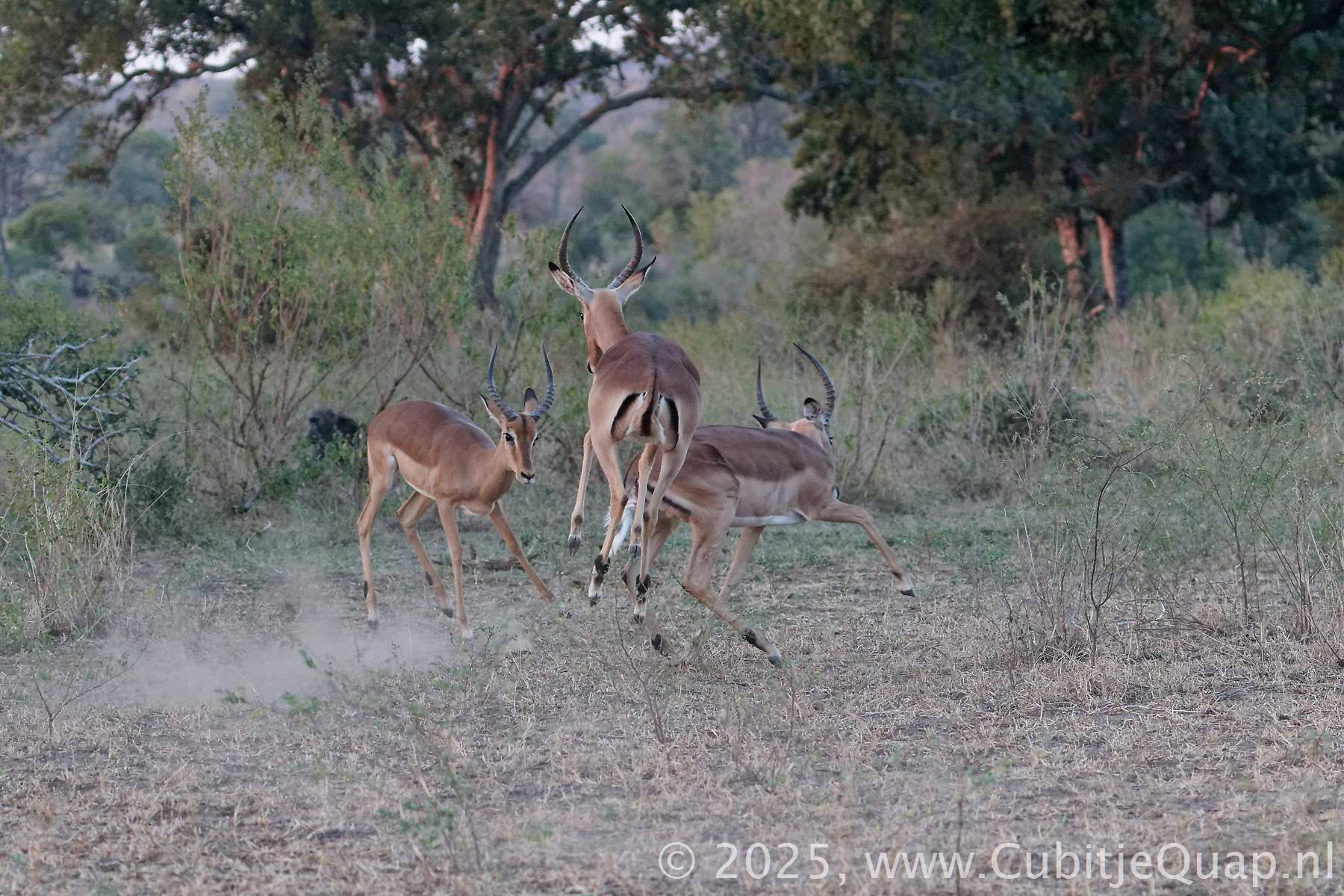 Rams are extremely vocal during the mating season and give vent to growls, roars and snorts. They are only territorial during the rut from January to May, spending the rest of the time in bachelor herds. The home range of a breeding herd, consisting of ewes and young animals, may overlap with the territories of several territorial rams. The rams separate harem herds of 15 - 20 ewes (with their young) for mating. This disrupts the composition of the herds but they reunite at the conclusion of the rut. Bachlor herds tend to occupy areas away from the breeding herds. Impala are active mainly during the cooler daylight hours but there is some nocturnal activity.