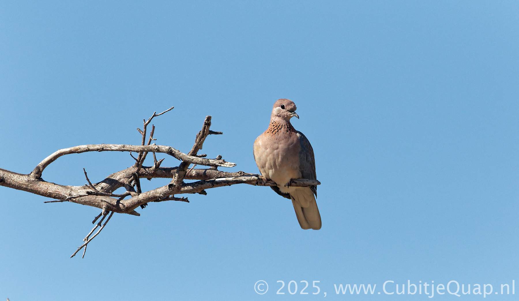 This species may be distinguished from the larger Cape Turtle-Dove by the lack of a black hind collar, by the diagnostic, black-speckled necklace across its cinnamon breast, and by its cinnamon-coloured back. In flight, the blue-grey forewings contrast conspicuously with the cinnamon back, and the white tip and sides of the tail are obvious.