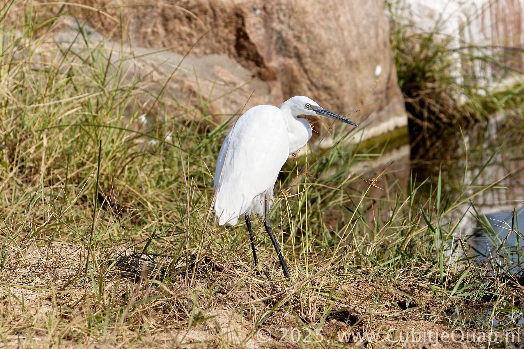 The black legs and contrasting yellow toes differentiate this species from any other white heron in the region. The bill is slender and black. It feeds by dashing to and fro in shallow water in persuit of prey. It ususally forages alone, and is only gregarious when breeding. Breeding birds have mauve lores and black eyes.