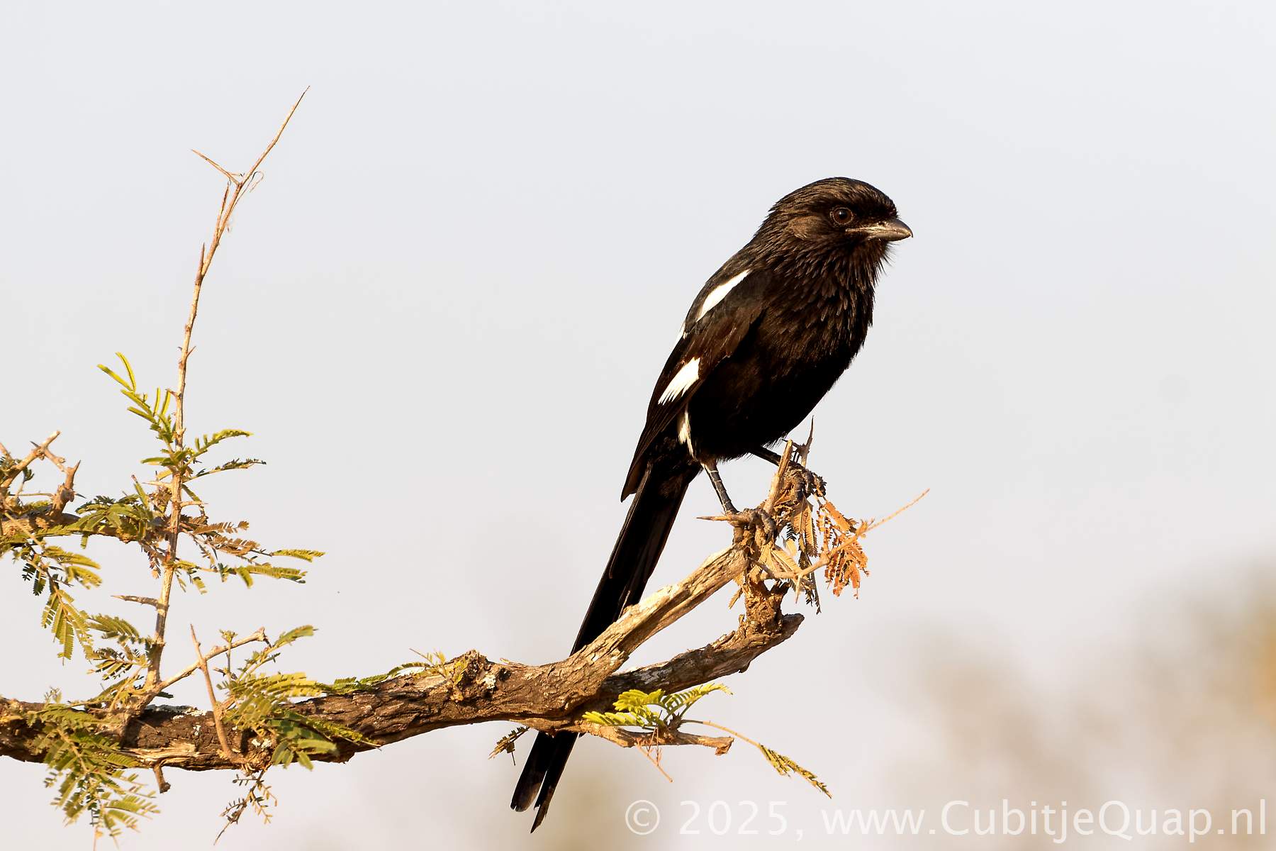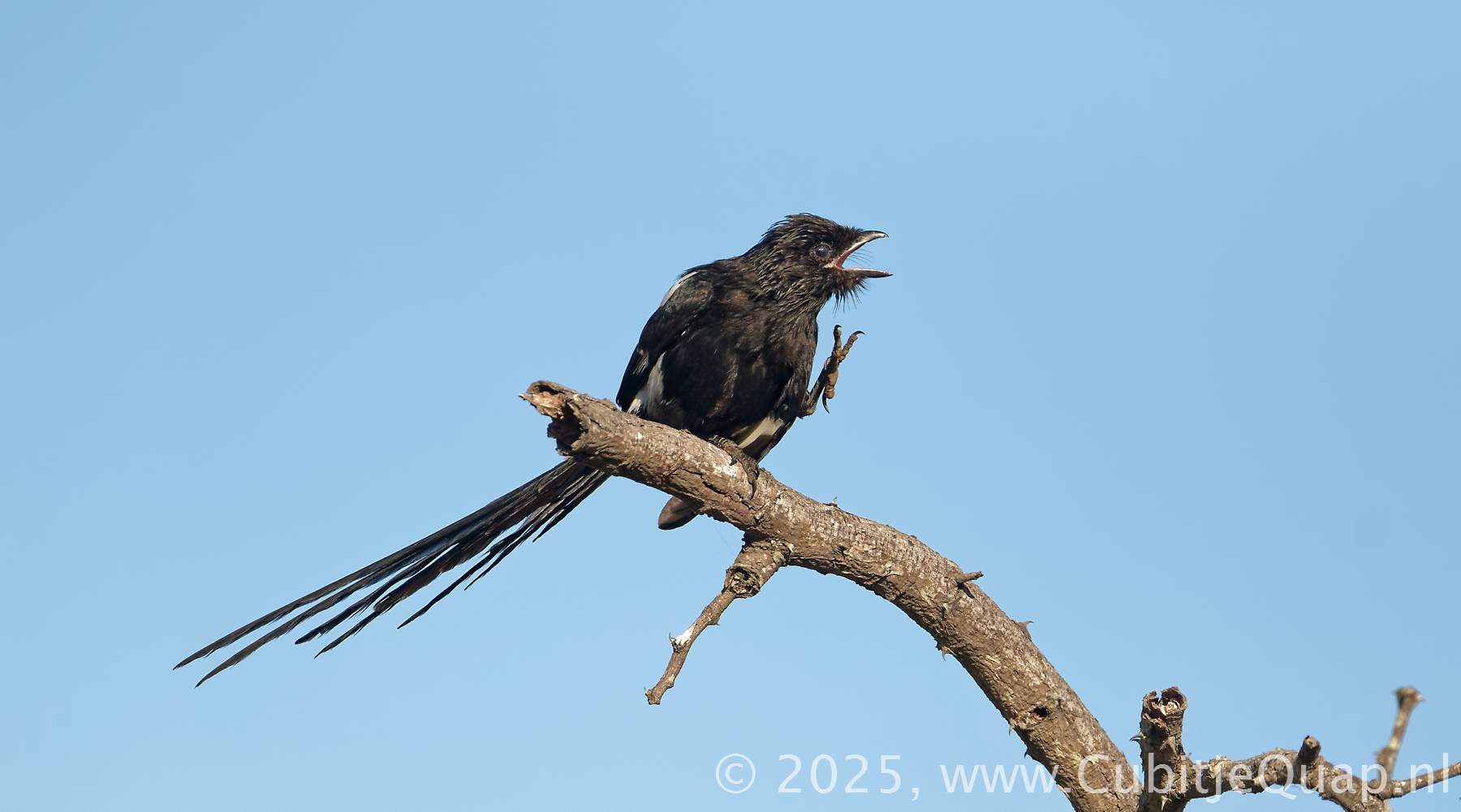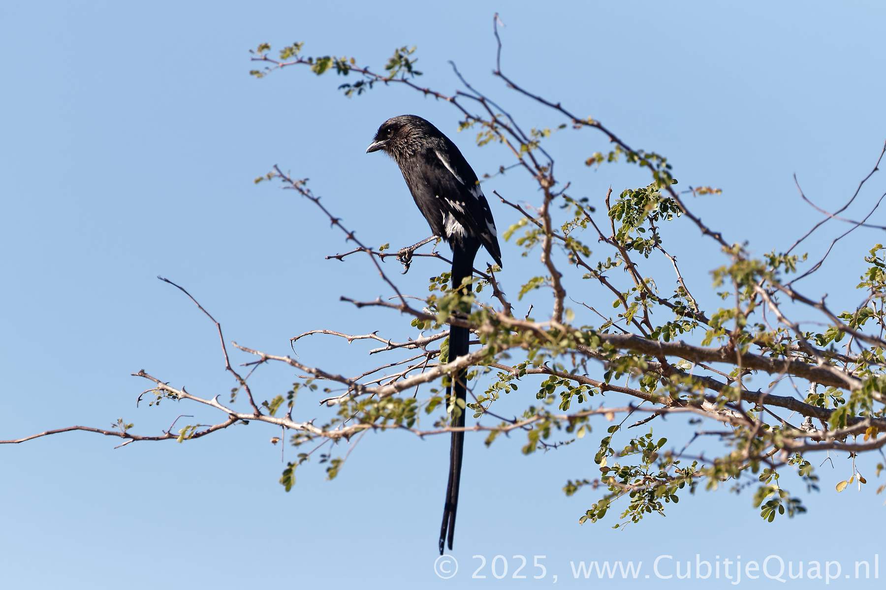 The combination of the black-and-white plumage and very long, wispy tail is diagnostic. Gregarious, it typically occurs in groups of four to eight birds.