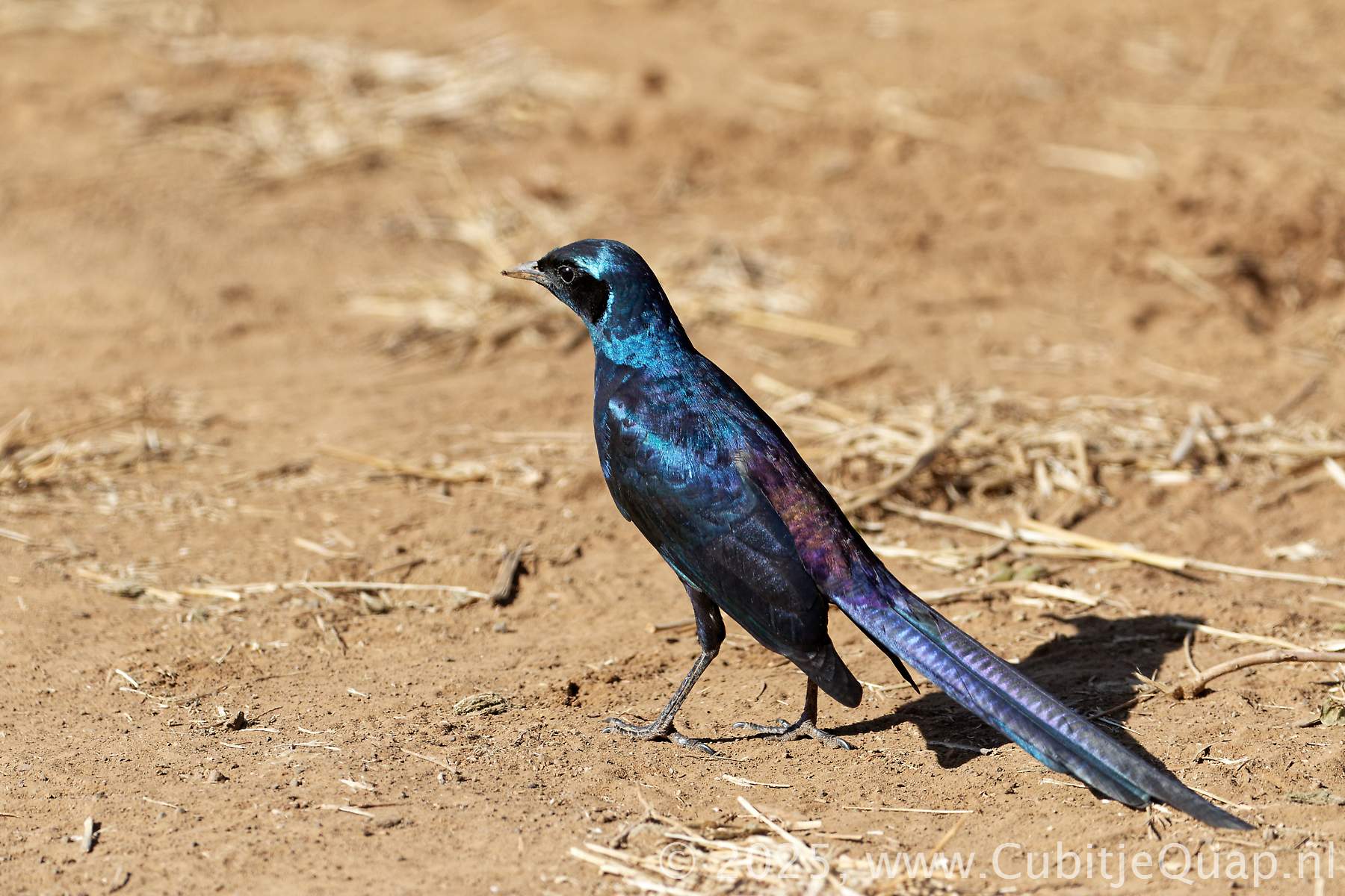 The long, pointed tail is diagnostic. Although similar, this species is a smaller bodied, more compact bird than Burchell's Starling. These are the only two glossy starlings with dark eyes (in adult). Usually in groups.