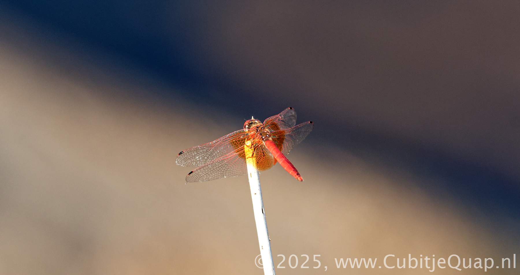 Small to medium sized, bright orange red dragonfly, with diagnostic large orange splashes on all wings.