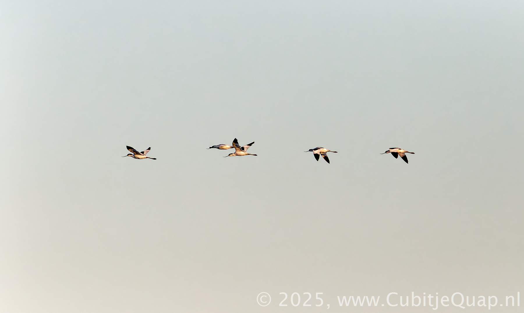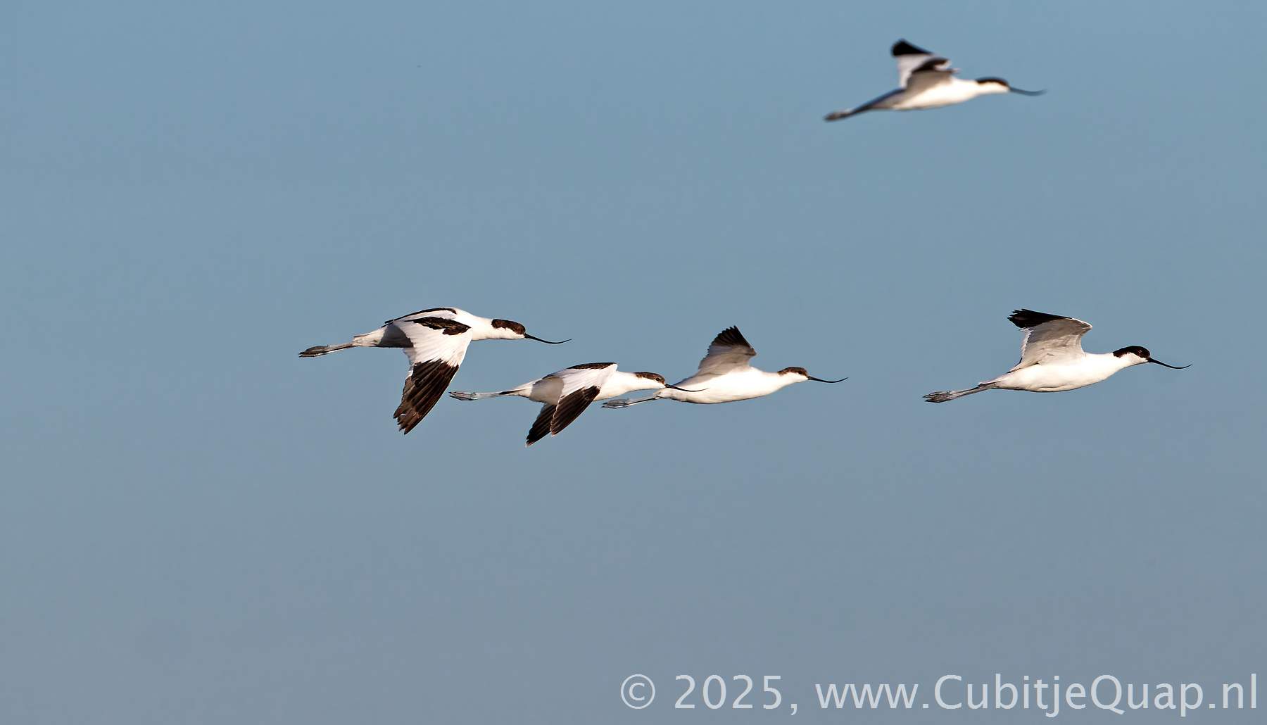 An unmistakable black-and-white wading bird with a long, very thin, upturned bill and a black cap and hindneck. In flight, the pied pattern is striking, with three black patched on each upperwing. The underwing is black only at the tip. The long, bluish grey legs extend beyond the tail in flight.