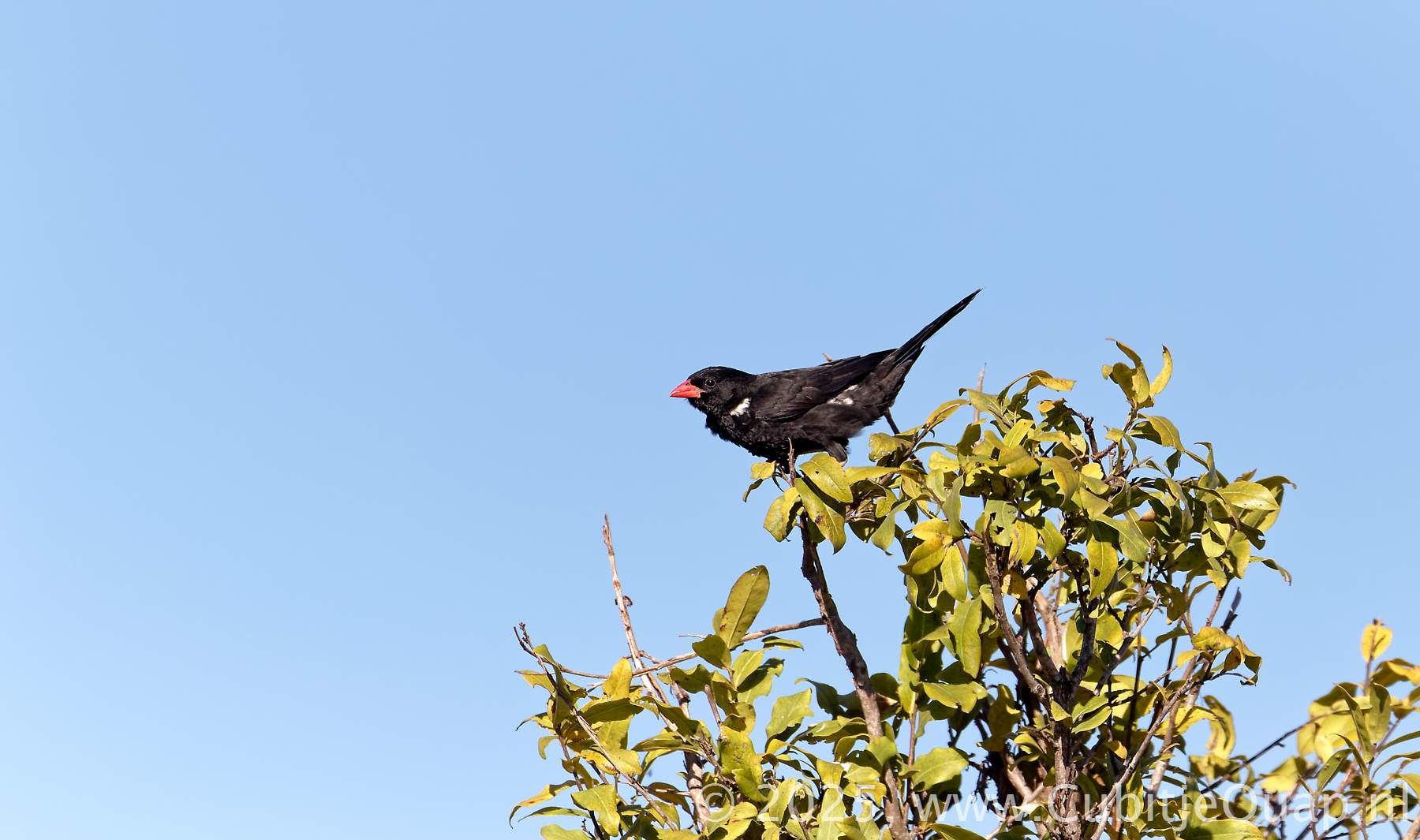 The robust red bill, black plumage and white wing pactches are diagnostic of this large weaver. In flight, it might be mistaken for Pale-winged Starling but the chunky red bill should eliminate confusion.