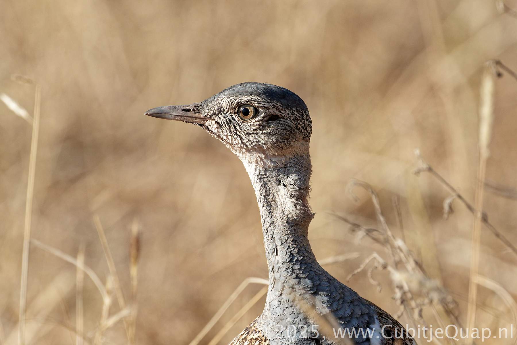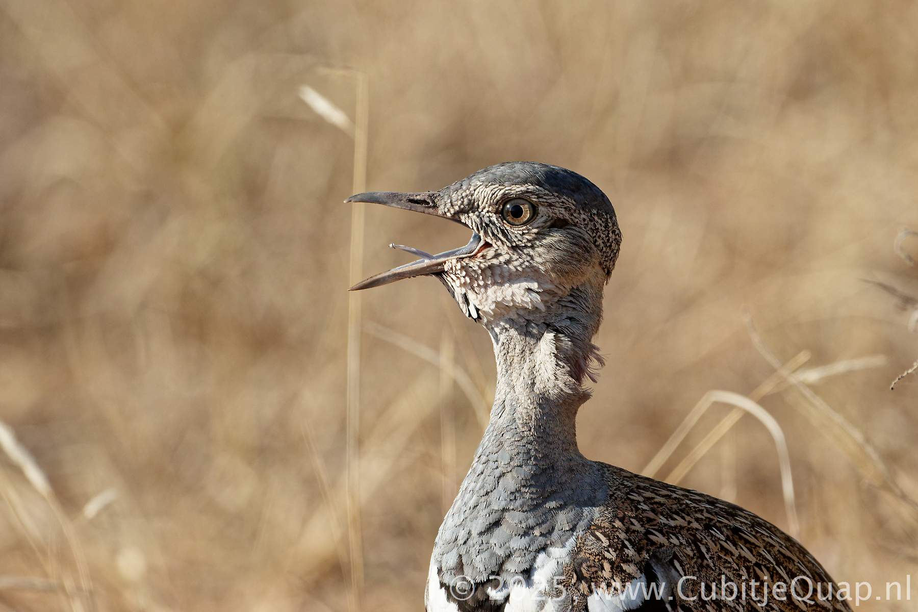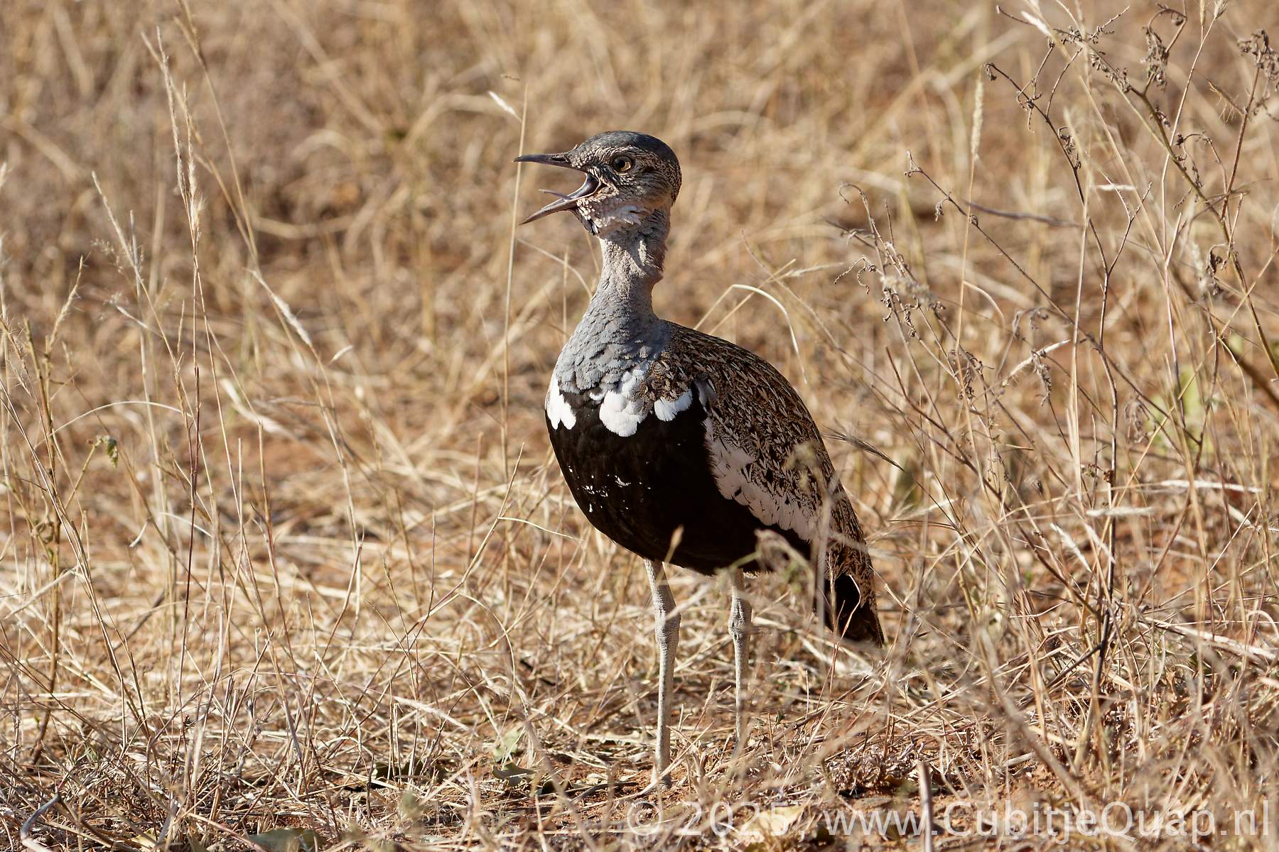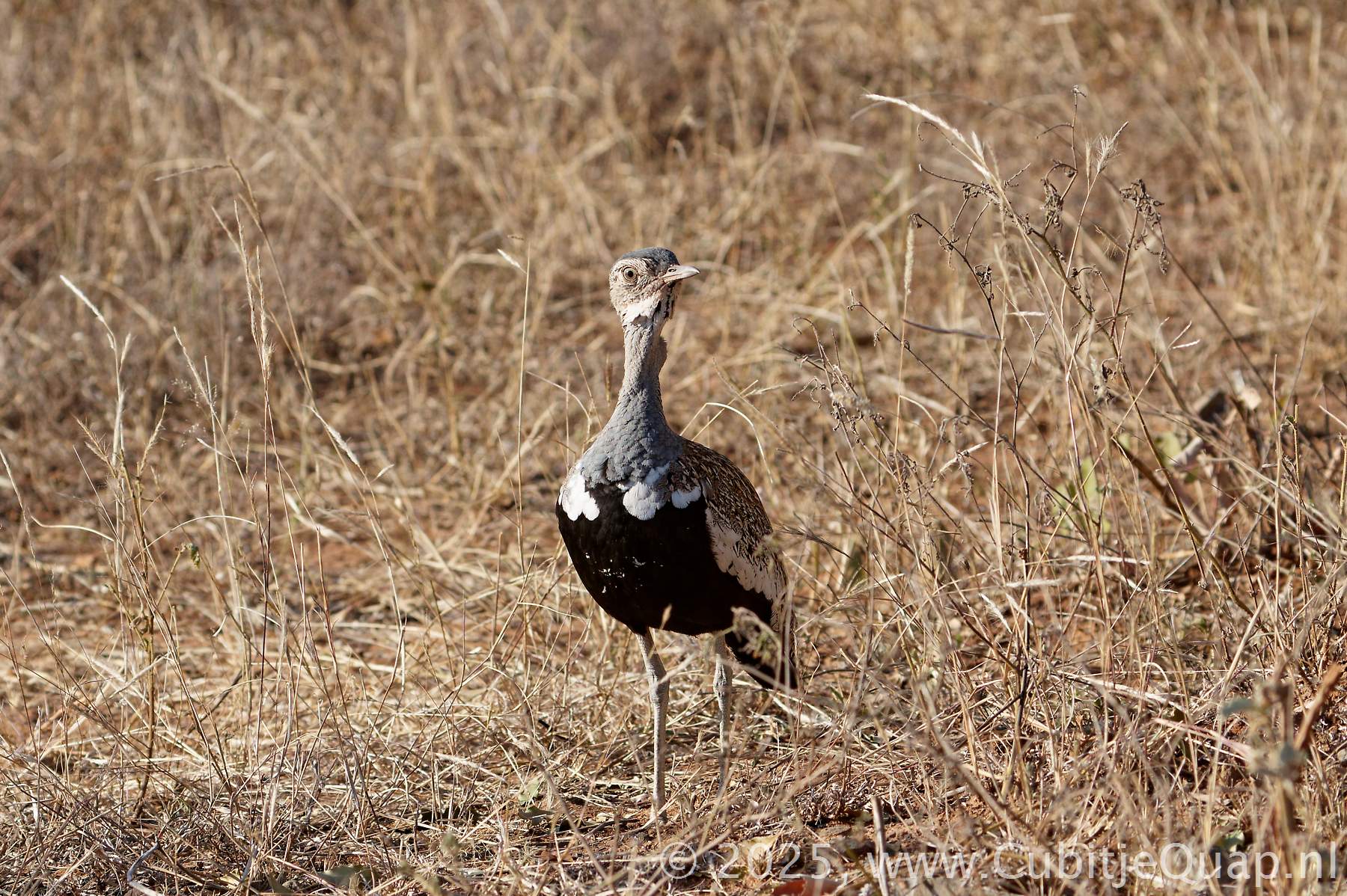 Male, in courtship display, flies straight up, then suddenly tumbles and plummets towards the ground before gliding off and settling. Female has a mottled brown crown and neck. It is readily distinguished from female Northern Black Korhaan by the chevron-shaped markings (not barring) on the back. Juvenile resembles female.