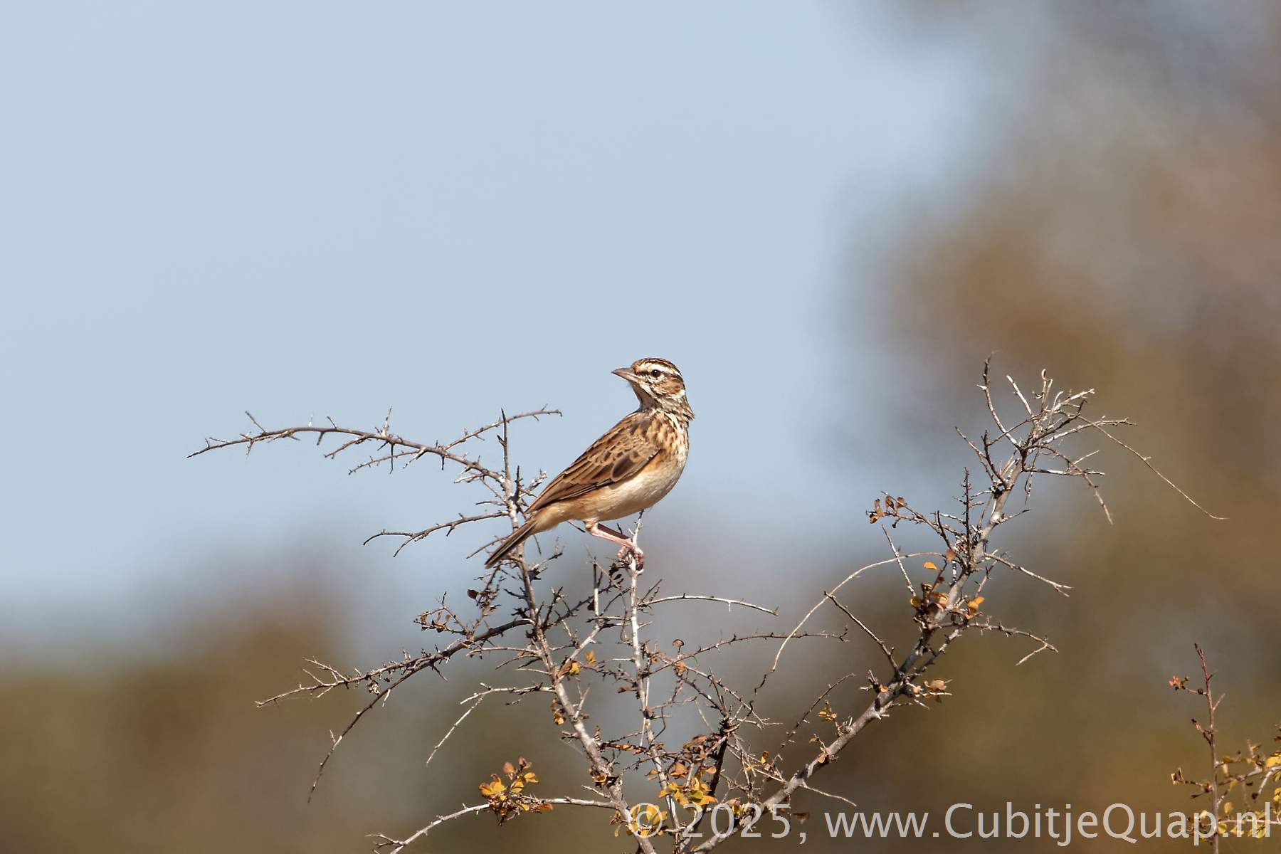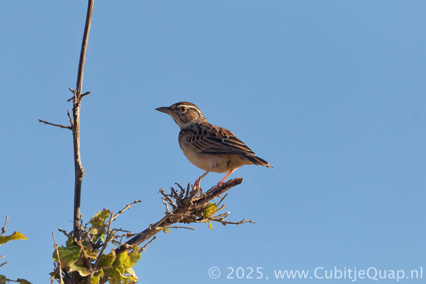 Colour varies regionally, but this species is consistently boldly marked above and below and lacks rufous in the outer wing. The bill is short and dark (the lower mandible being paler), and a straight, white eye-stripe runs from the base of the bill to the nape, giving the head a capped appearance. The bill size decreases from west to east. large-billed race [F2]naevia[/F2] in west treated by some as a full species (Bradfield's Lark).
