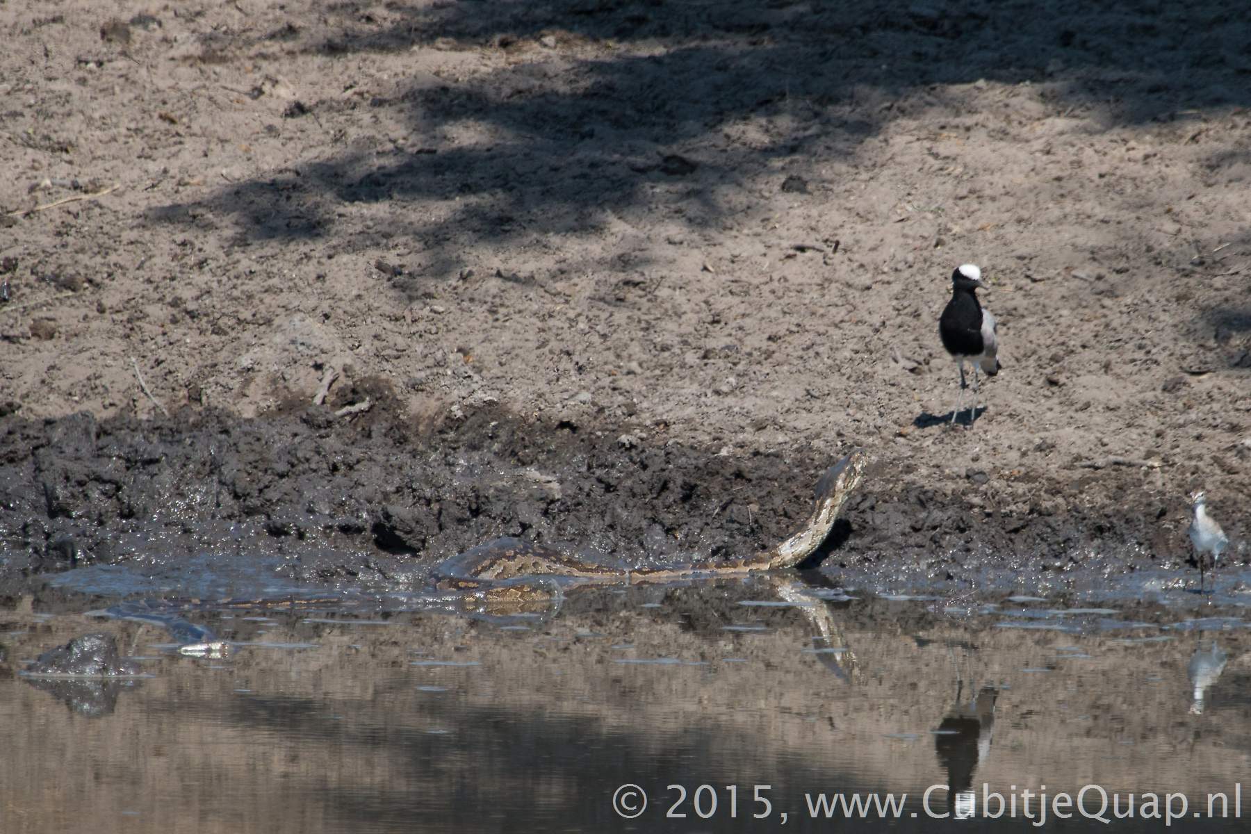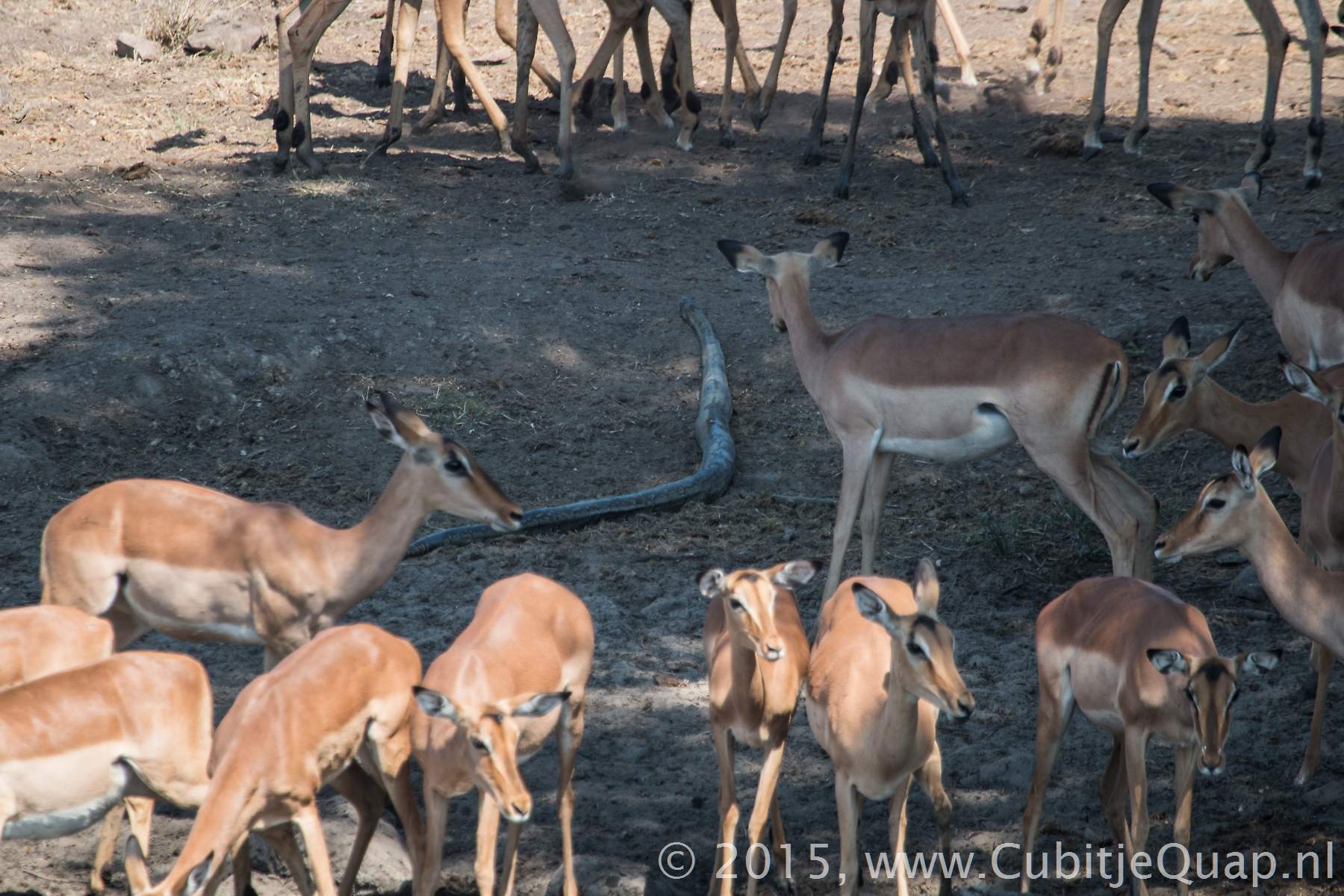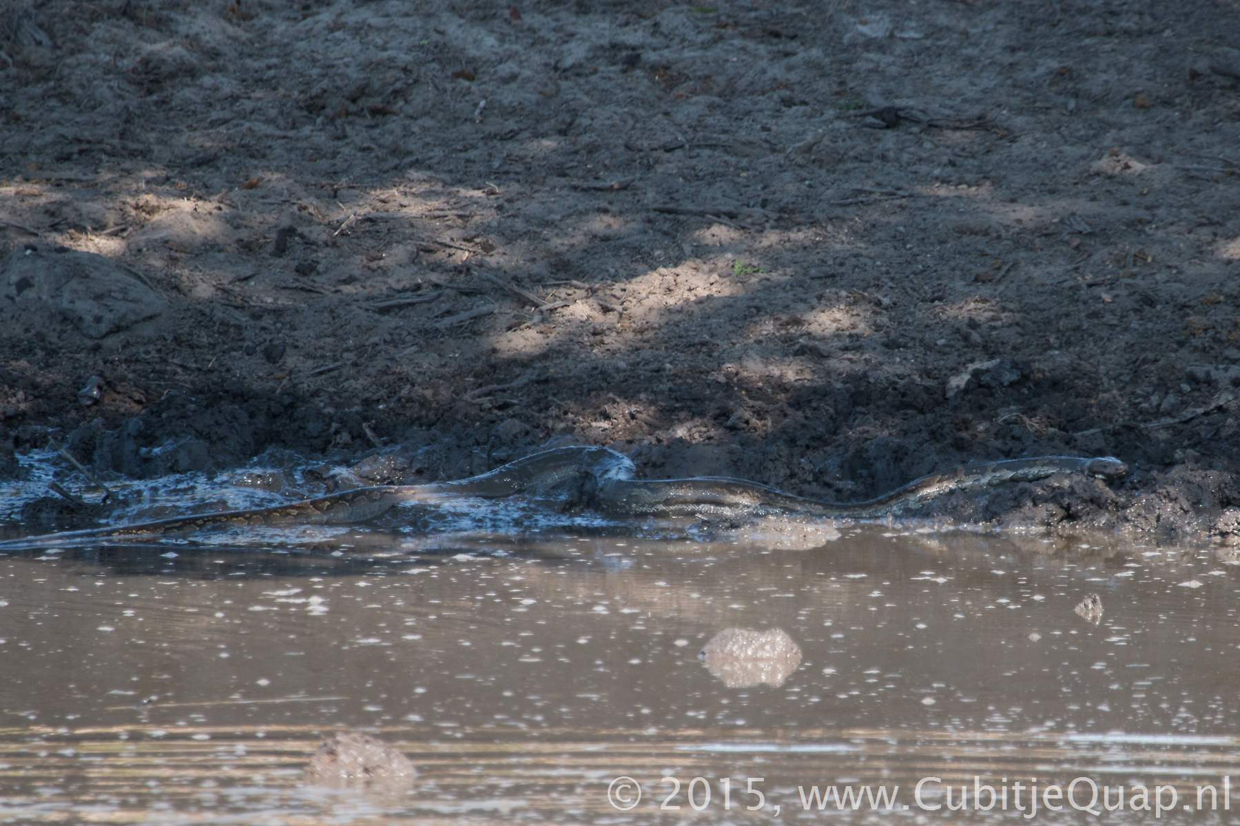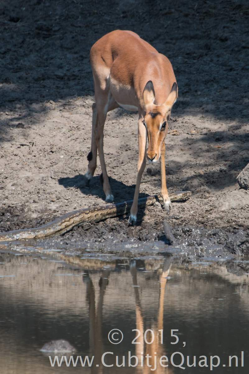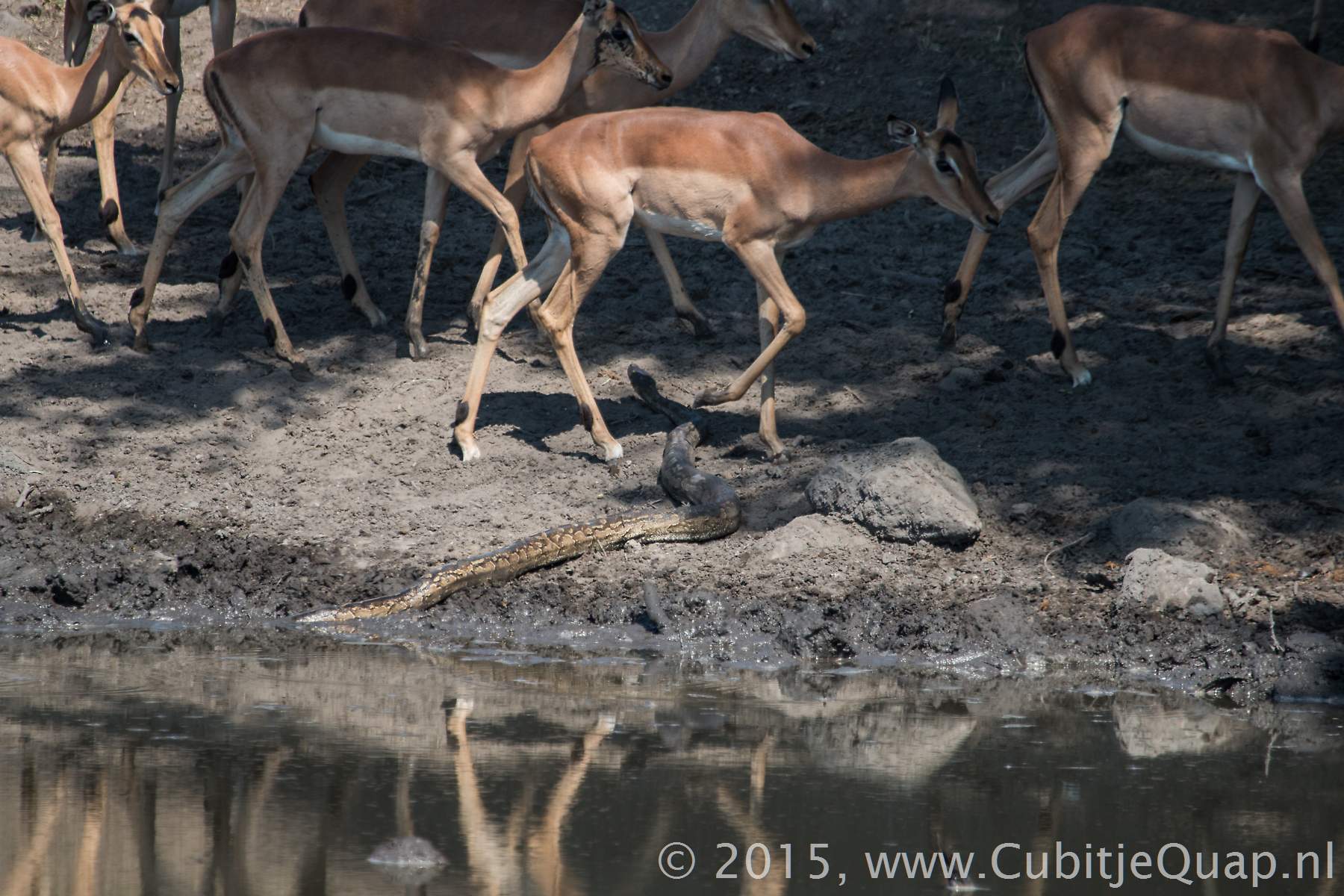 They often bask, especially after feeding, and they are fond of water in which they may lie and hunt. They may dive into deep pools and remain submerged for long periods. Prey is ambushed and constricted, usually at dusk or after dark. They can swallow very large prey, but are vulnerable to attack by wild dogs and hyenas when swollen with food. They may fast for long periods of time.