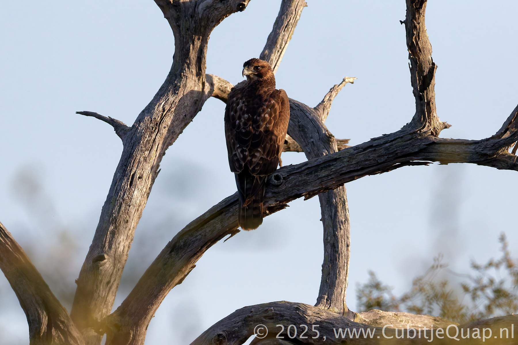 Very variable in colour, from buff to dark brown, occasionally all-white or having mixed light and dark plumage. The flight shape is diagnostic, with long, straight-edged wings and a long, narrow, square-ended tail. Pale-form birds could be confused with pale-form Booted Eagle but differ in flight shape and by the long pencil-thin tail, as well as in having more white on the head. At rest it shows a small, pointed crest.