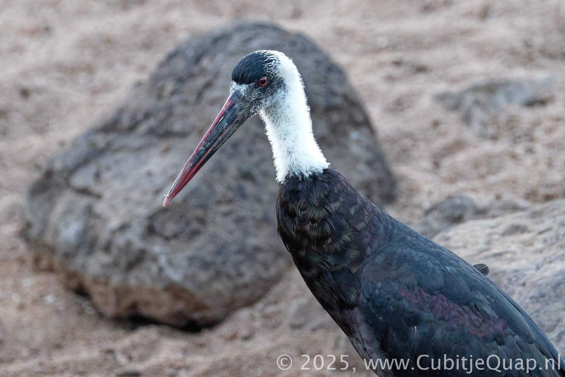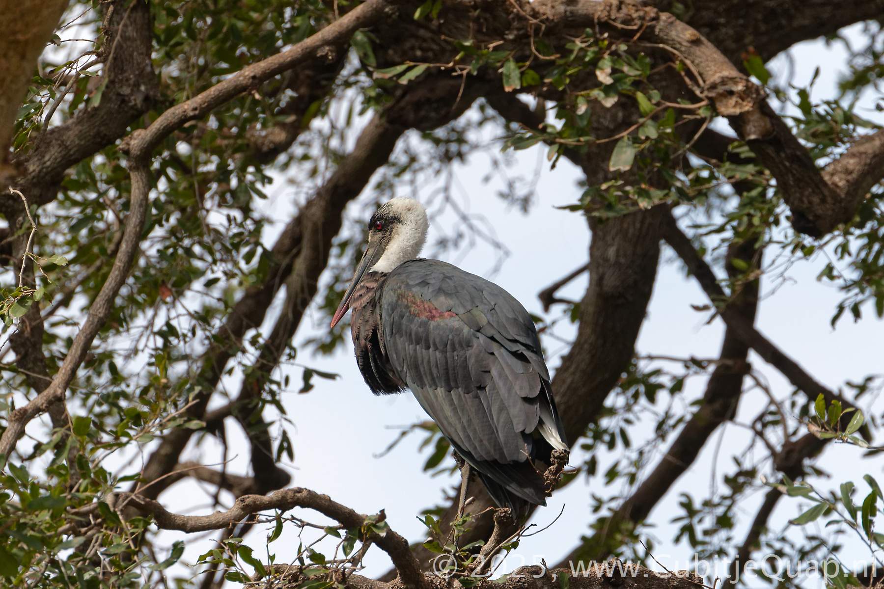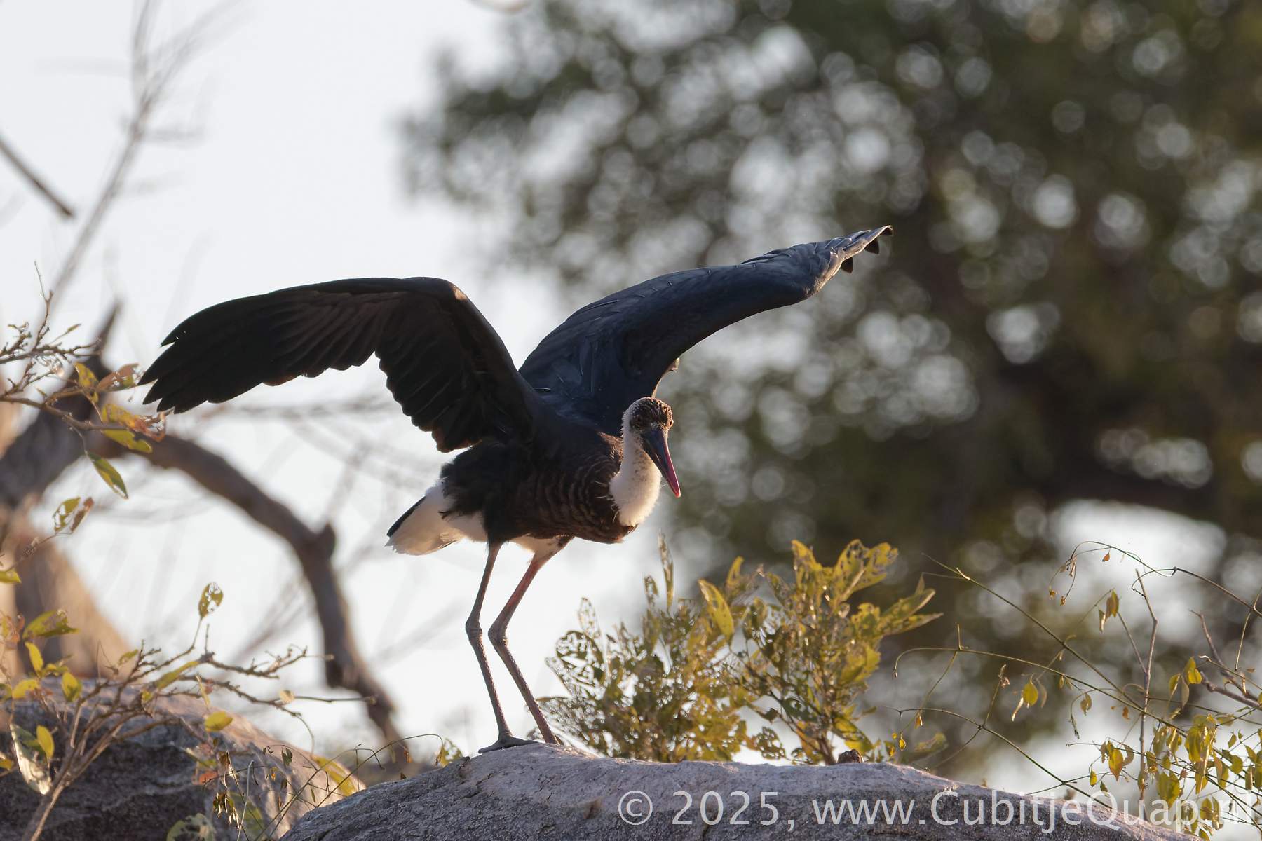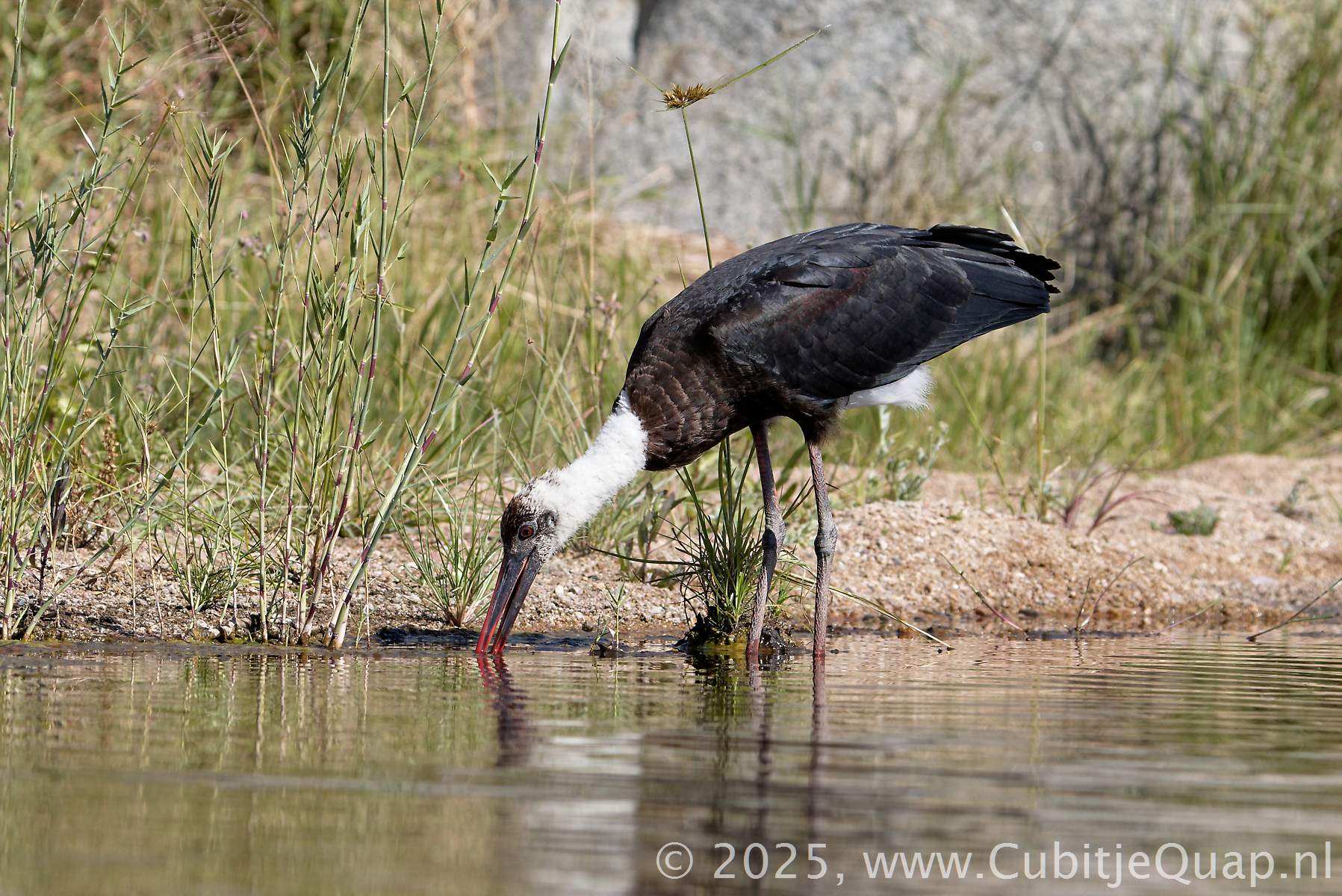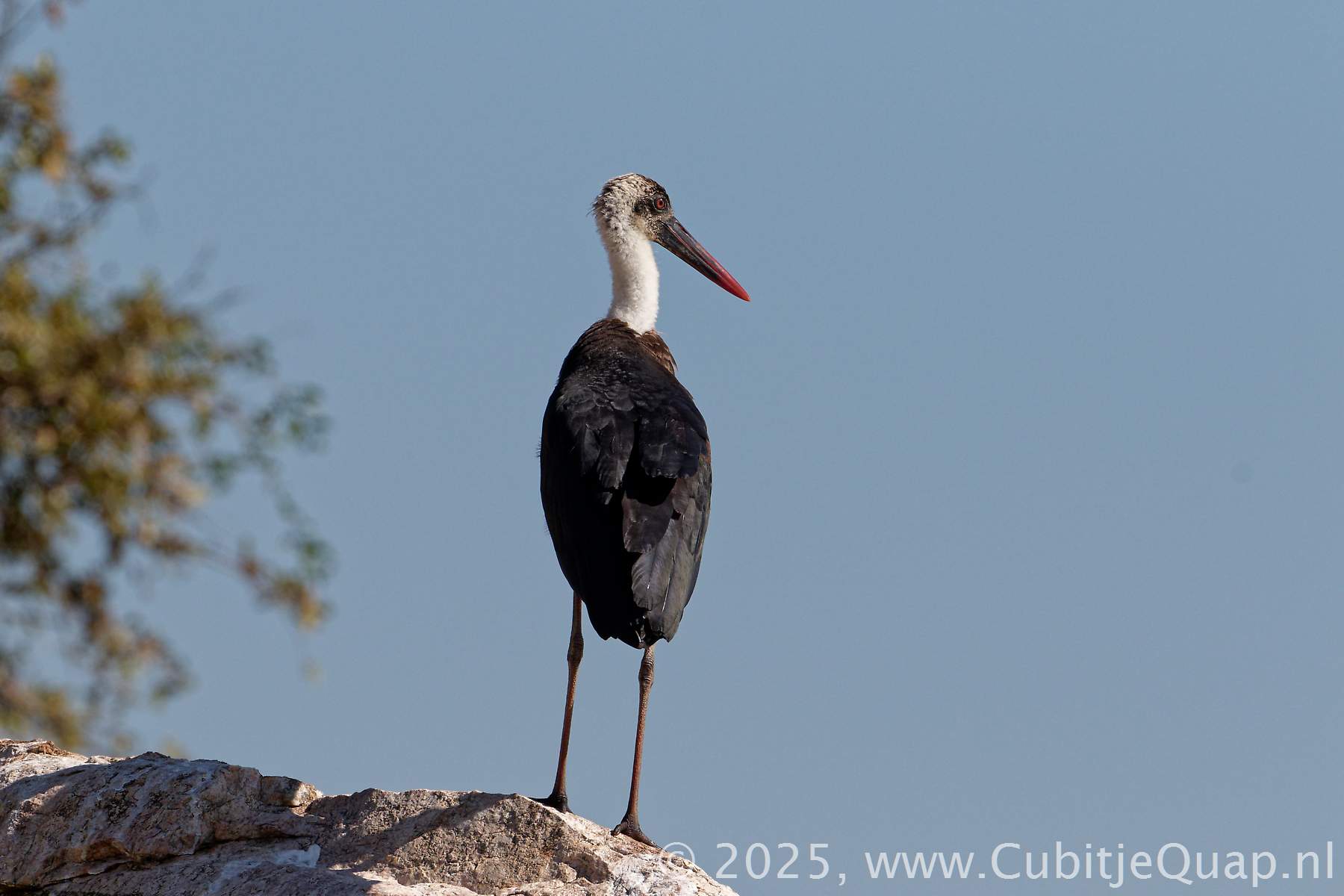 The combination of the glossy black plumage, white woolly neck, and white belly and undertail are distinctive.