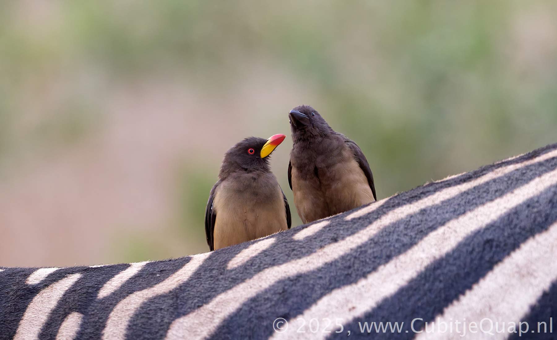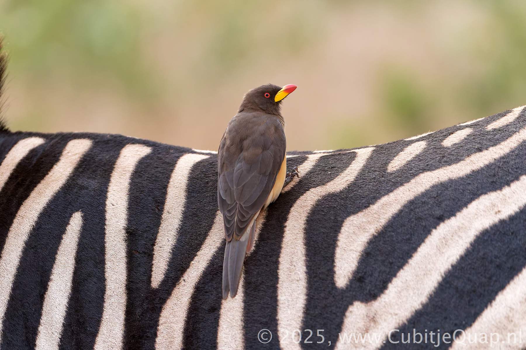 Paler than Red-billed Oxpecker and easily identified by its bright yellow bill with a red tip, as well as by the pale lower back and rump.