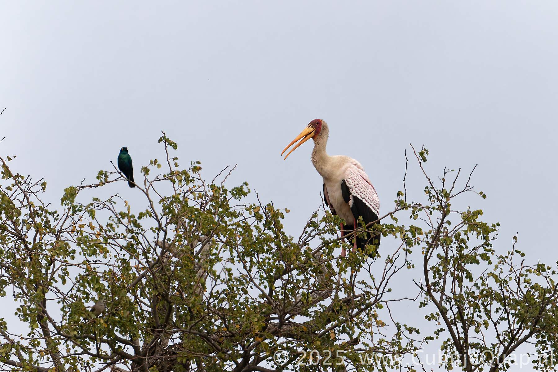 The very long, slightly decurved, yellow bill is diagnostic. During the breeding season the naked facial skin is red and the wing coverts and back are tinged with pink. In flight it appears similar to White Stork but differs in having a black tail.