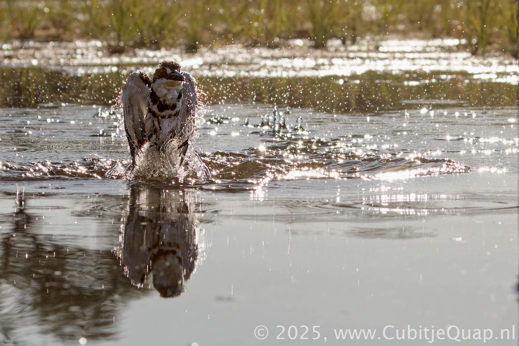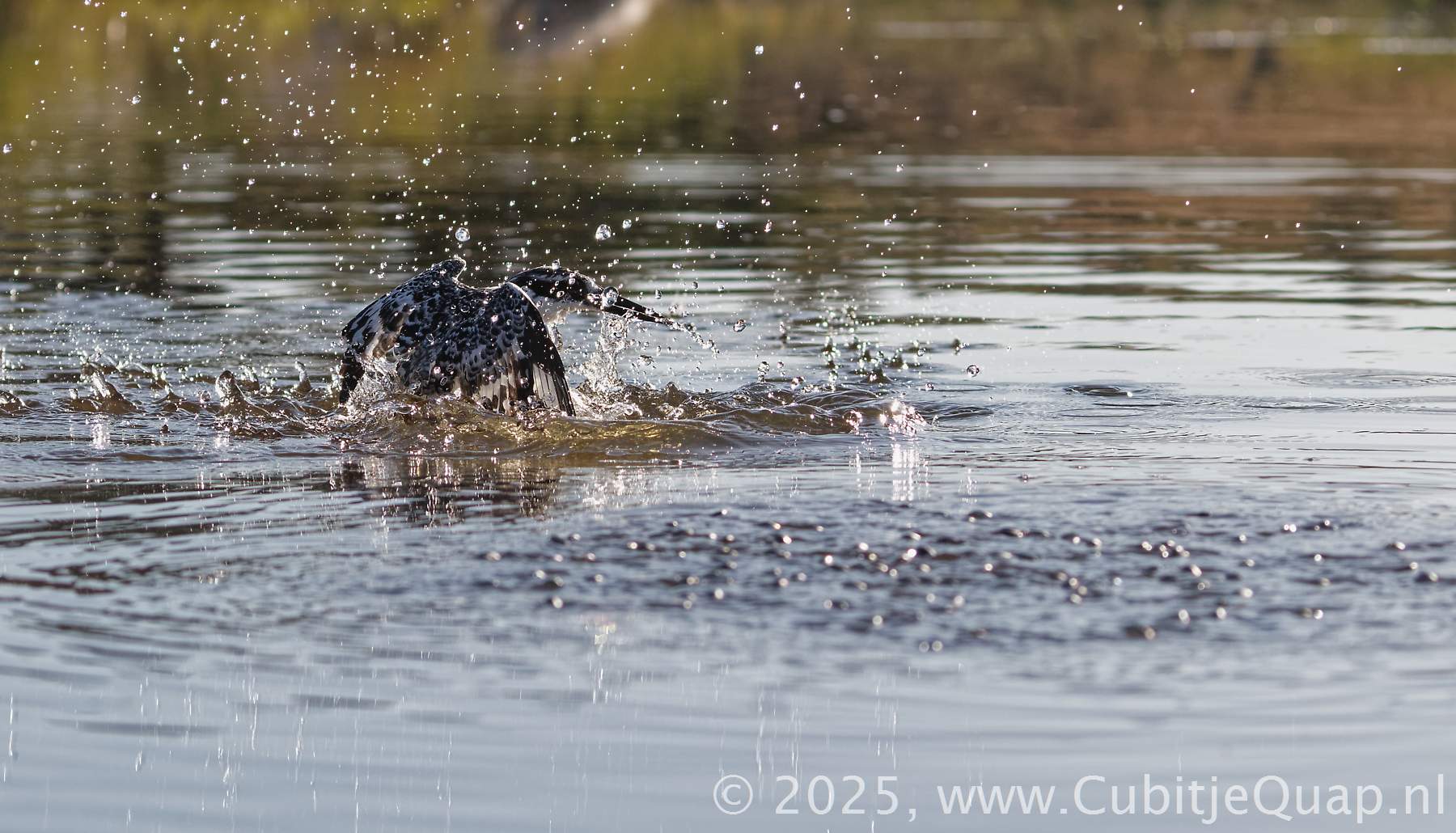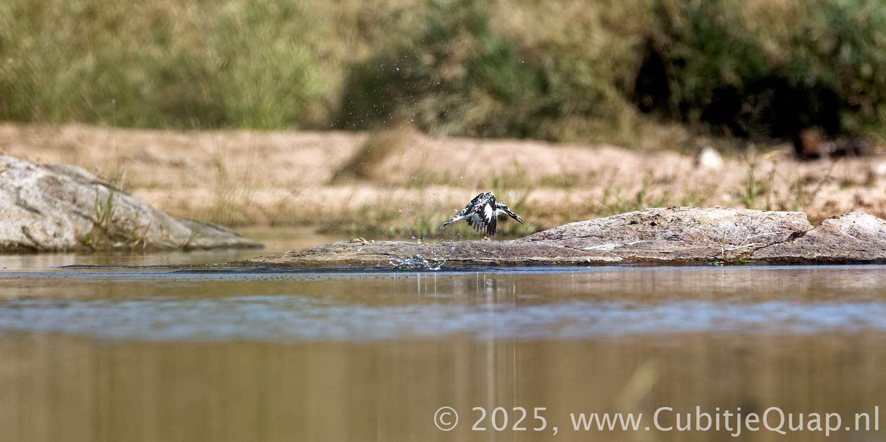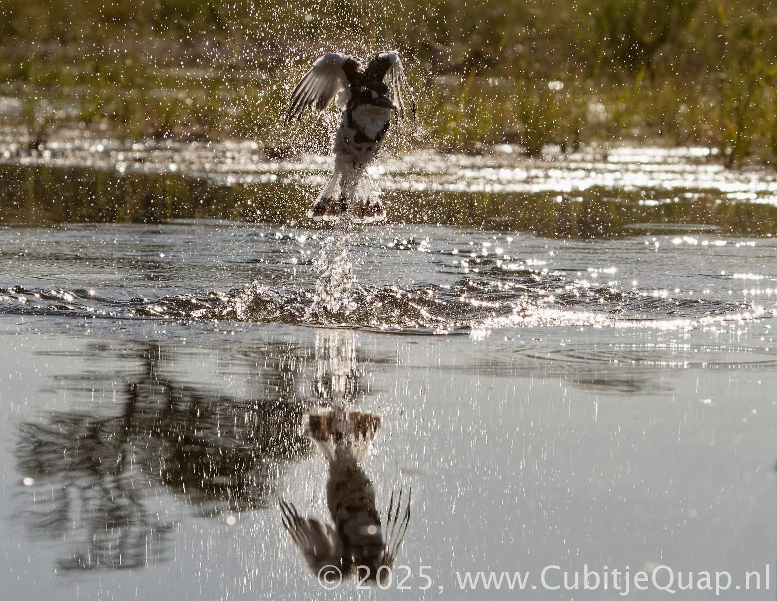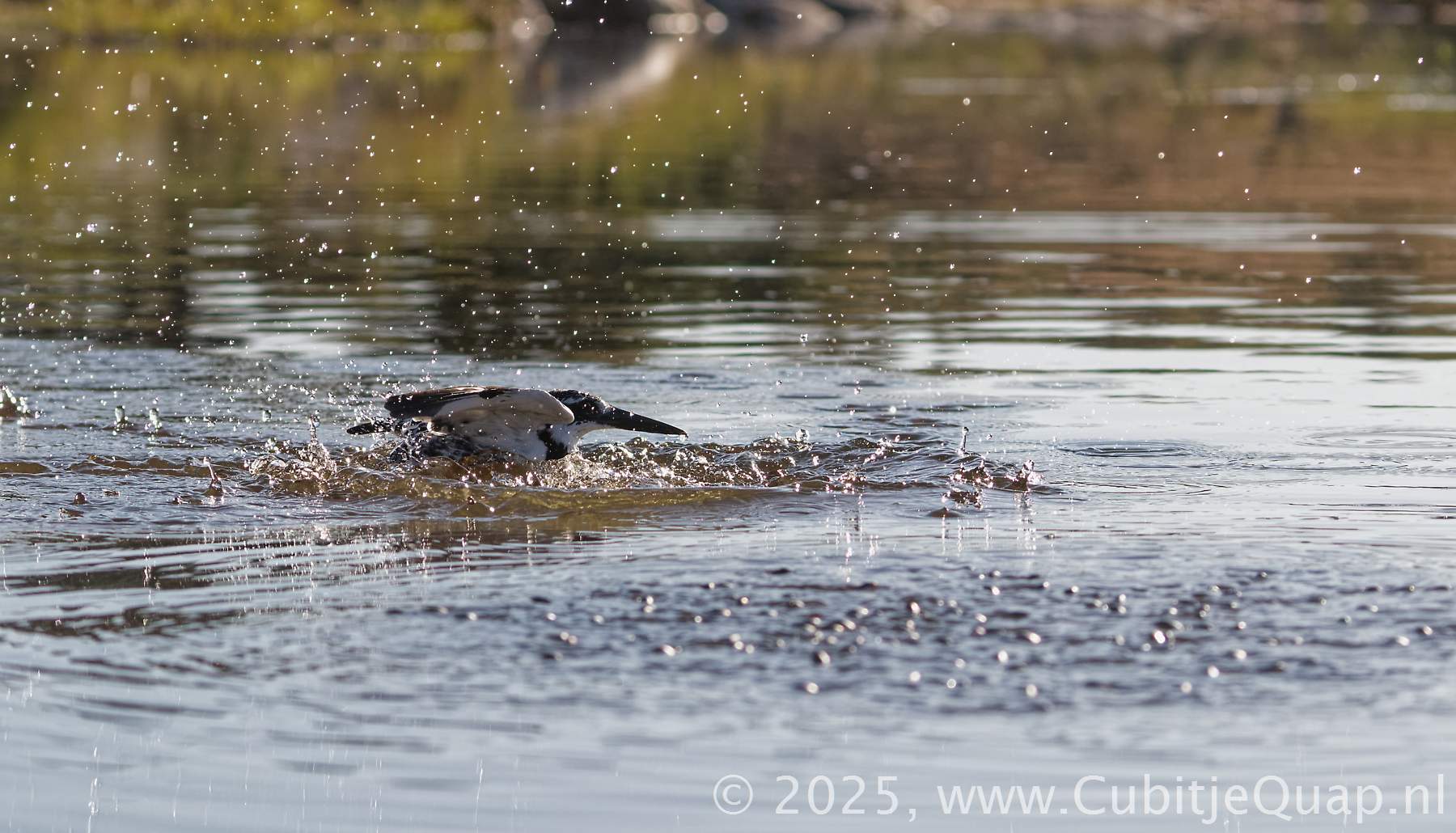 It fishes by watching for preys from a perch, bobbing head and flicking tail, and then by diving into the water making shower of water, and appearing again with its prey in the bill.