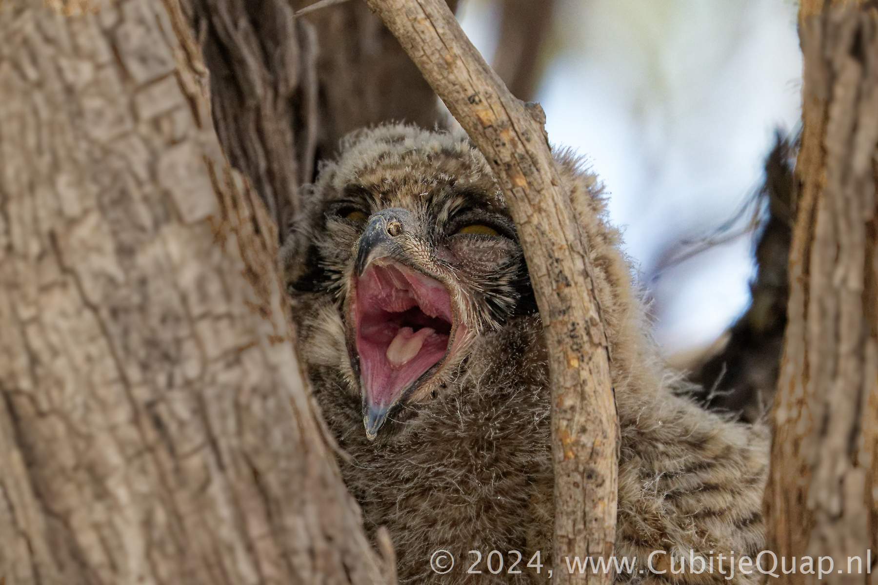 A pair of spotted eagle owls kept their chicks not on the ground, but in a tree near the chalets and campsites of Nossob camp in the Kgalagadi Transfrontier park.