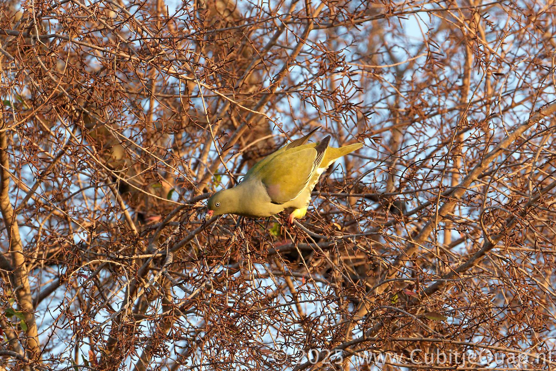 When seen clambering about in a tree, the immediate impression is of a green, parrot-like bird. At closer range, this species is unmistakable with its green, grey and yellow plumage and chestnut vent. When feeding, it climbs about in fruiting trees, sometimes hanging upside-down on branches to obtain fruit.