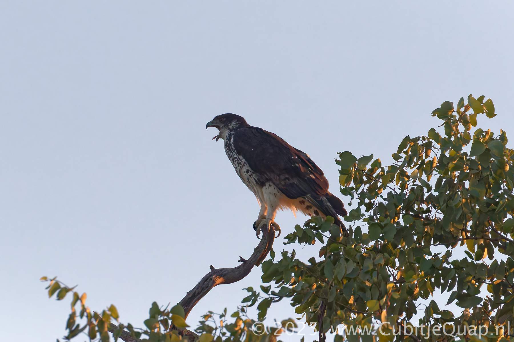 Adult likely to be confused only with smaller Ayres's hawk-eagle but is less boldly marked below and has white unpspotted thighs; in flight, the underwing is mainly white (it is dark and heavily barred in Ayres's hawk-eagle), and the upperwing is dark brown., with distinctive white panels at the base of the primaries (Ayres's hawk-eagle has a uniformely dark upperwing).