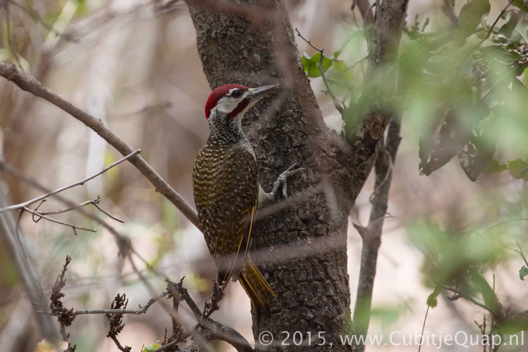 Male differs from all other woodpeckers in the region by having an all-red forehead, crown and moustacial stripes. Male of north-western race (buysi) has mostly unmarked, pale peach-coloured underparts.