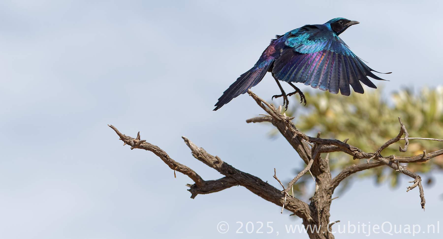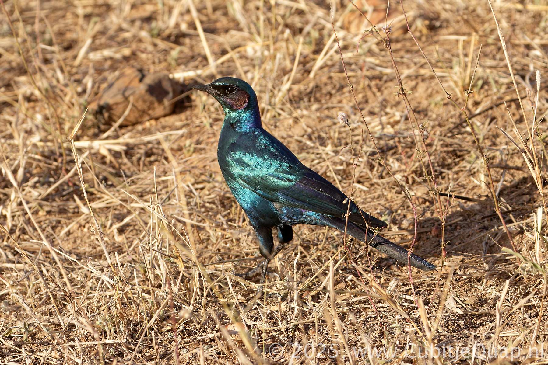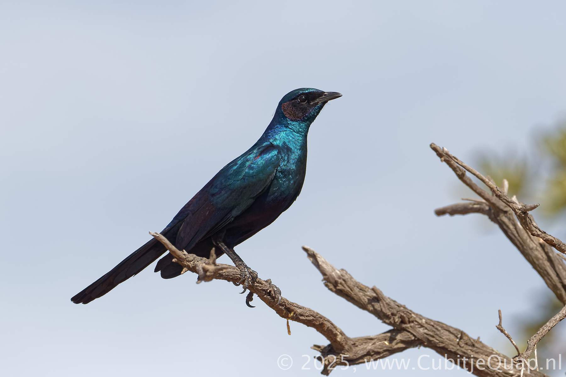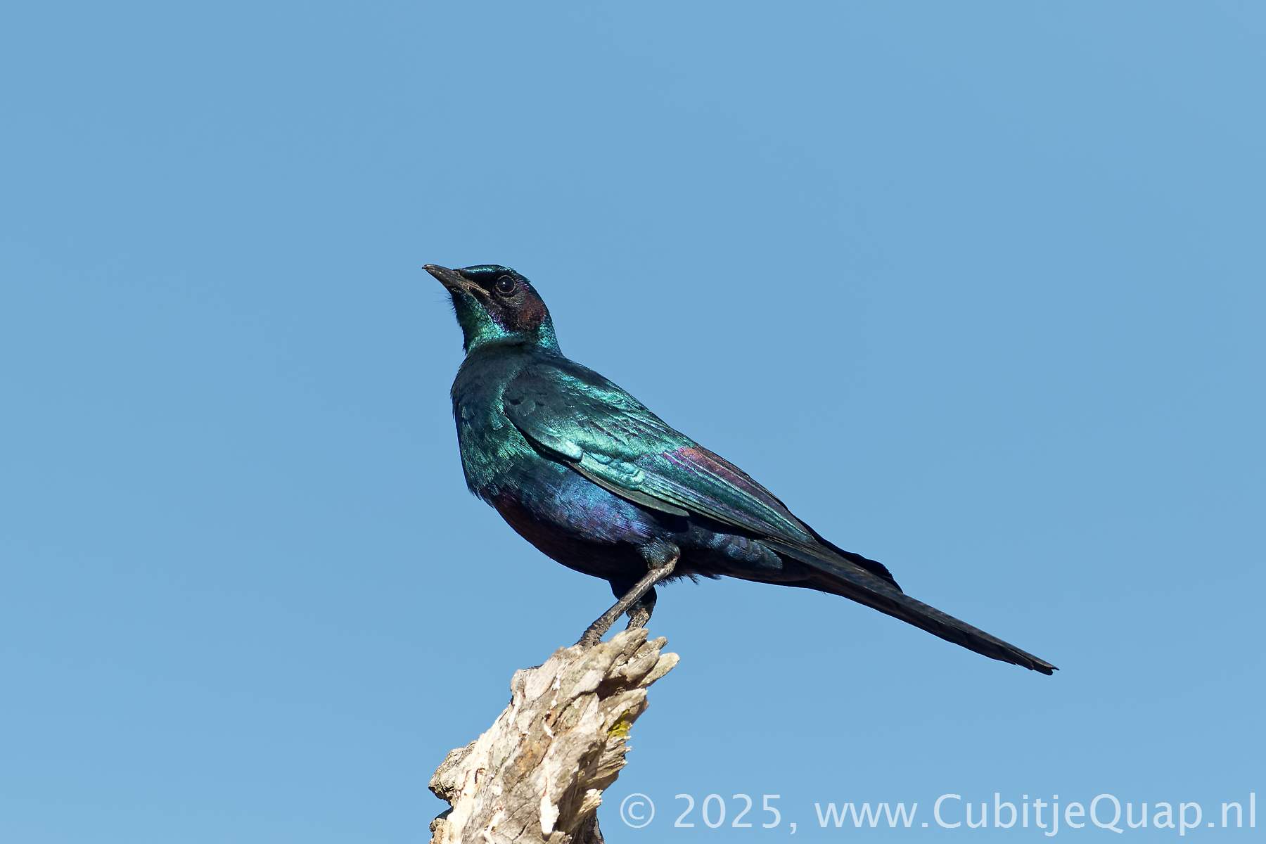 Larger and more heavily built than Meves's starling. This species has broader, more rounded wings and a shorter, broader tail, although the tail is proportionally longer than that of other, smaller, glossy starlings.