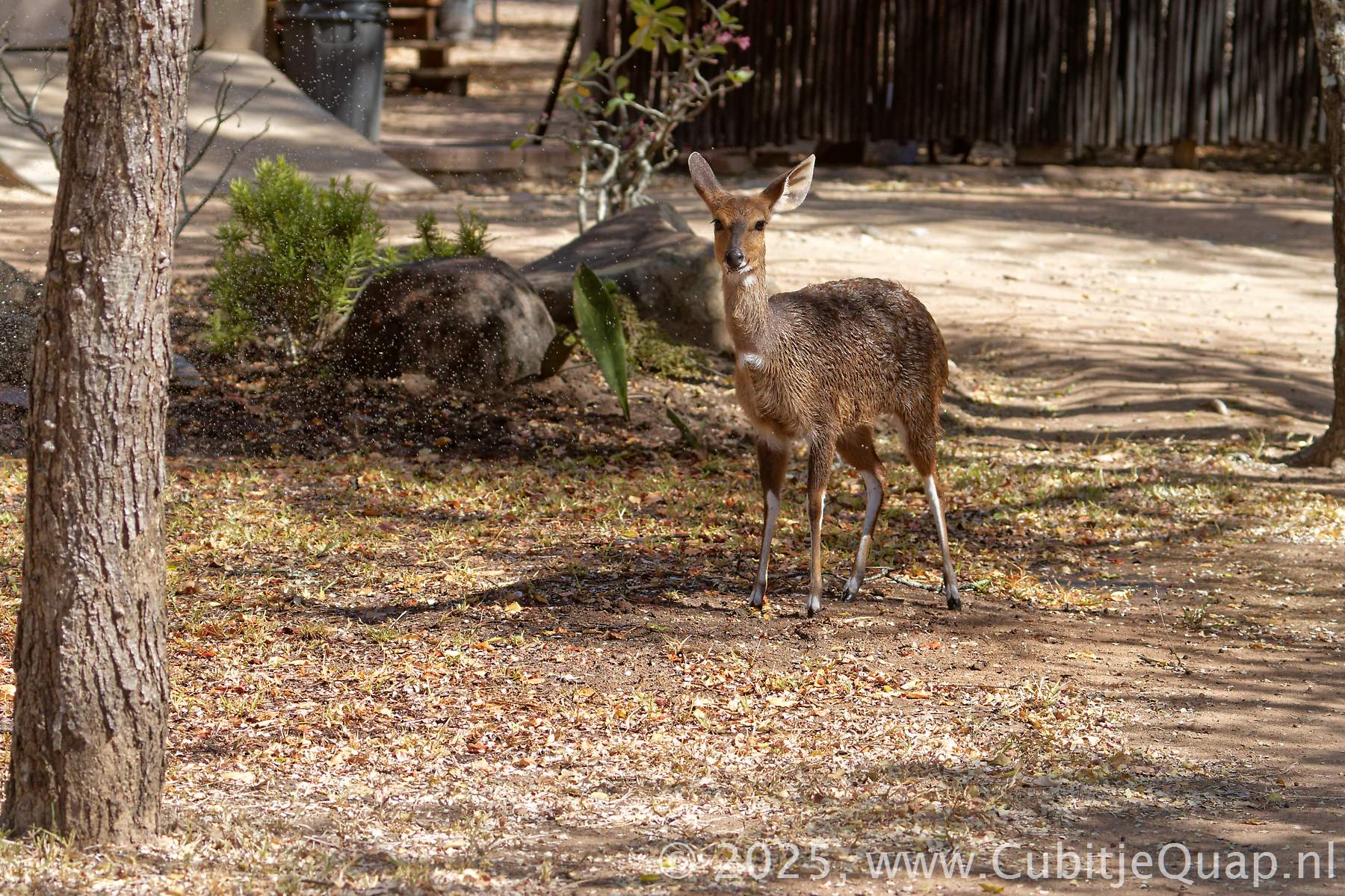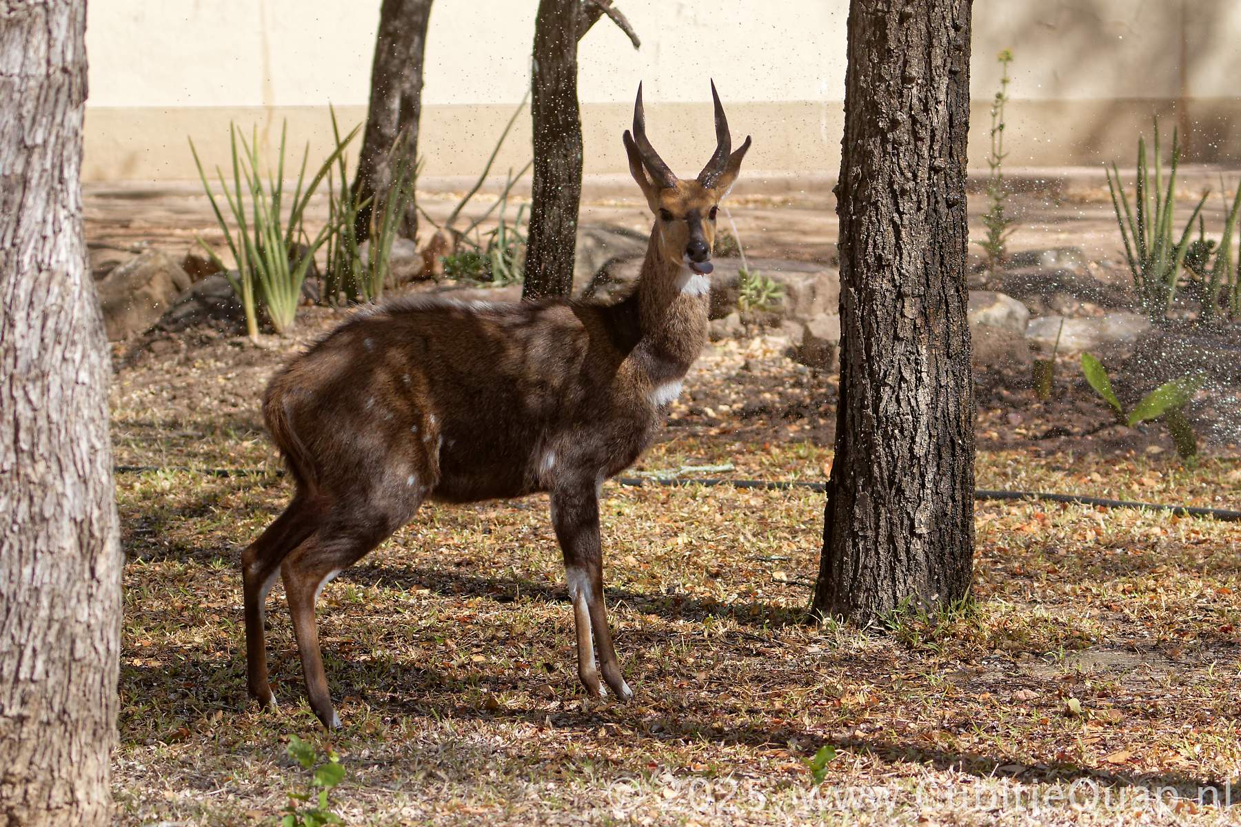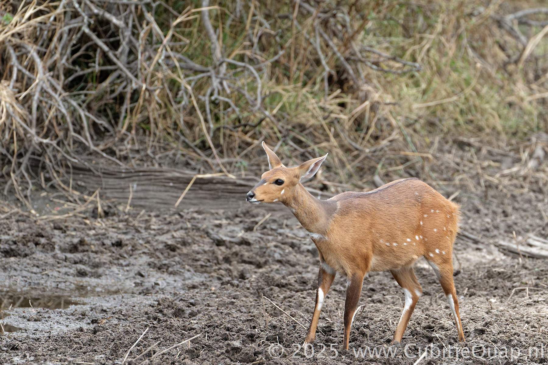 Small bright-chestnut to dark-brown antilope; those in the north of the subregion more brightly coloured and clearly marked than those from south. Nevertheless, considerable variation in colour and markings even within one population. Patterns of white lines and spots are present on the flanks to a greater or lesser extent, more so in the north. No white band or chevron between the legs as in sitatunga, nyala and kudu, but there are two white patches on throat. Crest of longish hair down back of ram but only raised when it displays or threatens. Bushy tail white below and dark brown above. Only ram has horns; they project backwards with a single spiral and have a prominent ridge along edge. Can be extremely sharp poited in young rams.